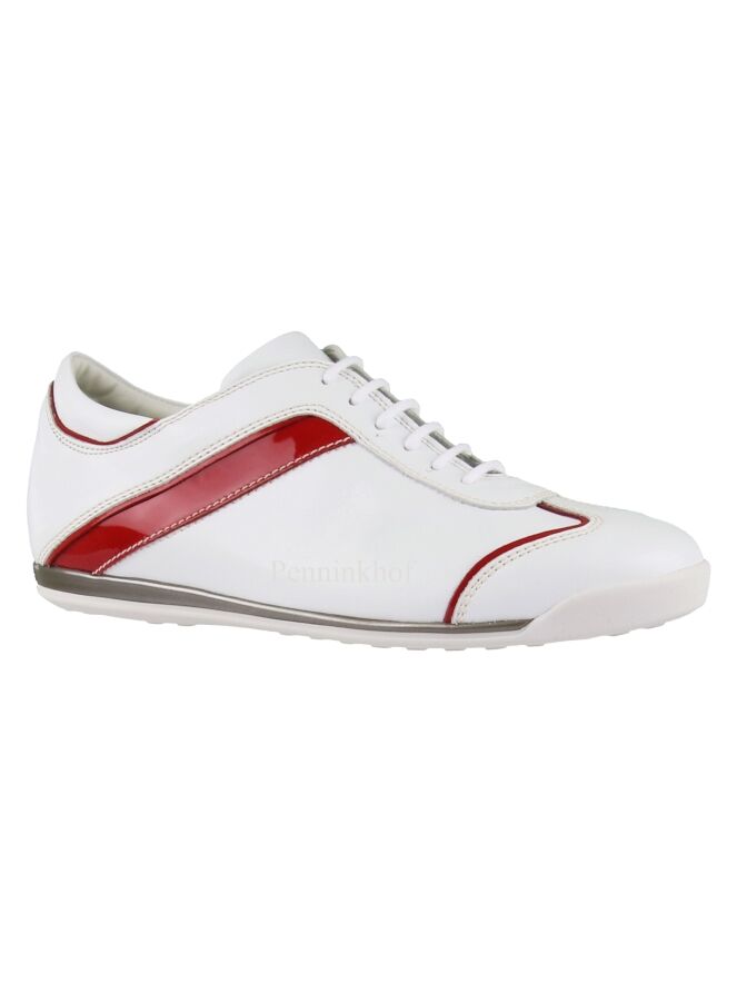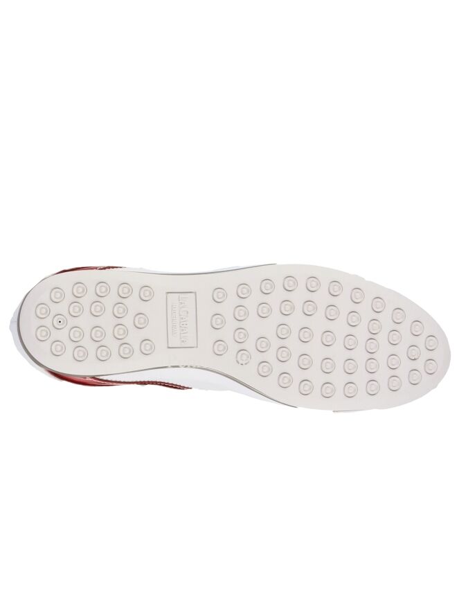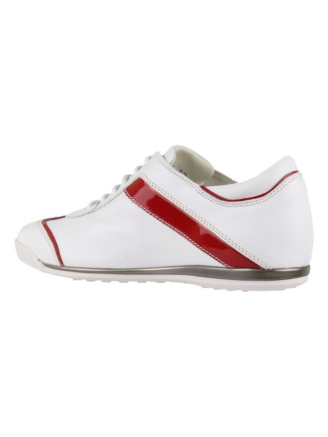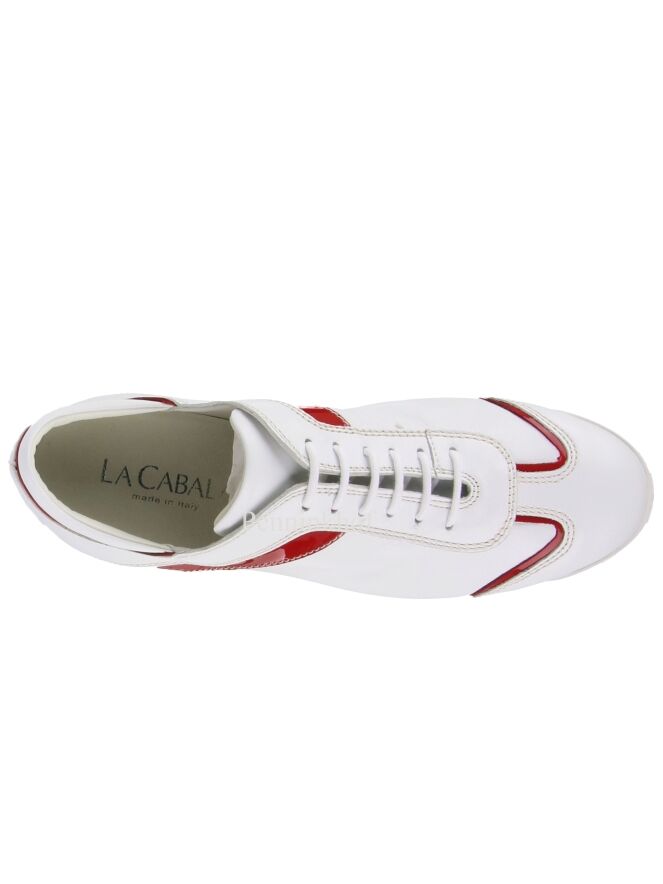 Ein weißer Sneaker der Schuhmarke La Cabala. An den Seiten, an der Ferse und am Vorderfuß befindet sich eine rote Paspel aus Lackleder. Die Einlegesohle ist herausnehmbar. Das Innenfutter ist aus Leder.