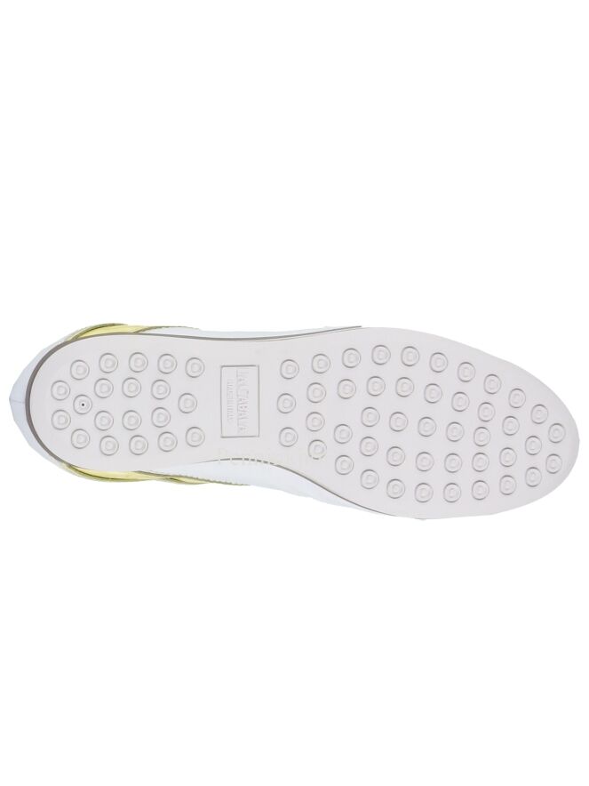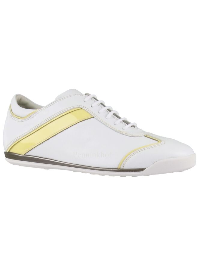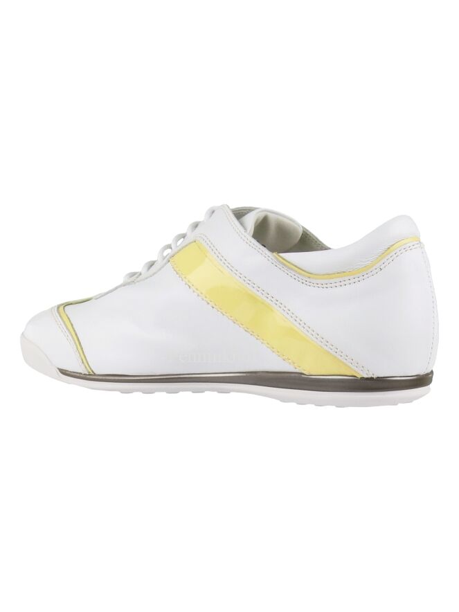 Ein weißer Sneaker der Schuhmarke La Cabala. An den Seiten, an der Ferse und am Vorderfuß befindet sich eine pastellgelbe Paspel aus Lackleder. Die Einlegesohle ist herausnehmbar. Das Innenfutter ist aus Leder.