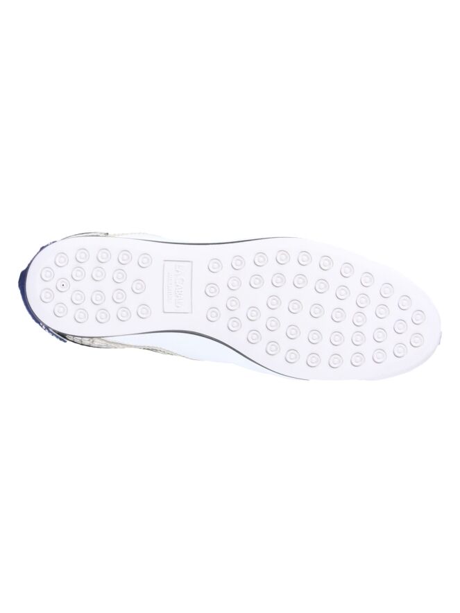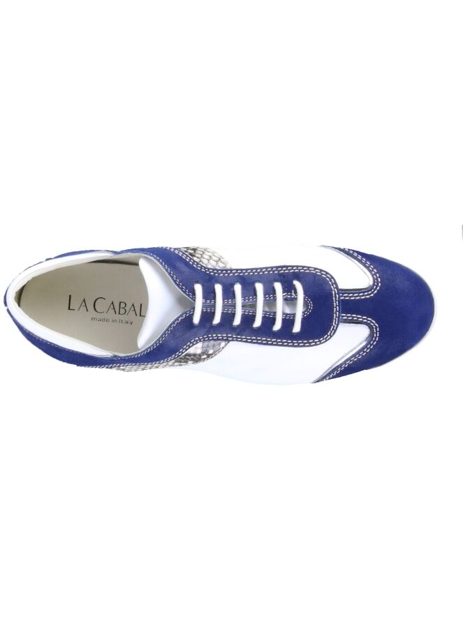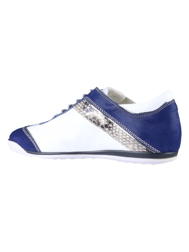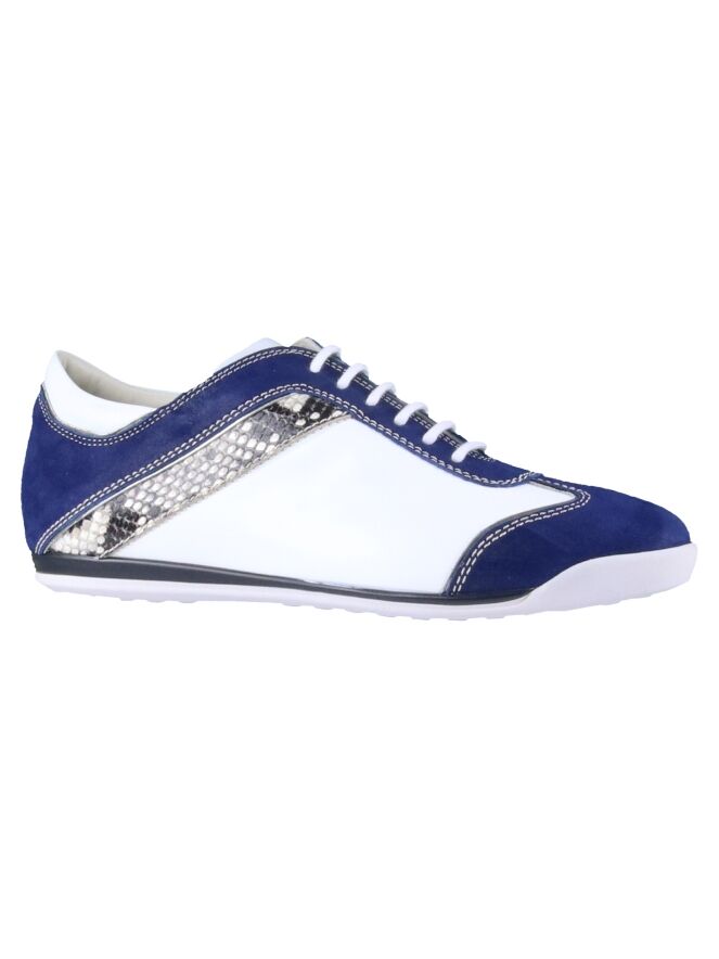 Weißer Sneaker der Designerschuhmarke La Cabala. Der Sneaker ist von der Ferse über den oberen Rand und die Schnürung bis hin zur Schuhspitze mit einem nachtblauen, mattglänzenden Wildlederstreifen versehen. Ein taupefarbiger Streifen mit Pythonprint akzentuiert die Seiten. Die Innensohle ist herausnehmbar. Der Sneaker hat ein Innenfutter aus Leder.