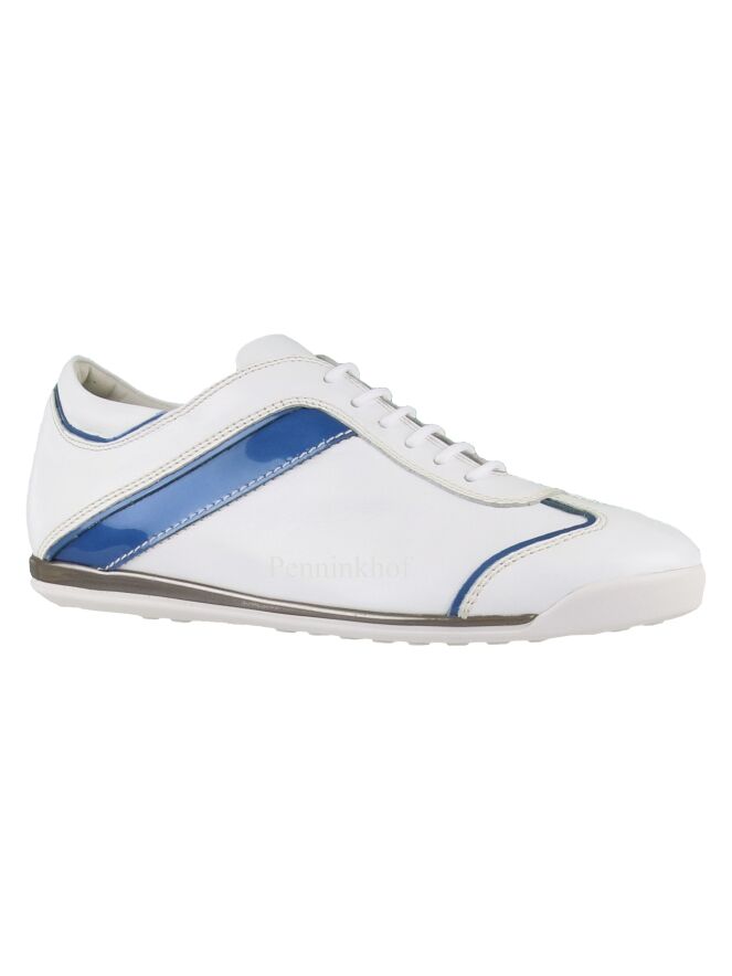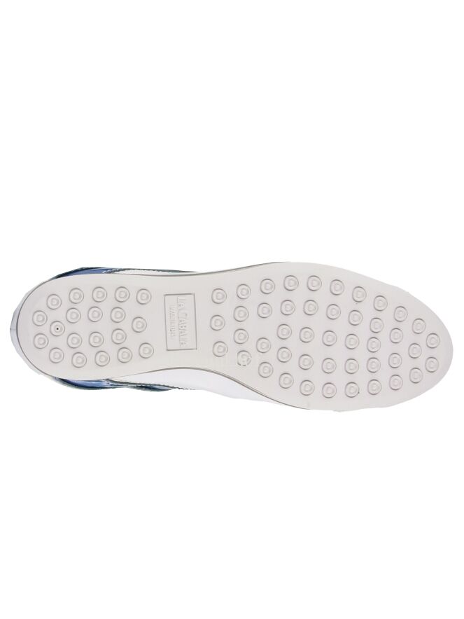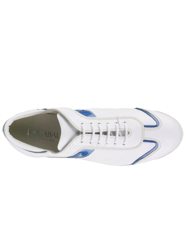 Ein weißer Sneaker der Schuhmarke La Cabala. An den Seiten, an der Ferse und am Vorderfuß befindet sich eine blaue Paspel aus Lackleder. Die Einlegesohle ist herausnehmbar. Das Innenfutter ist aus Leder.