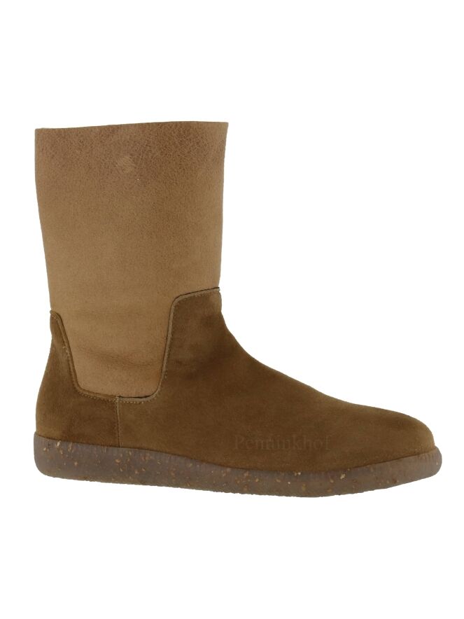 Eine Mouton-Stiefelette der Schuhmarke La Cabala in zwei Camel-Tönen. Der Spann ist in einem satten Camel gehalten, der Schaft kommt in einem weichen Camel-Ton. Die Innenseite des Schaftes ist mit Kunstfell ausgekleidet.