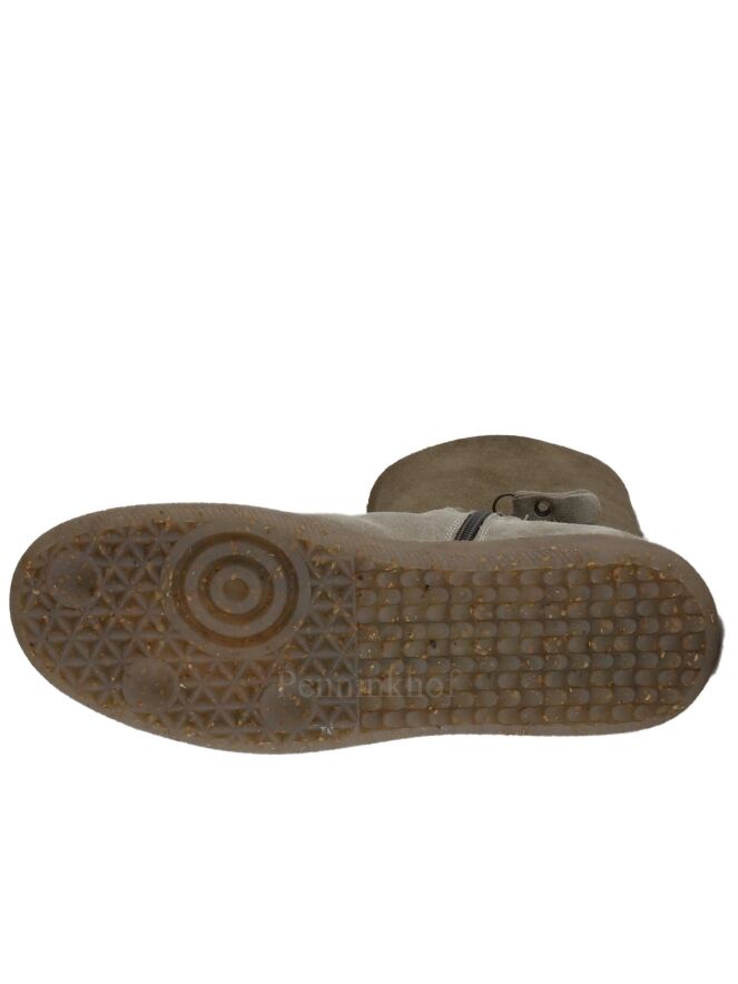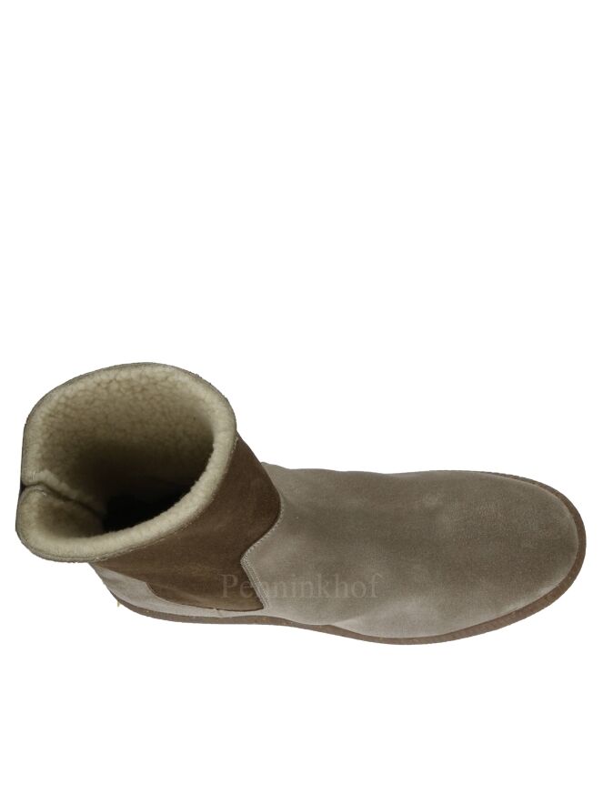 Ein Moutonstiefel der Schuhmarke La Cabala in zwei Taupe-Tönen. Der Spann kommt in einem hellen Taupe, der Schaft in einem dunklen Taupe-Ton. Die Innenseite des Schaftes ist mit Fellimitat gefüttert.