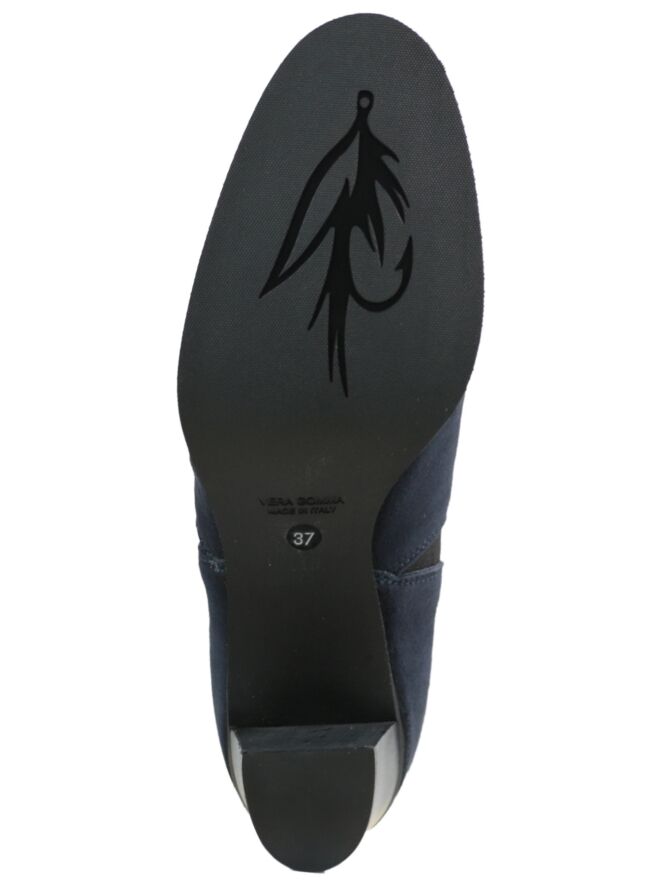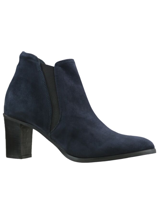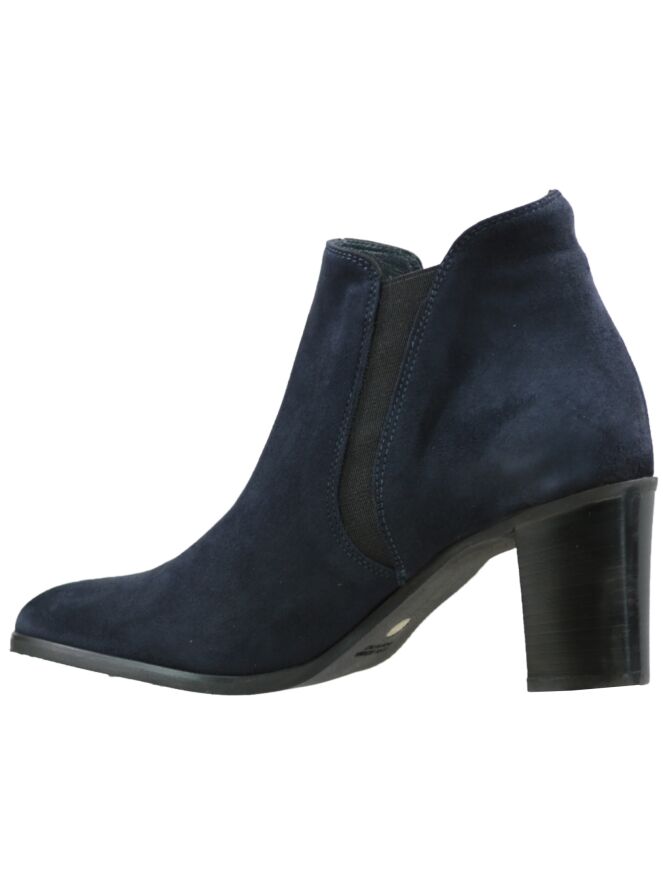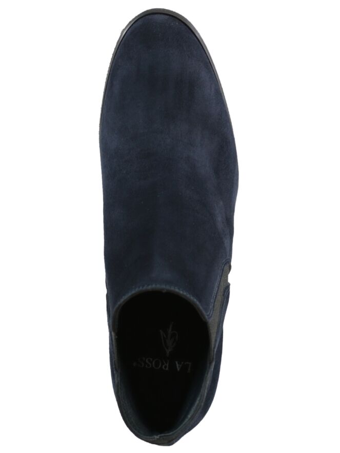 Kurze, marineblaue Stiefelette der Designerschuhmarke La Ross. Die Stiefelette kommt mit einer abgerundeten Schuhspitze und einem elastischen, diagonalen Einsatz an beiden Seiten. Der Blockabsatz ist neutral schwarz. Die Schafthöhe beträgt ab der Ferse 11 cm, der Umfang misst 26 cm. Die Stiefelette hat ein Innenfutter aus Leder.
