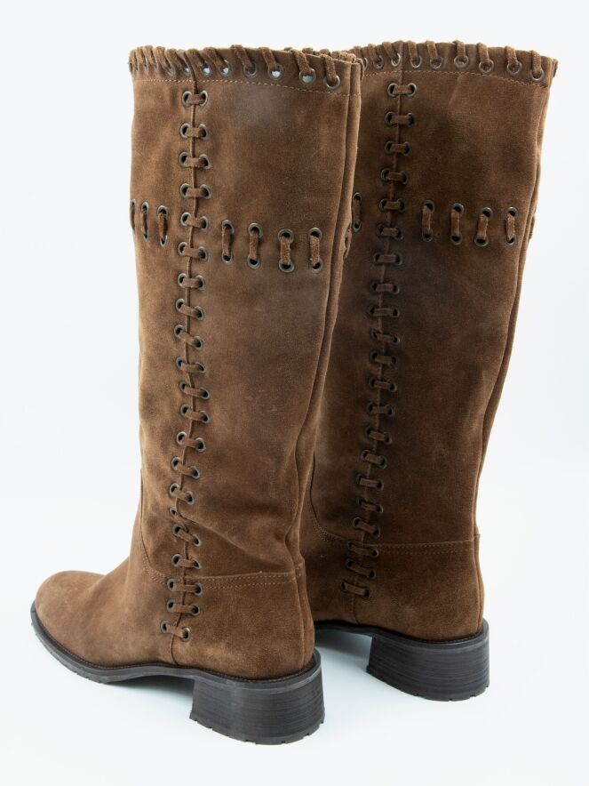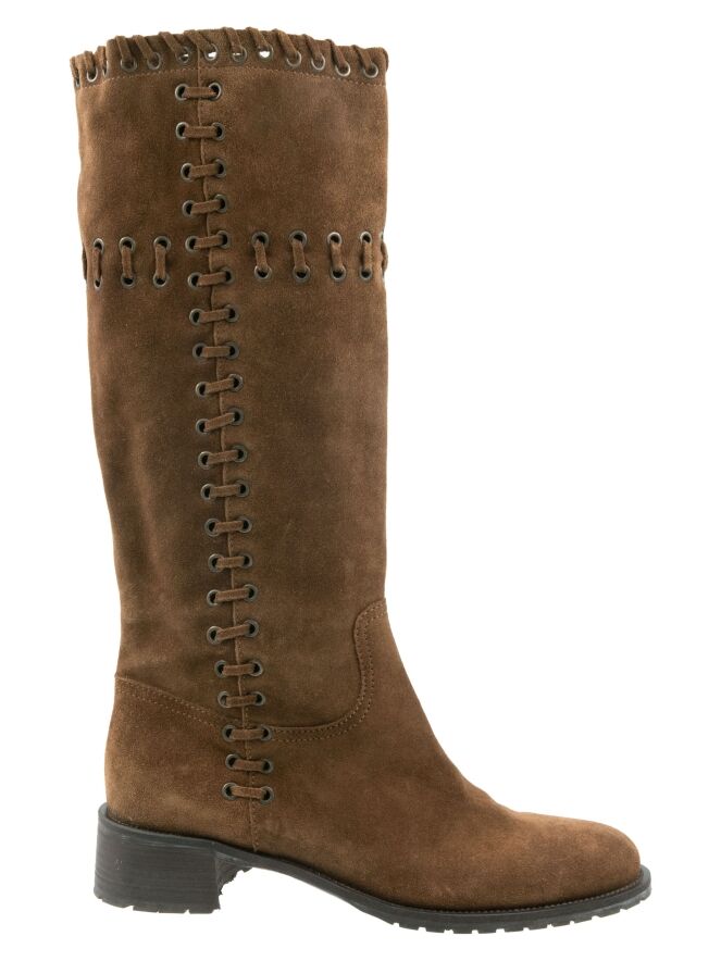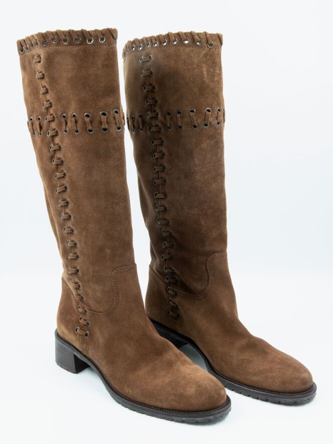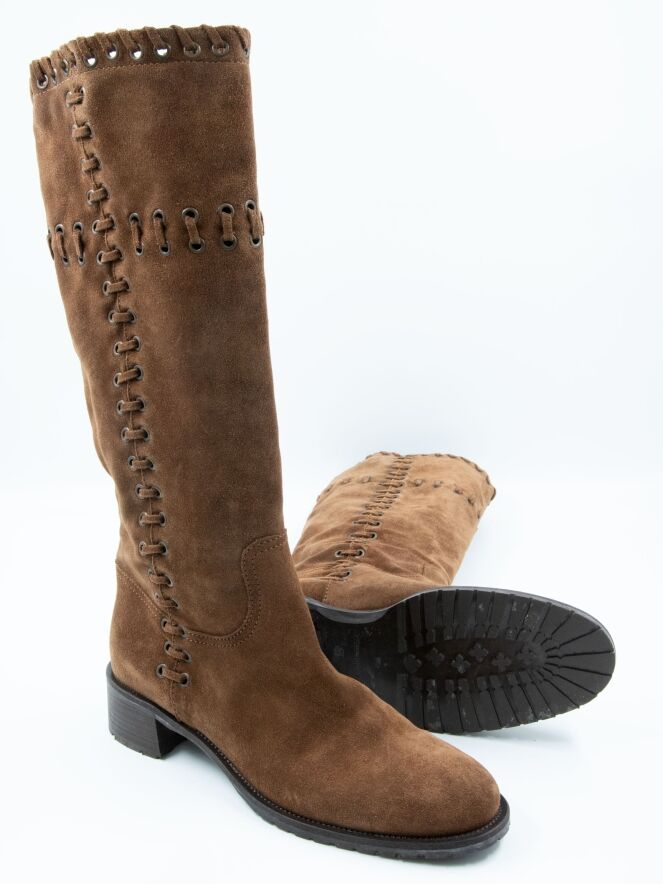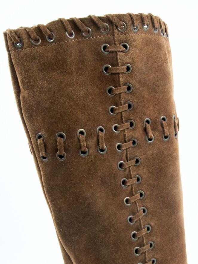 Ein hoher Stiefel von Luca Mode in der Farbe Cognac. An der Außenseite des Schafts ist über die gesamte Länge ein dekoratives Band durch kupferfarbene Ringe geflochten. Die gleiche Verzierung befindet sich am oberen Rand des Schafts und etwa 10 cm darunter. Die Innenseite des Schafts ist ungefüttert.
