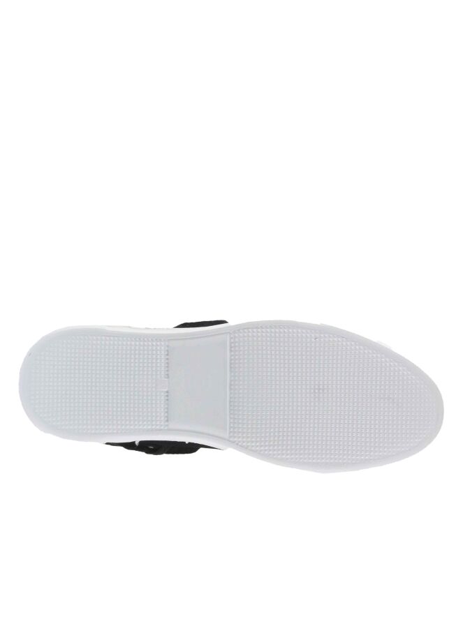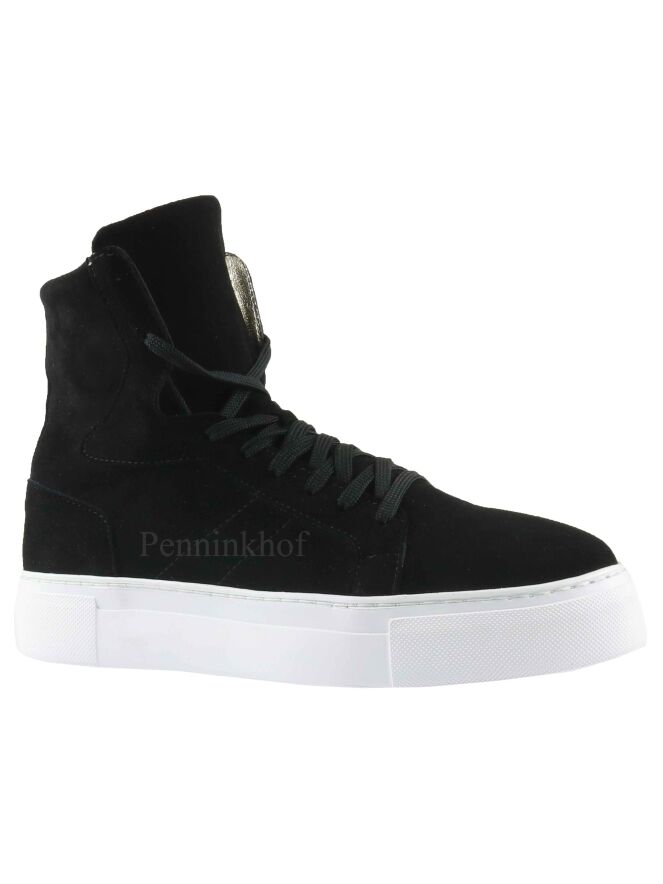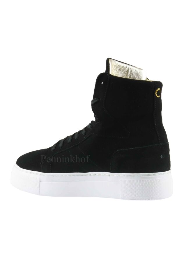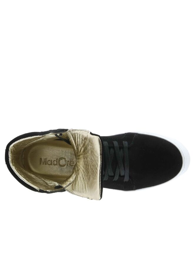 Ein hoher Sneaker der Schuhmarke Madore in schwarz. Die Sohle ist weiß. Der Sneaker kommt mit einem goldfarbenen Lederfutter. Die Einlegesohle ist herausnehmbar.