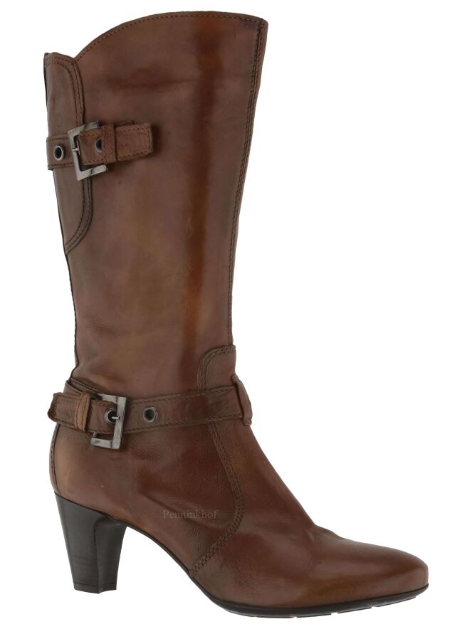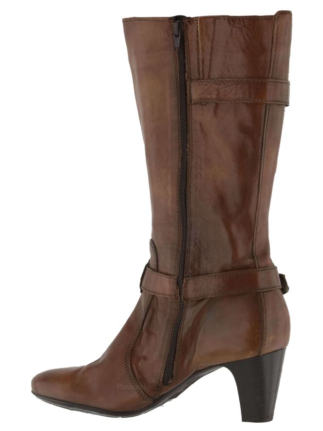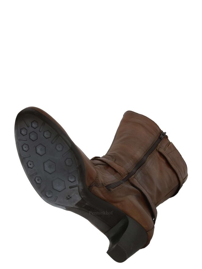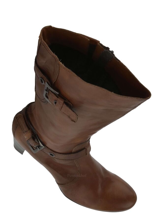 Ein halbhoher Stiefel von Manas in dunklem Cognac. Auf Knöchelhöhe und an der Rückseite der Wade befindet sich eine dekorative Schnalle. Der Stiefel hat eine runde Kappe und einen dunkelbraunen Absatz.