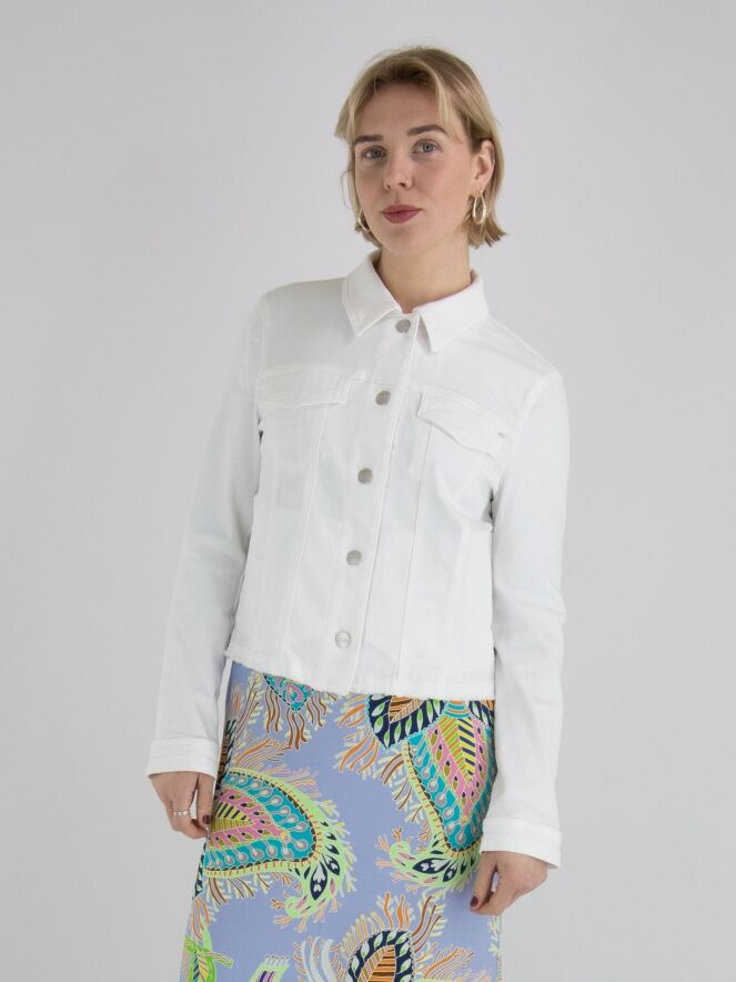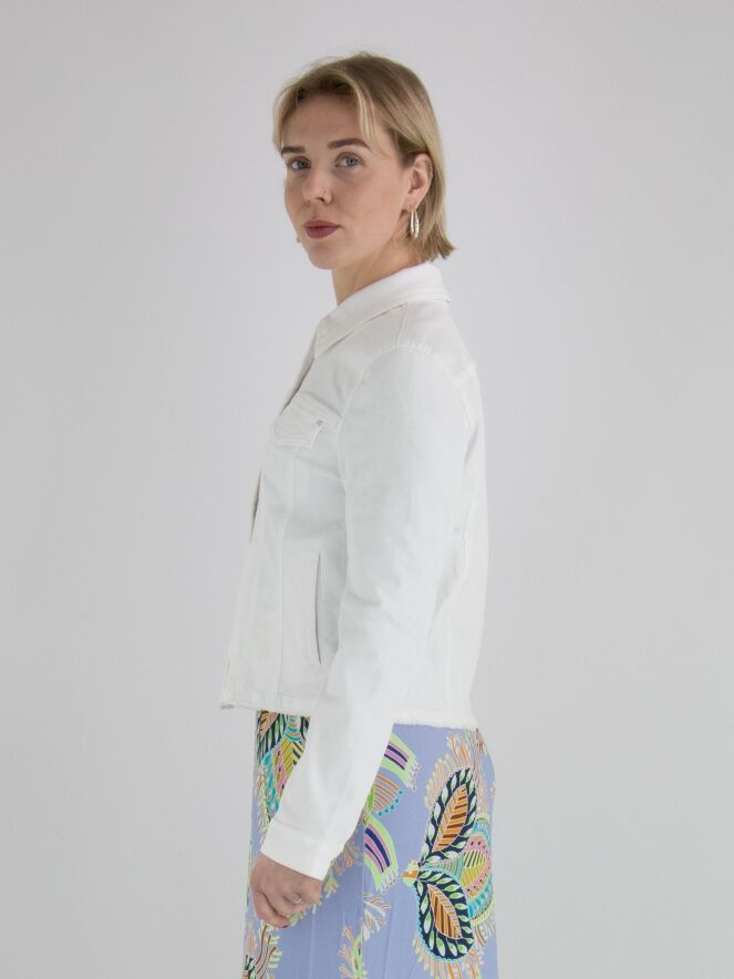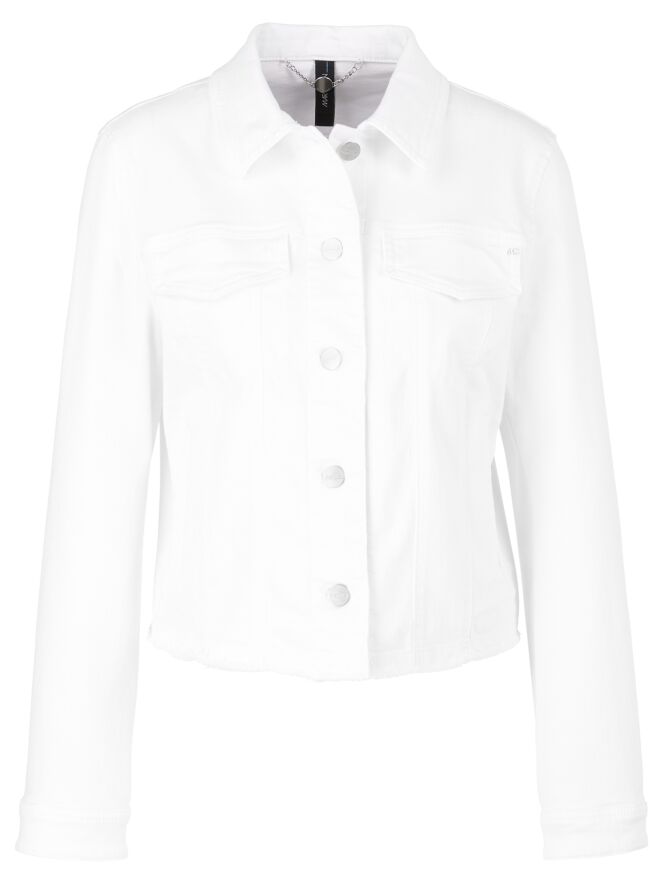 Ein weißer Jeans-Blazer von Marc Cain. Er verfügt über einen Knopfverschluss mit 5 Knöpfen und der untere Rand des Stoffes ist fein ausgefranst. Dieser Blazer kann bei 30 Grad gewaschen werden.