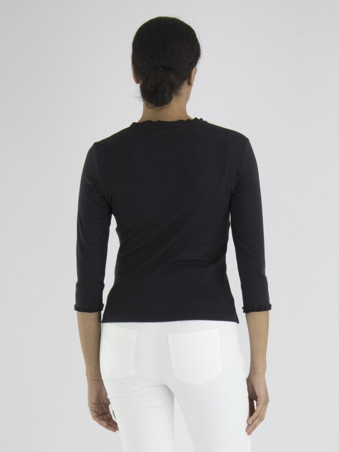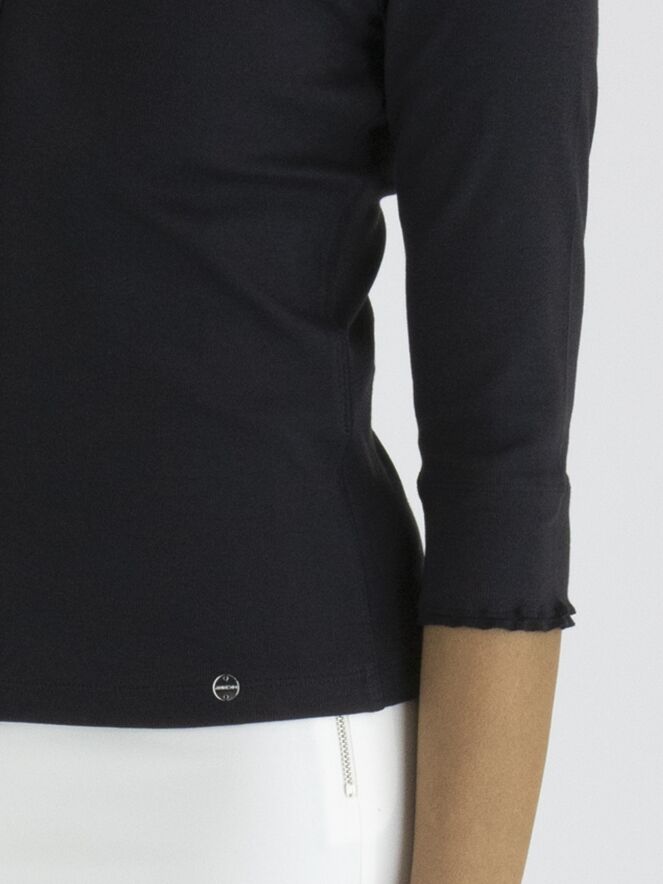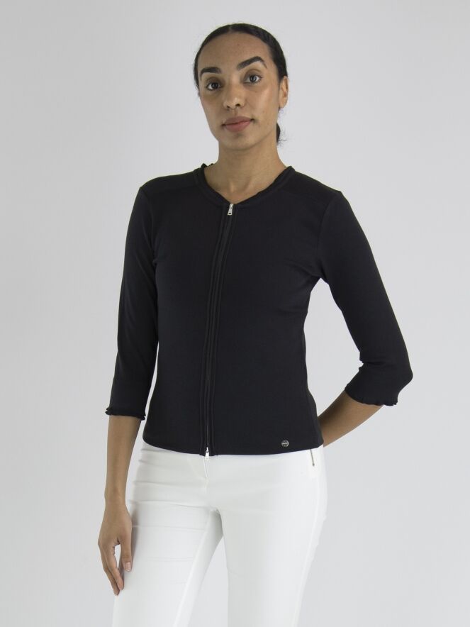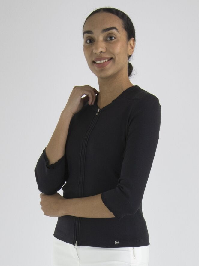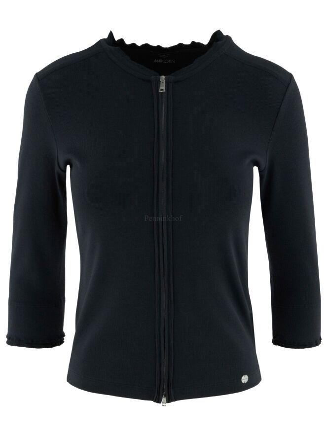 Eine Strickjacke der Marke Marc Cain in Marineblau. Die Strickjacke hat halblange Ärmel und einen runden Halsausschnitt. Entlang des Halses und des Reißverschlusses verläuft ein geripptes Band. Diese Strickjacke kann bei 30 Grad gewaschen werden.