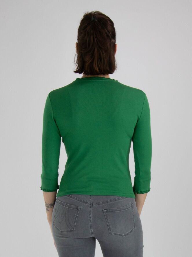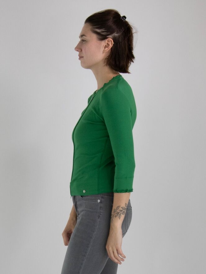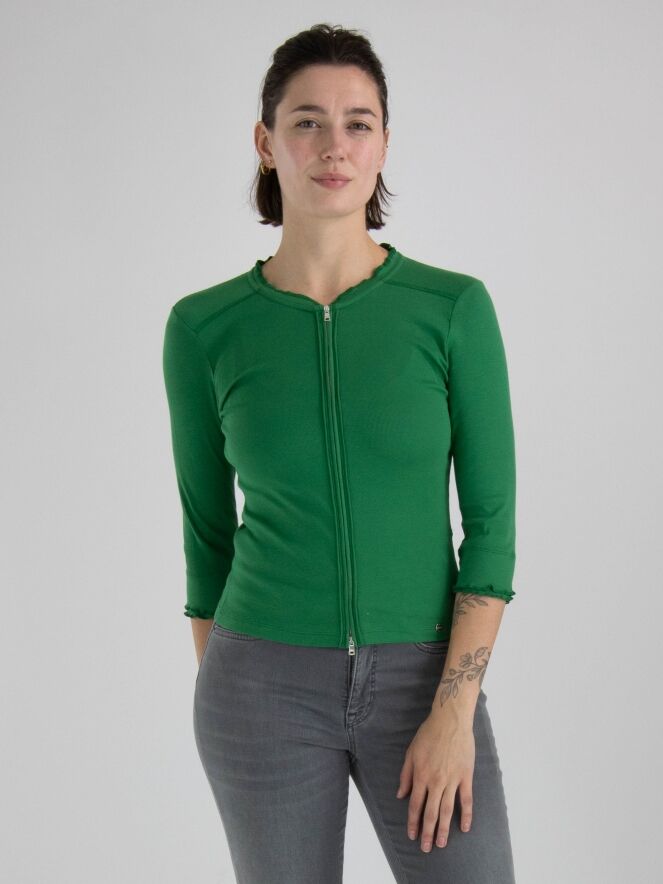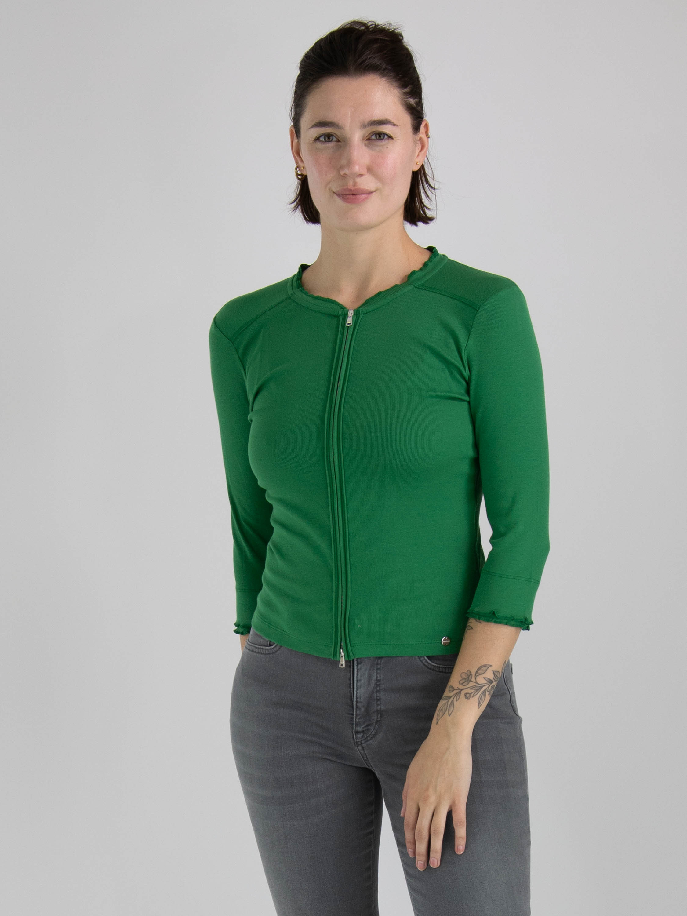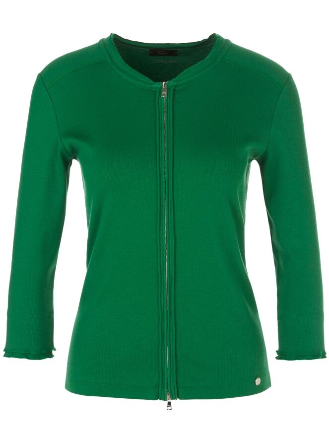 Eine kurze Strickjacke von Marc Cain in einer fein gerippten Struktur und grüner Farbe. Die Strickjacke hat halblange Ärmel und einen Reißverschluss. Diese Strickjacke kann bei 30 Grad gewaschen werden.
