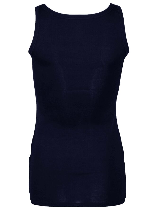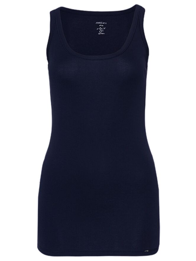 Marineblaues Basic-Top der Designermodemarke Marc Cain essentiels. Das Top hat einen runden Halsausschnitt, 3 cm breite Träger und kann auf 30 Grad in der Waschmaschine gewaschen werden.