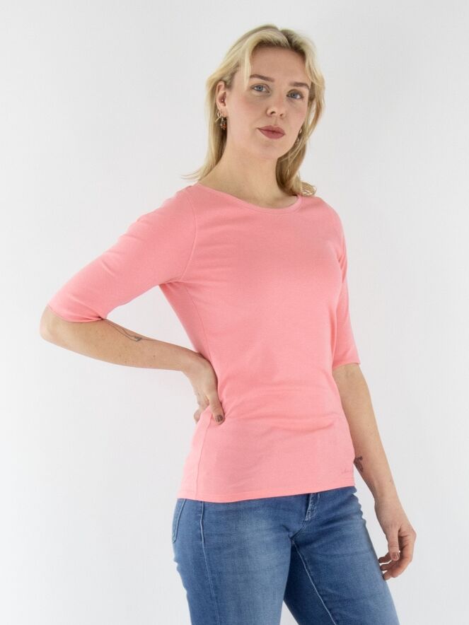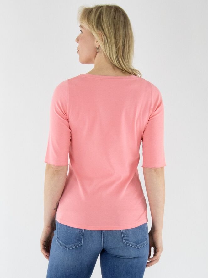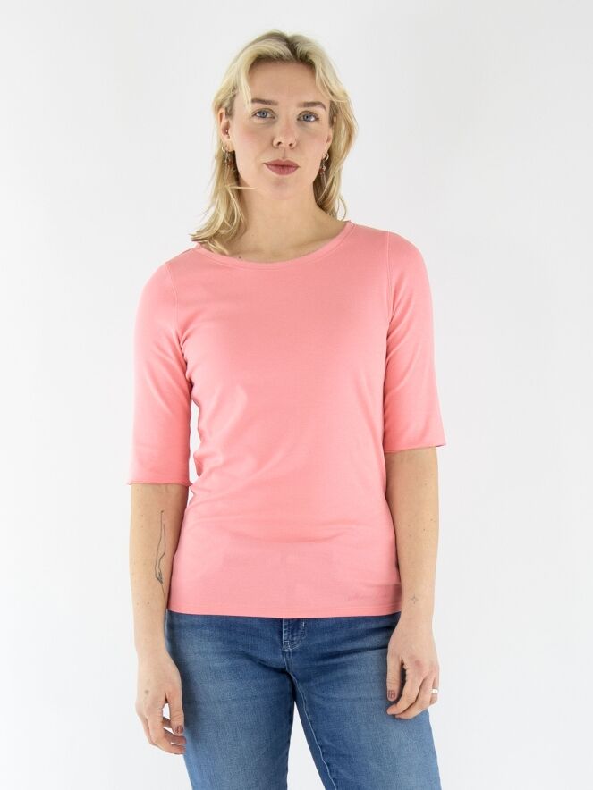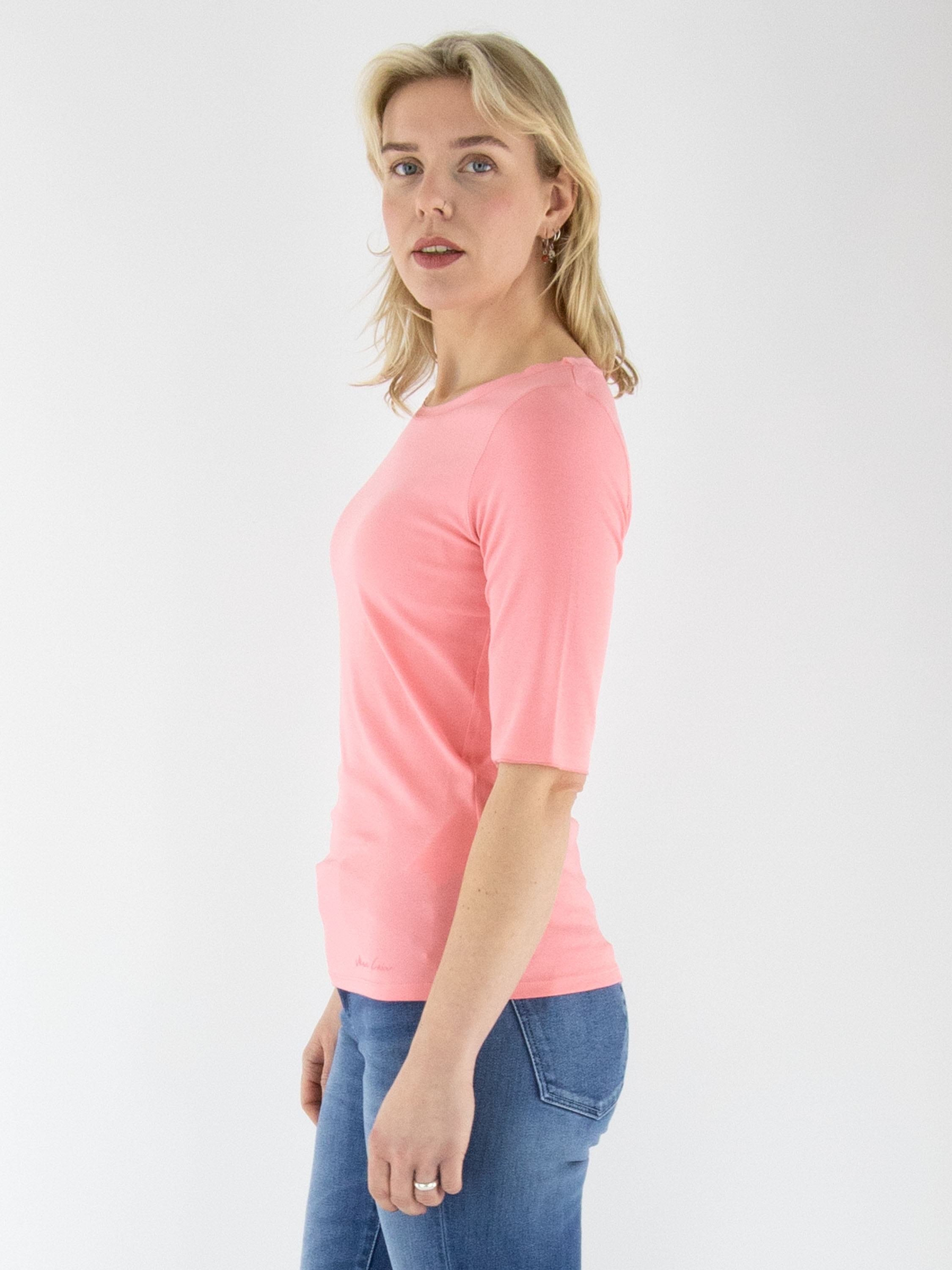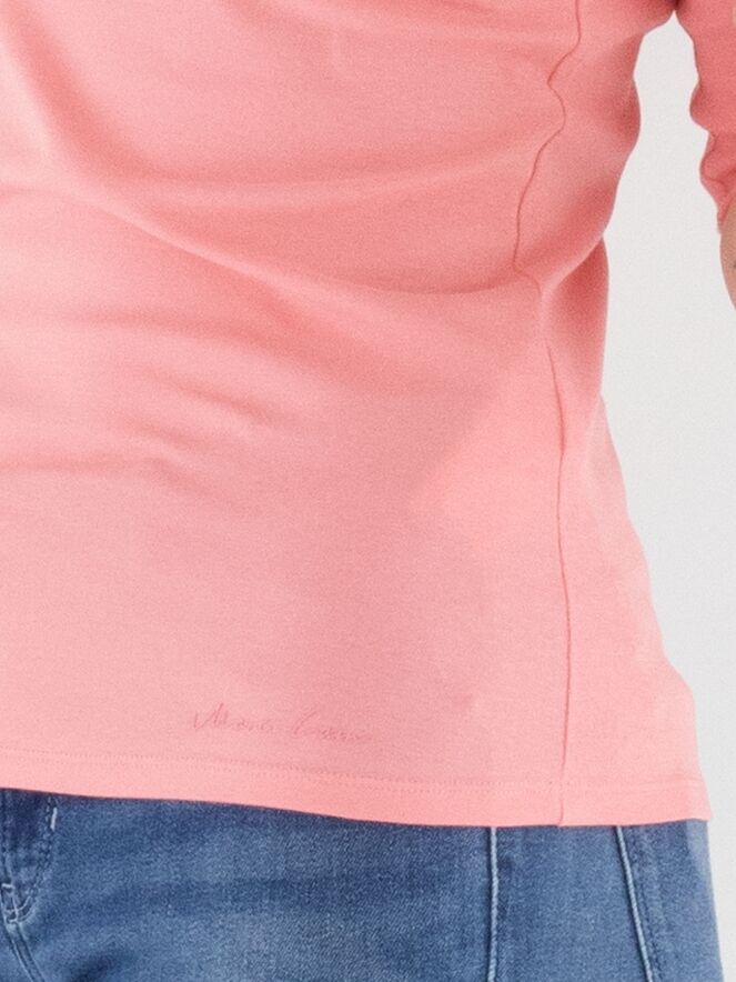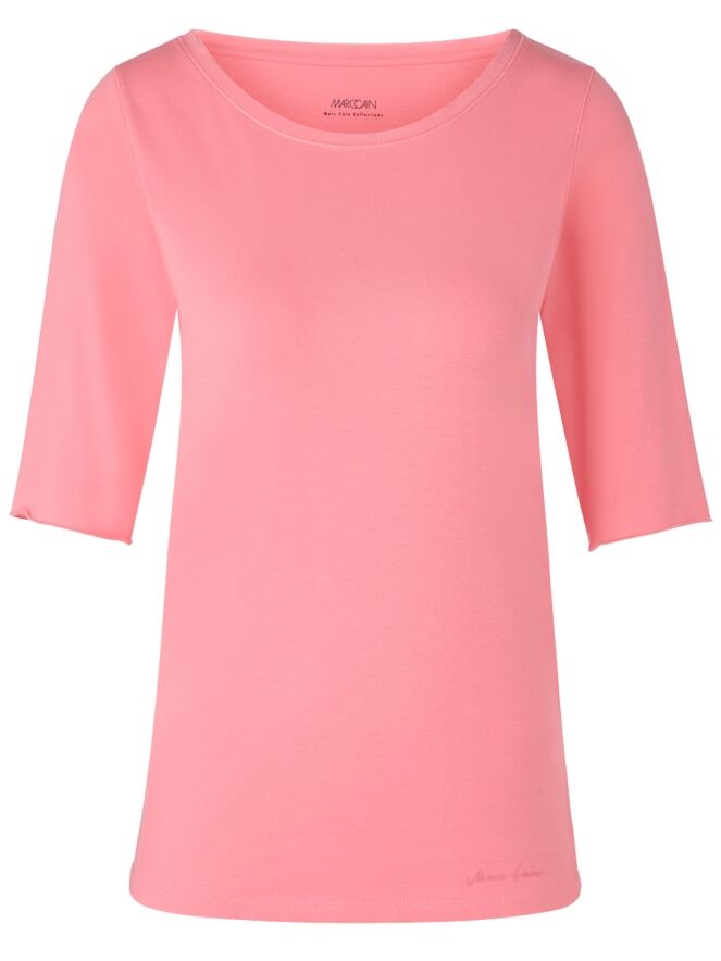 Ein Shirt von Marc Cain in Lachsrosa. Entlang des Randes des runden Ausschnitts verläuft eine doppelte matte Satinbiese. Das Shirt hat kurze Ärmel und sollte von Hand gewaschen werden.