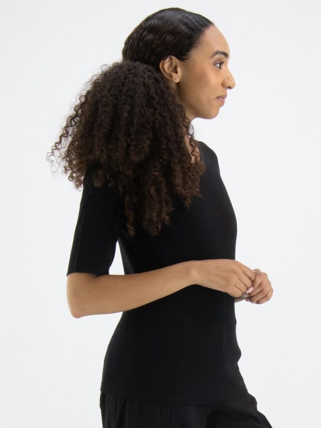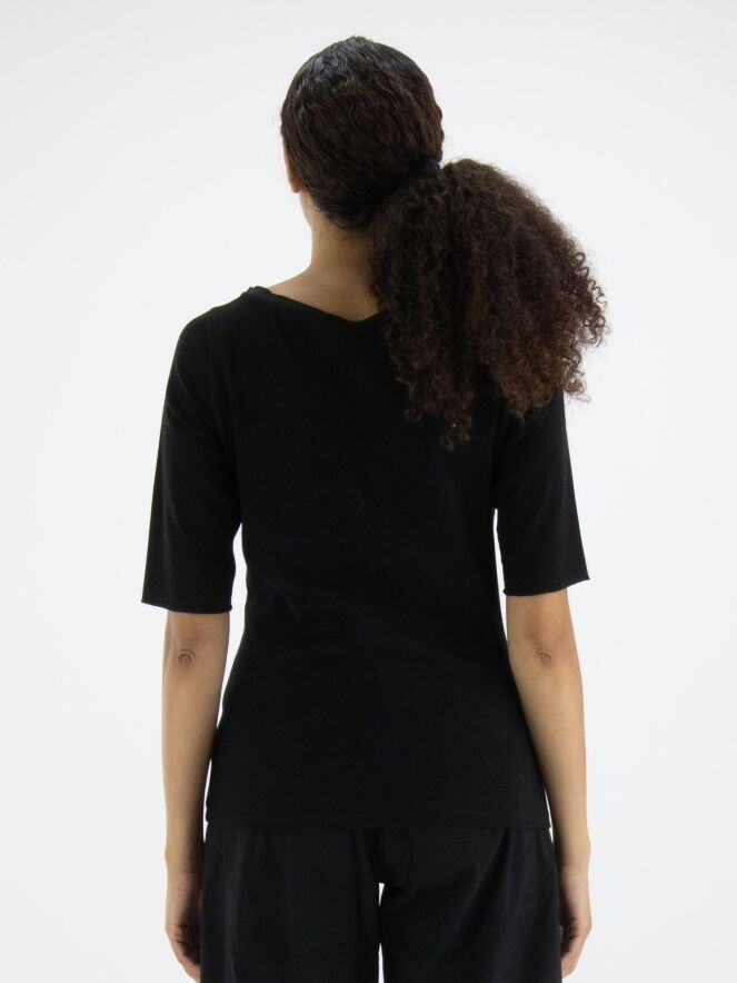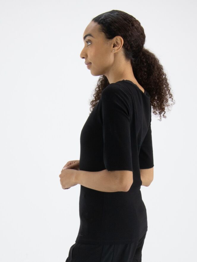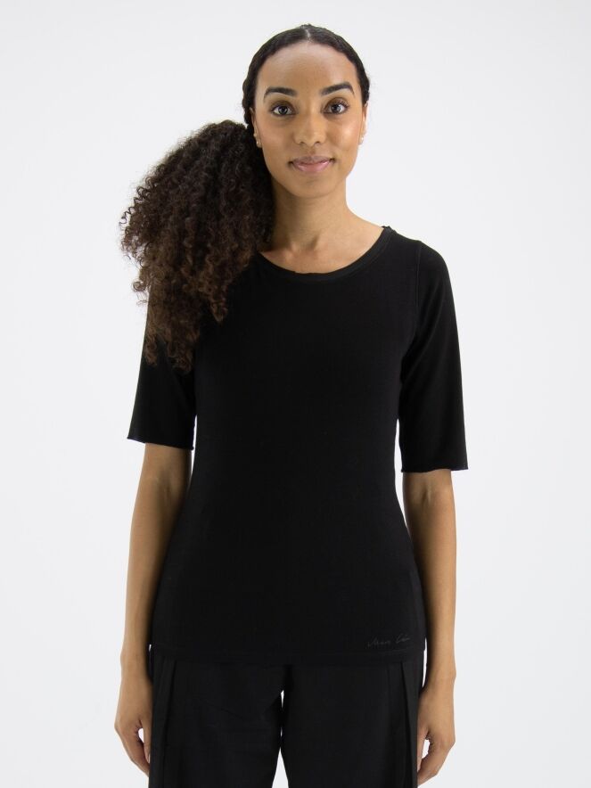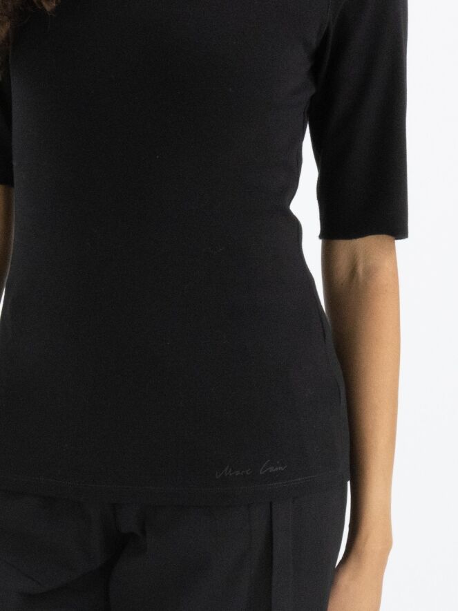 Ein Shirt von Marc Cain in Schwarz. Entlang des Randes des runden Halsausschnitts befindet sich eine doppelte Matte-Satin-Borte. Das Shirt hat kurze Ärmel und kann von Hand gewaschen werden.