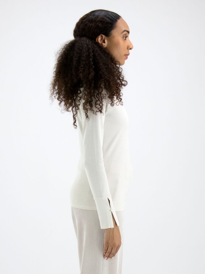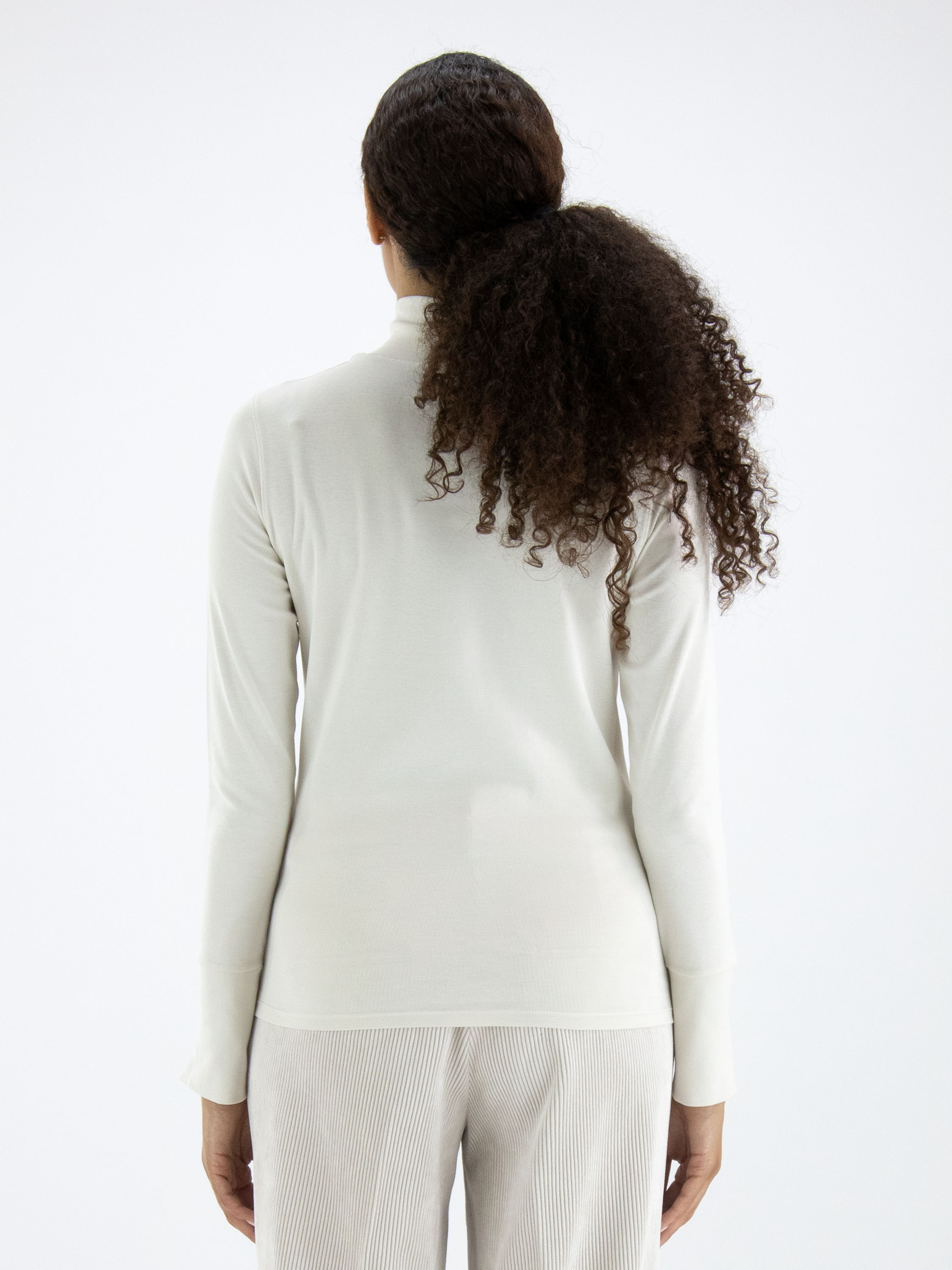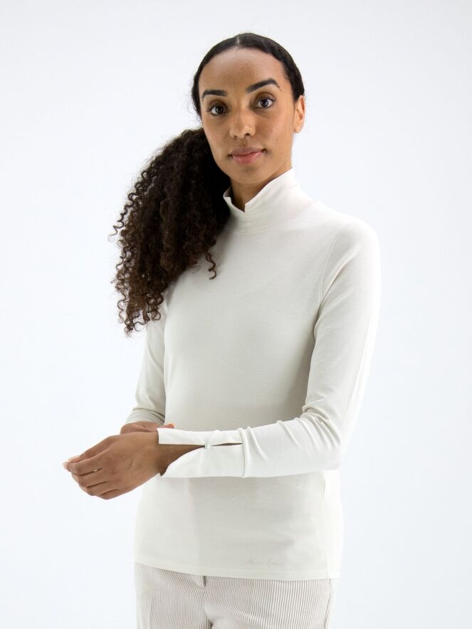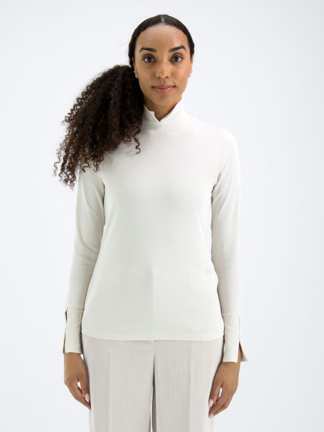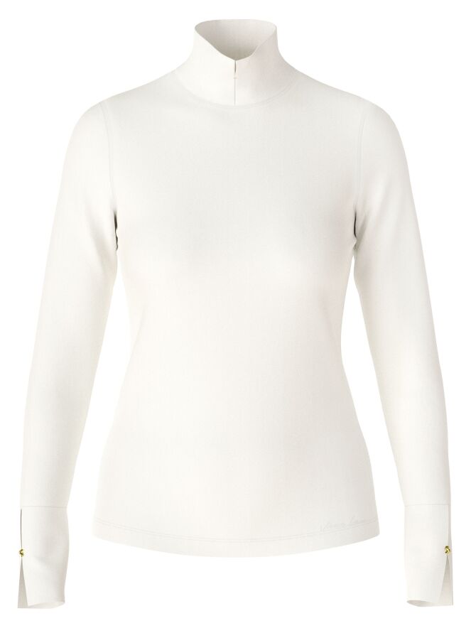 Ein Shirt von Marc Cain in Cremeweiß. Das Shirt hat lange Ärmel und einen Rollkragen mit einem kurzen Schlitz in der vorderen Mitte. Dieses Shirt kann bei 30 Grad gewaschen werden.