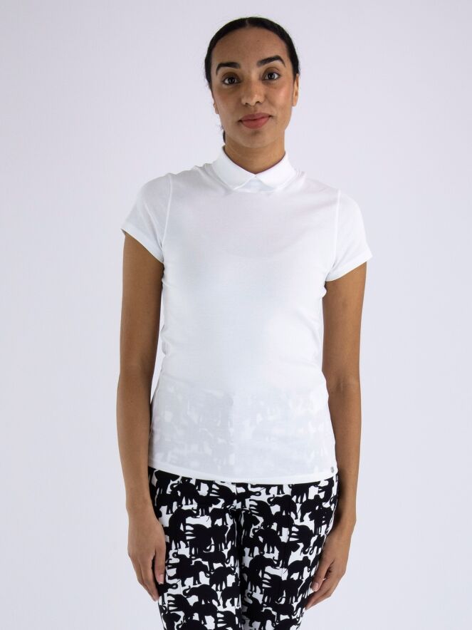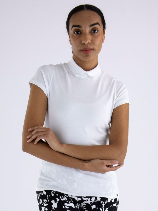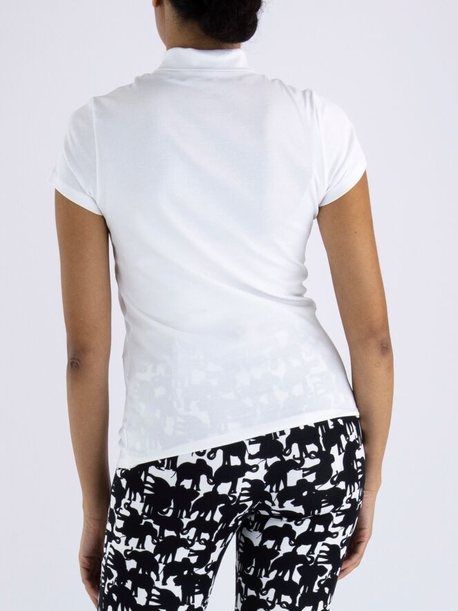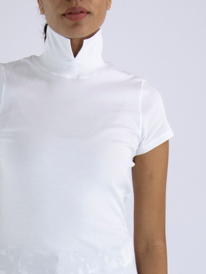 Ein Shirt von Marc Cain in Weiß. Das Shirt hat kurze Ärmel und einen Turtle-Kragen. Dieses Shirt kann bei 30 Grad gewaschen werden.