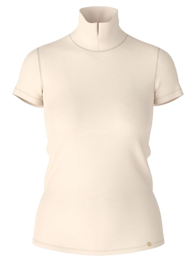 Ein Shirt von Marc Cain in Sandfarbe. Das Shirt hat kurze Ärmel und einen Turtle-Kragen. Dieses Shirt kann bei 30 Grad gewaschen werden.