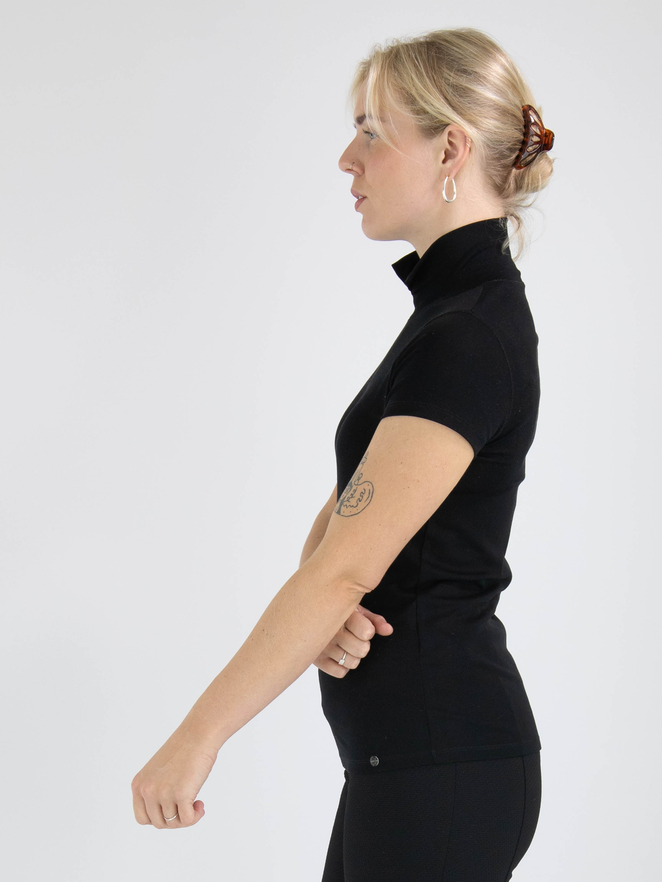 Ein schwarzes Shirt von Marc Cain. Das Shirt hat kurze Ärmel und einen Rollkragen. In der Mitte des Rollkragens befindet sich vorne ein kleiner Schlitz. Dieses Shirt kann bei 30 Grad gewaschen werden.