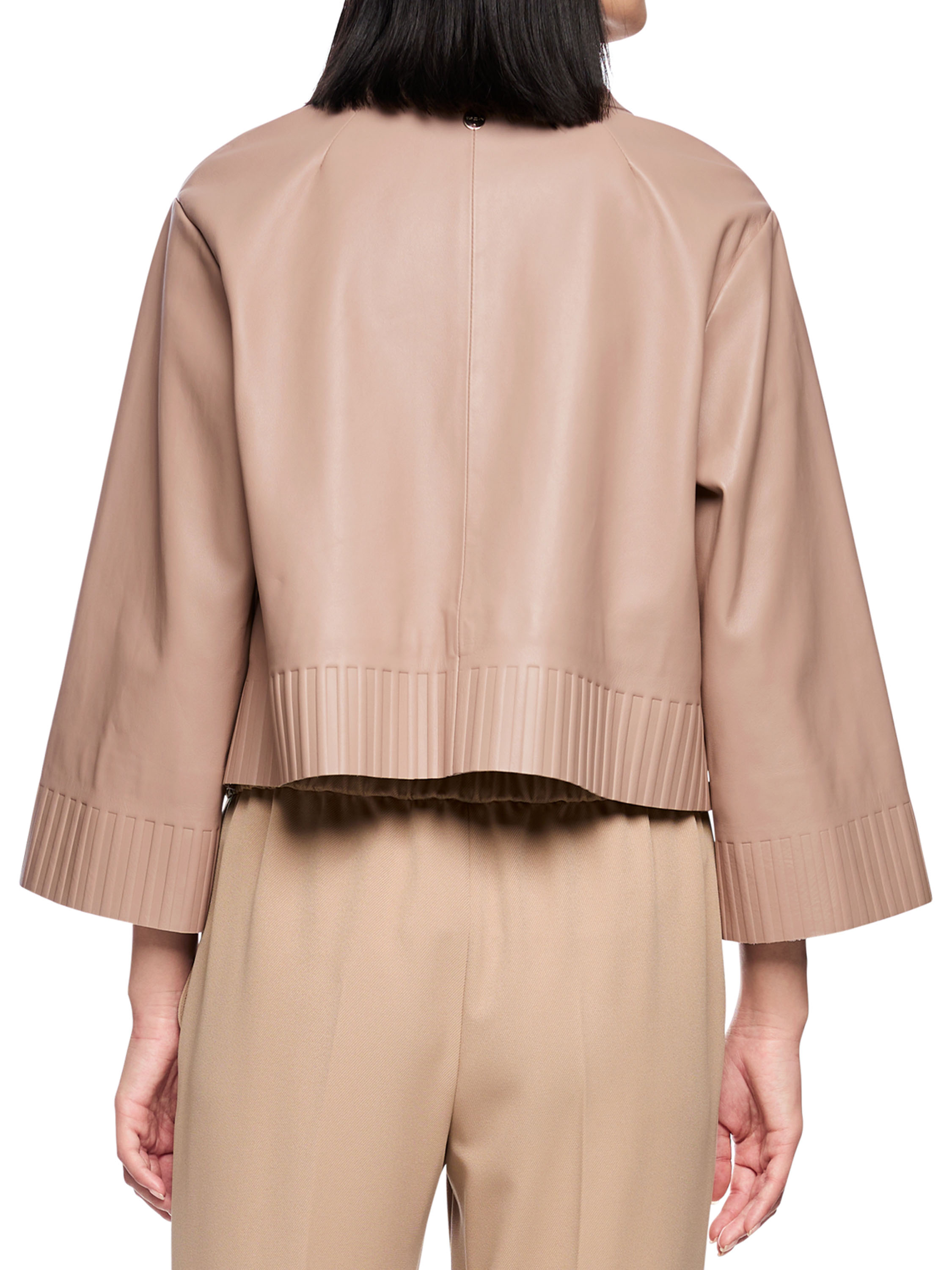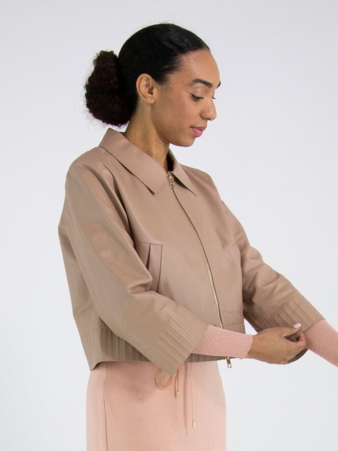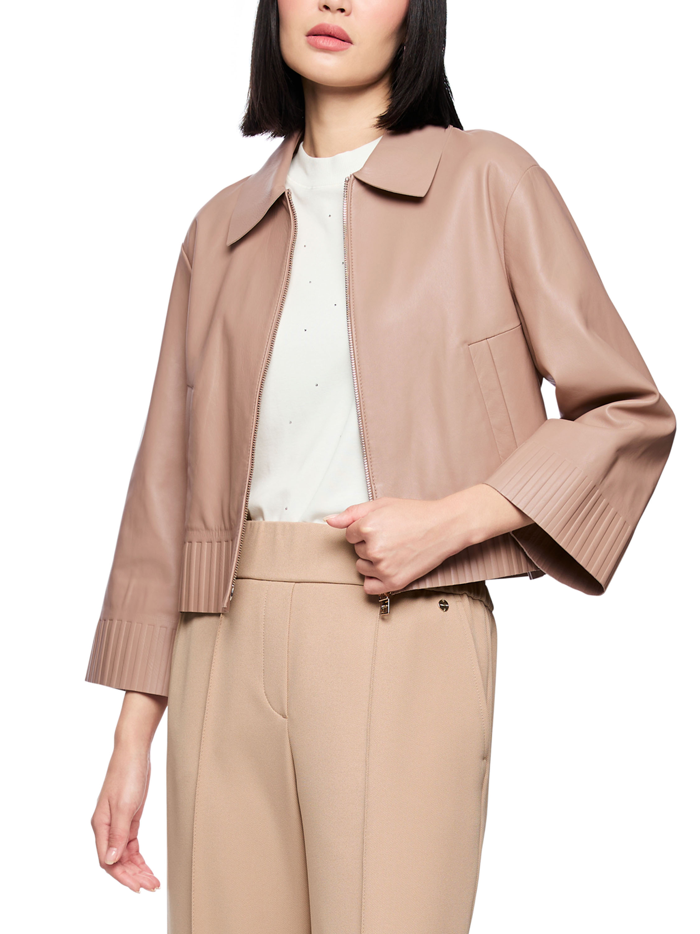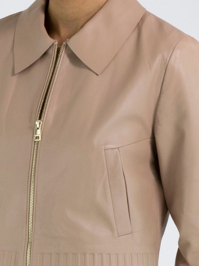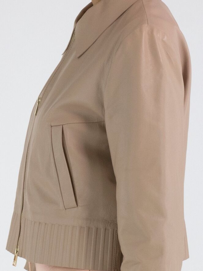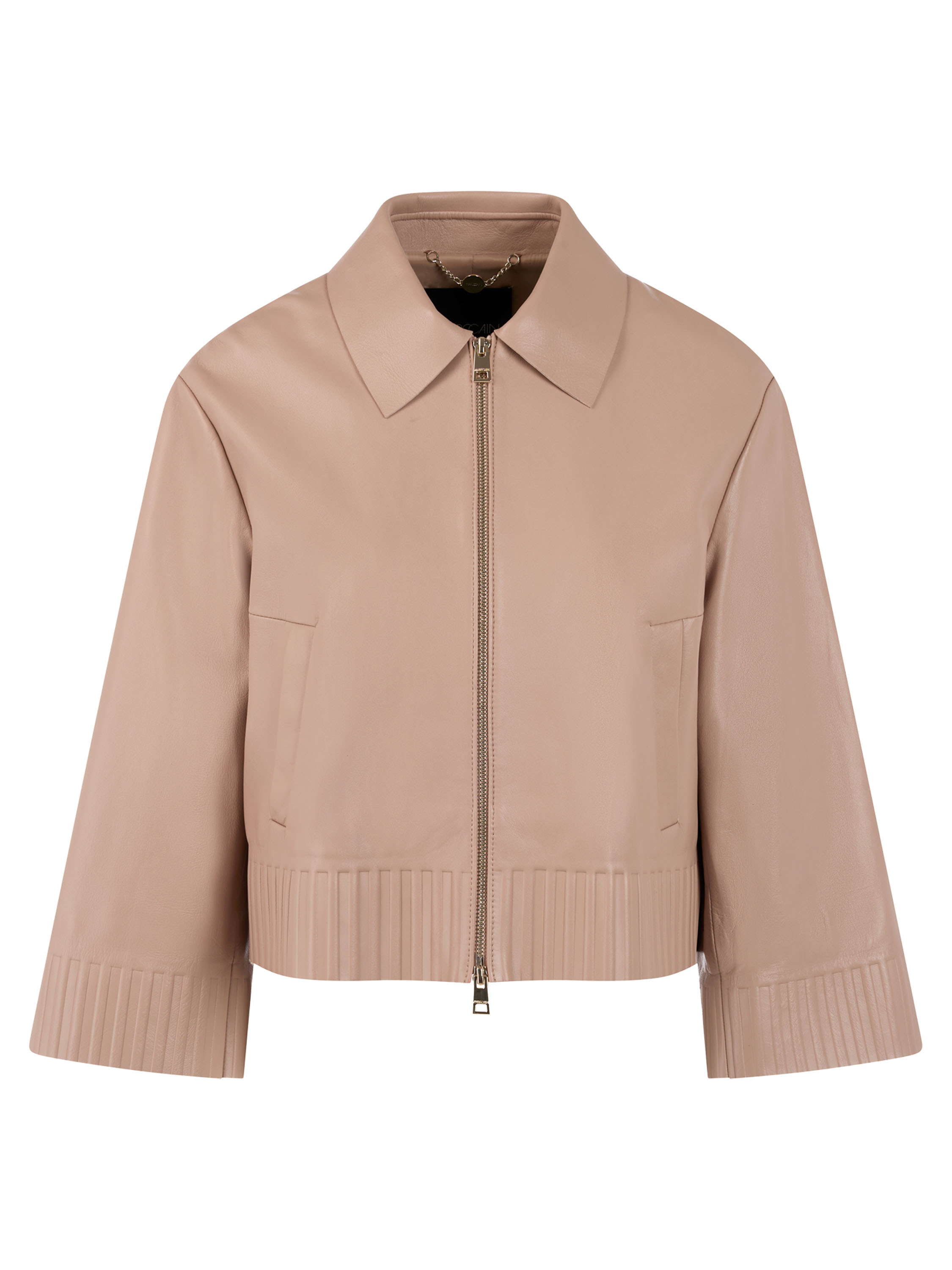 Ein kurzer Ledermantel von Marc Cain in einem weichen Taupeton. Der Mantel hat einen Kragen und einen Reißverschluss. Am unteren Abschluss und an den Ärmelenden befindet sich ein breites Band, in das ein Riffelmuster in das Leder geprägt ist. Dieser Mantel darf nicht gewaschen werden.