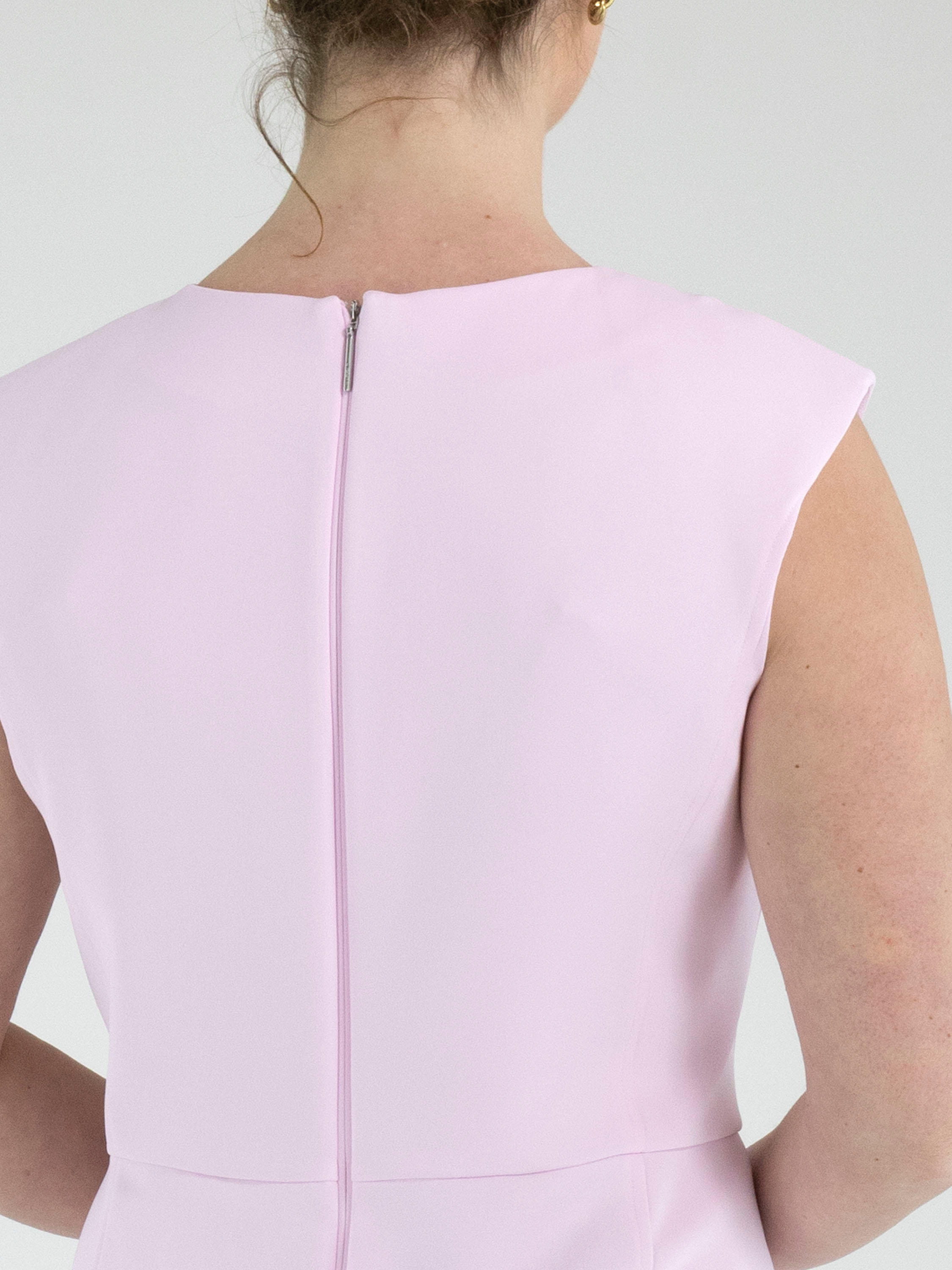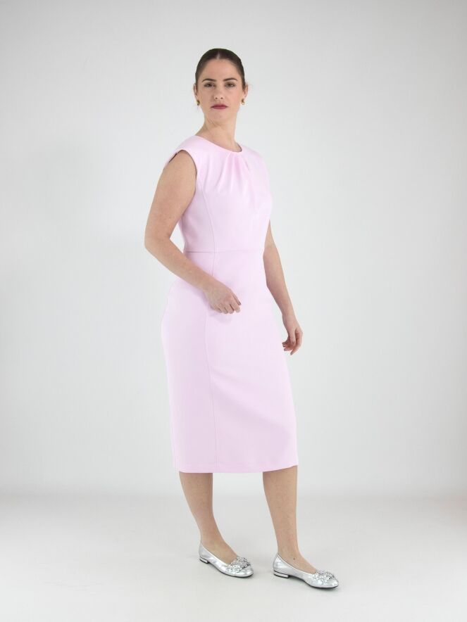 Ein Kleid von Marc Cain in einem leuchtenden Rosaton. In der Mitte des Rundhalsausschnitts sind vier Plisseefalten eingearbeitet, die einen diagonalen Falteneffekt erzeugen. Auf der Rückseite verläuft ein Reißverschluss vom Ausschnitt bis zur Hüfte. Das Kleid ist gefüttert und kann bei 30 Grad gewaschen werden.