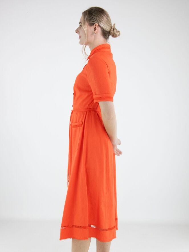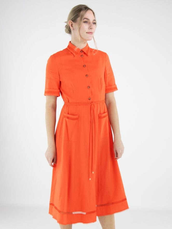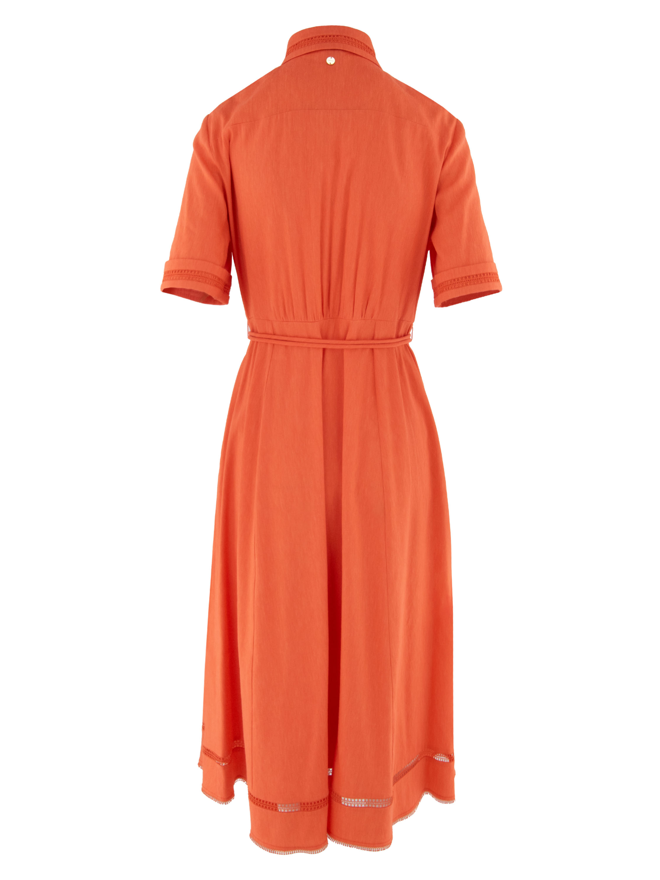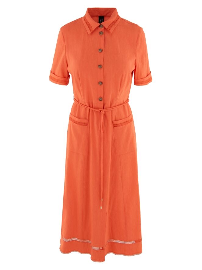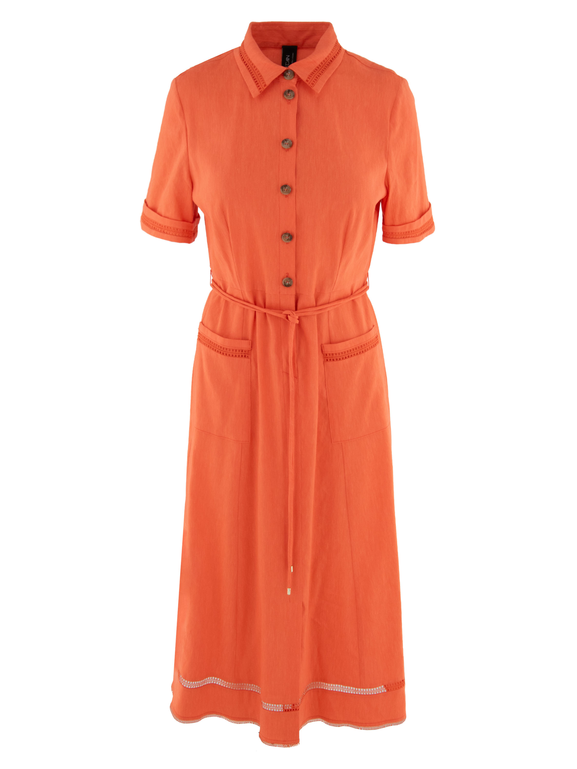 Kleid von Marc Cain in einem frischen Korallrot. Eine feine Ajourborte ziert den Kragenrand, die Umschläge der kurzen Ärmel, die Taschenkanten sowie den Saum und setzt einen femininen Akzent. Die Knopfleiste reicht bis unter die Taille. Ein Bindegürtel aus dem gleichen Stoff betont die Taille stilvoll. Ab der Taille fällt das Kleid in einer leichten A-Linie. Dieses Kleid kann bei 30 Grad gewaschen werden.