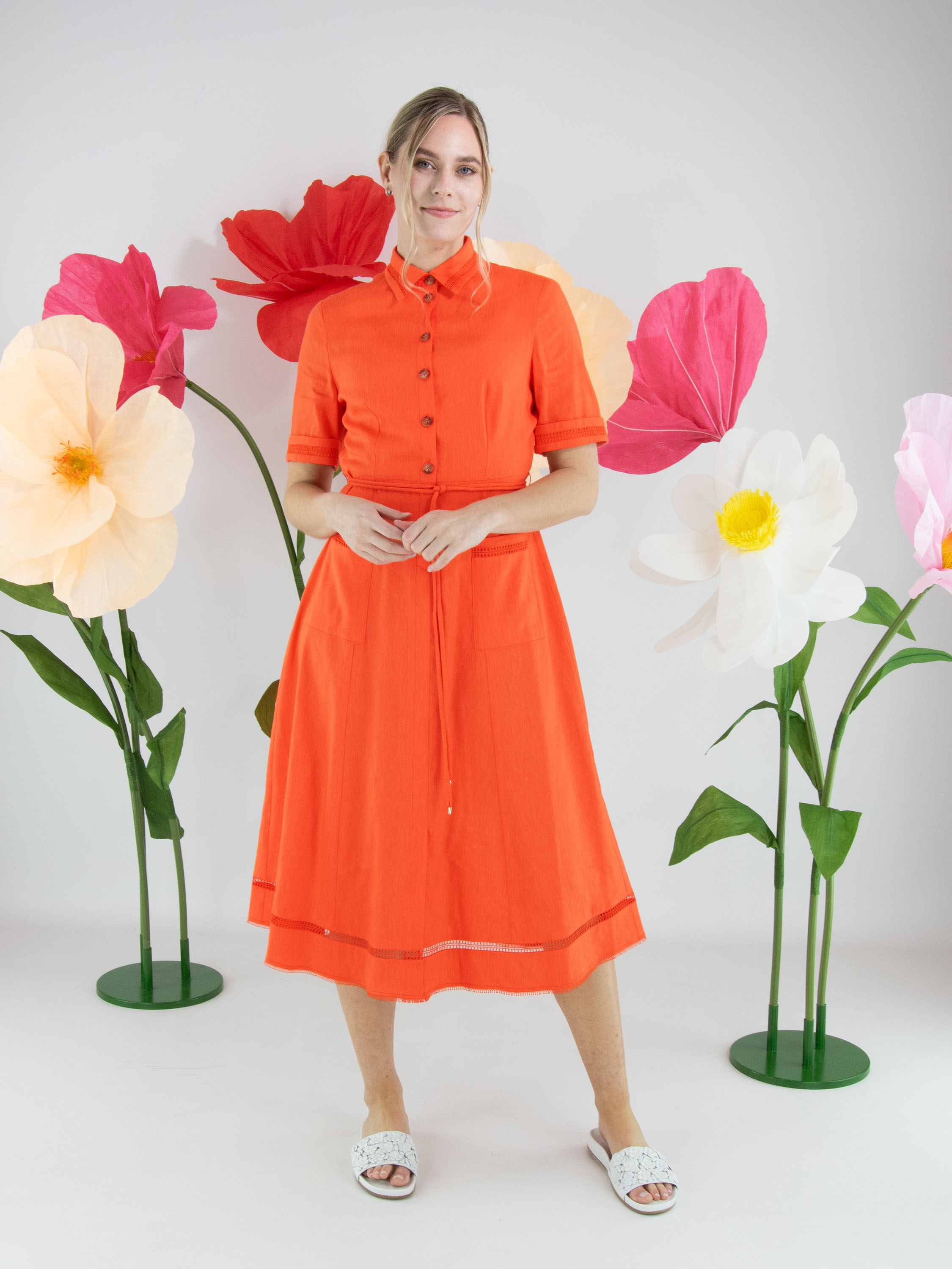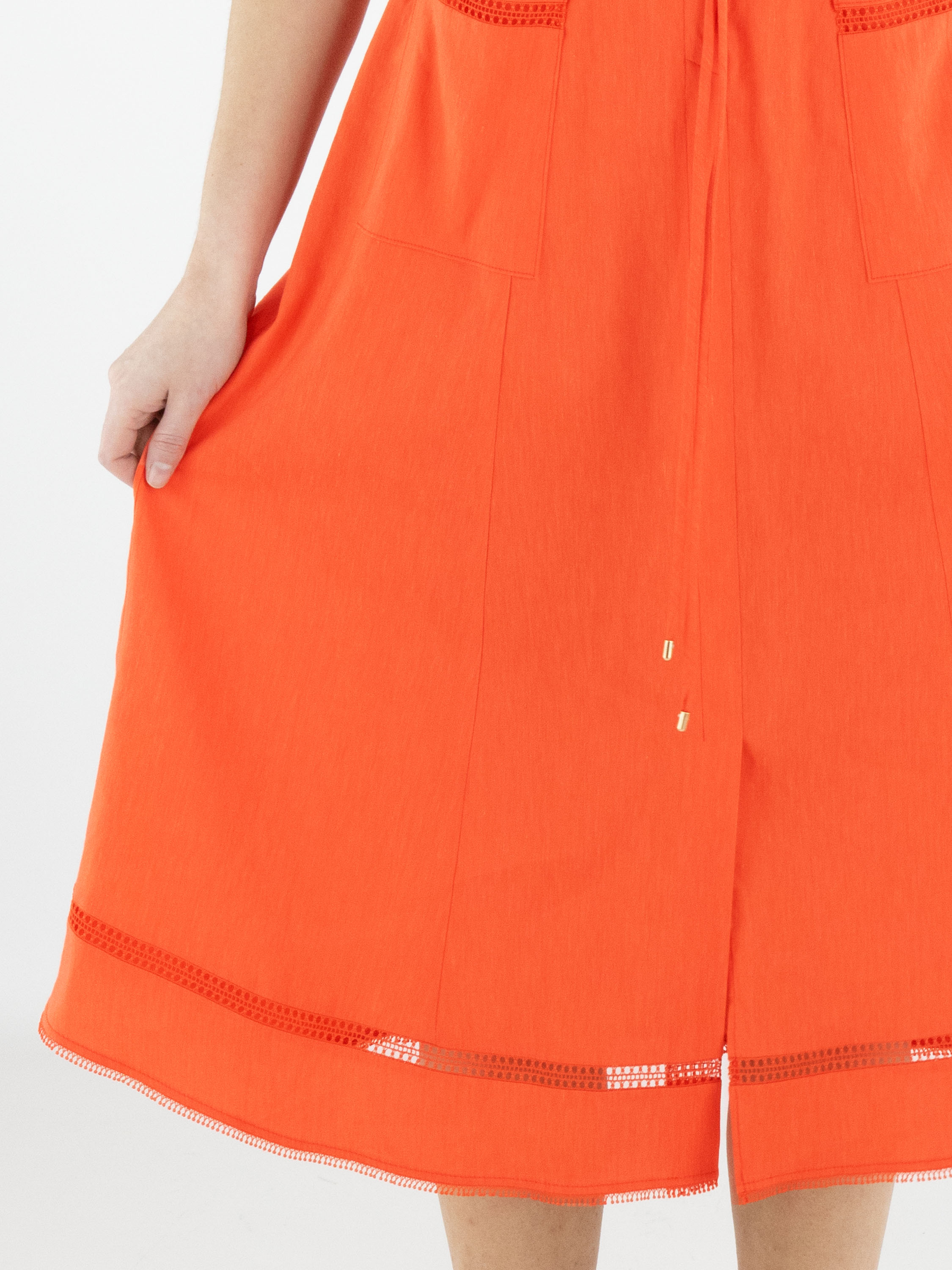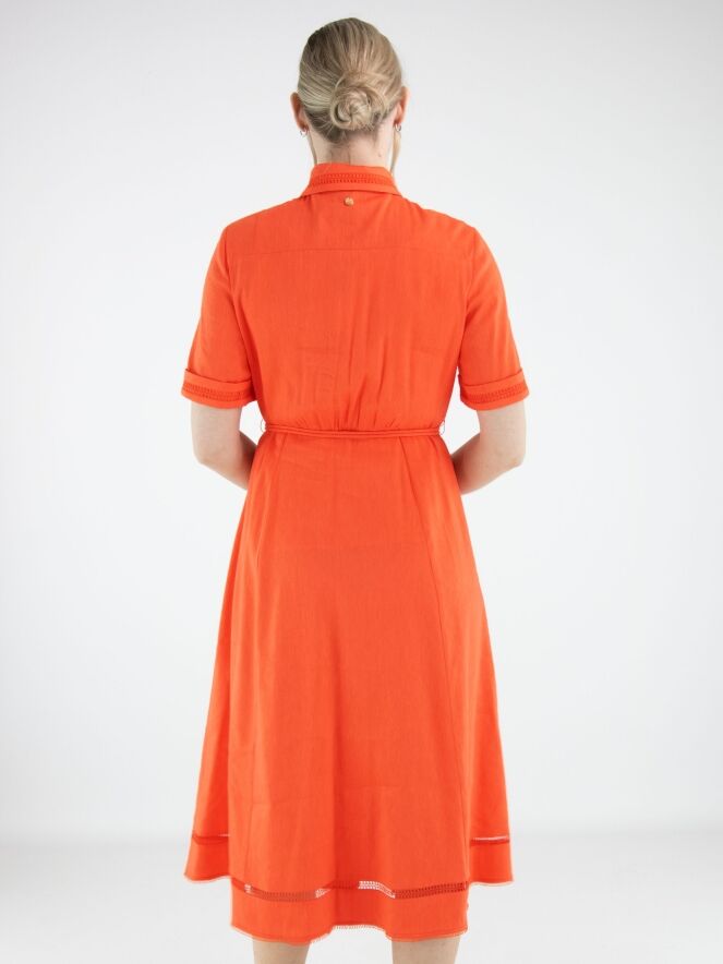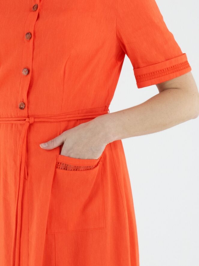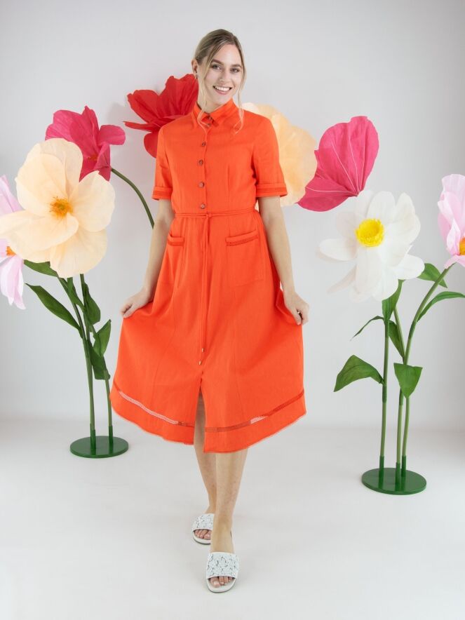 Kleid von Marc Cain in einem frischen Korallrot. Eine feine Ajourborte ziert den Kragenrand, die Umschläge der kurzen Ärmel, die Taschenkanten sowie den Saum und setzt einen femininen Akzent. Die Knopfleiste reicht bis unter die Taille. Ein Bindegürtel aus dem gleichen Stoff betont die Taille stilvoll. Ab der Taille fällt das Kleid in einer leichten A-Linie. Dieses Kleid kann bei 30 Grad gewaschen werden.