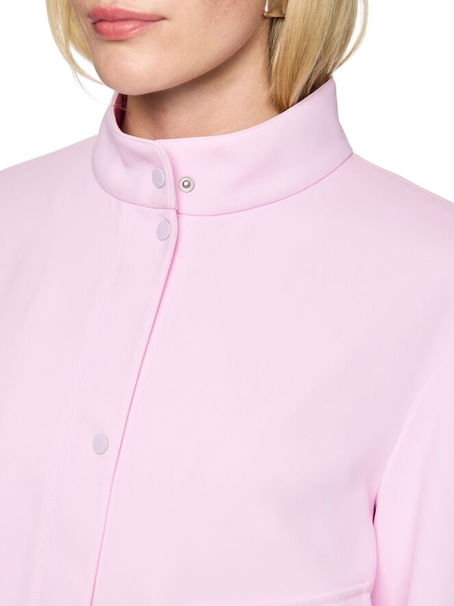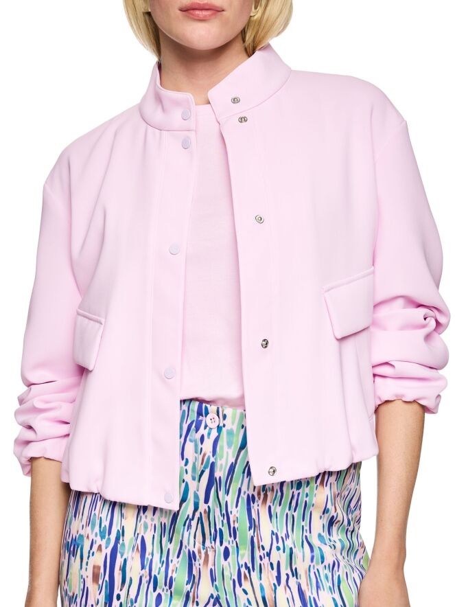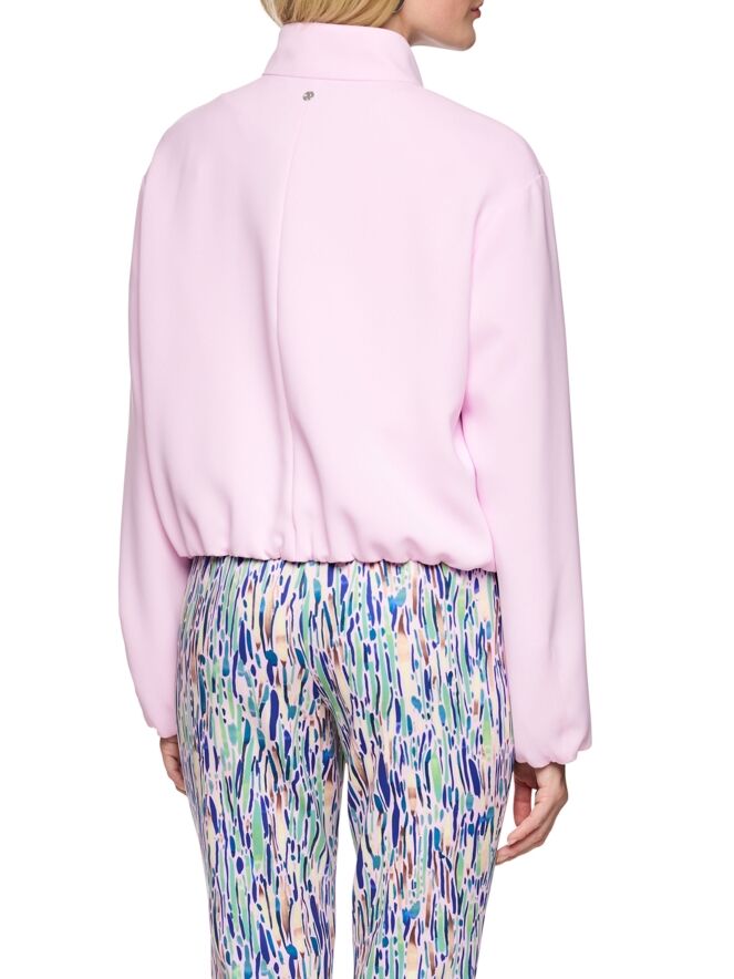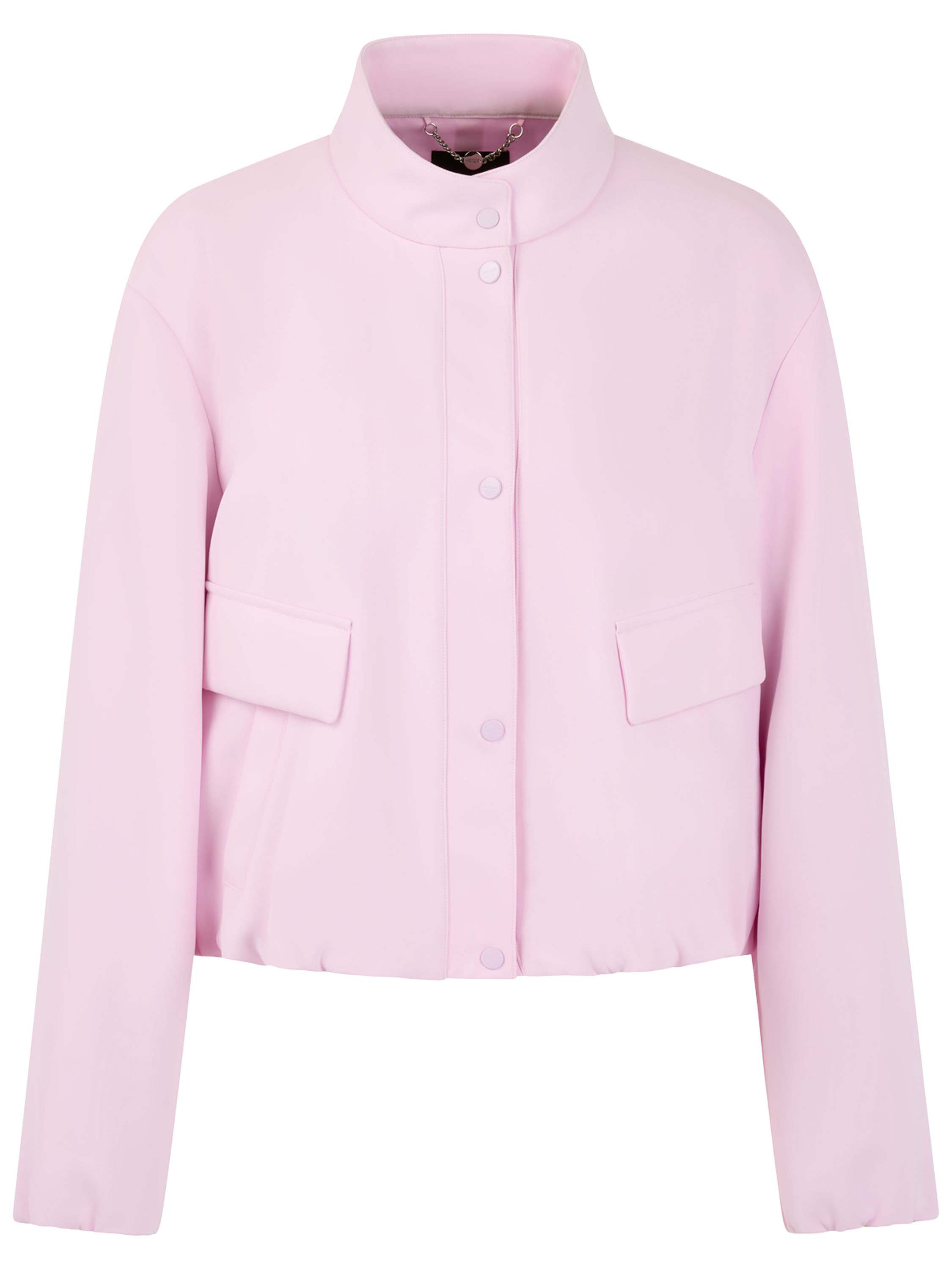 Ein kurzer Blazer von Marc Cain in einem leuchtenden Rosaton. Der Verschluss ist mit fünf Druckknöpfen gearbeitet. Am Saum und an den Ärmelabschlüssen befindet sich ein fein plissiertes elastisches Bündchen. Die Seitentaschen auf Taillenhöhe sind mit dekorativen Umschlägen versehen. Dieser Blazer kann bei 30 Grad gewaschen werden.