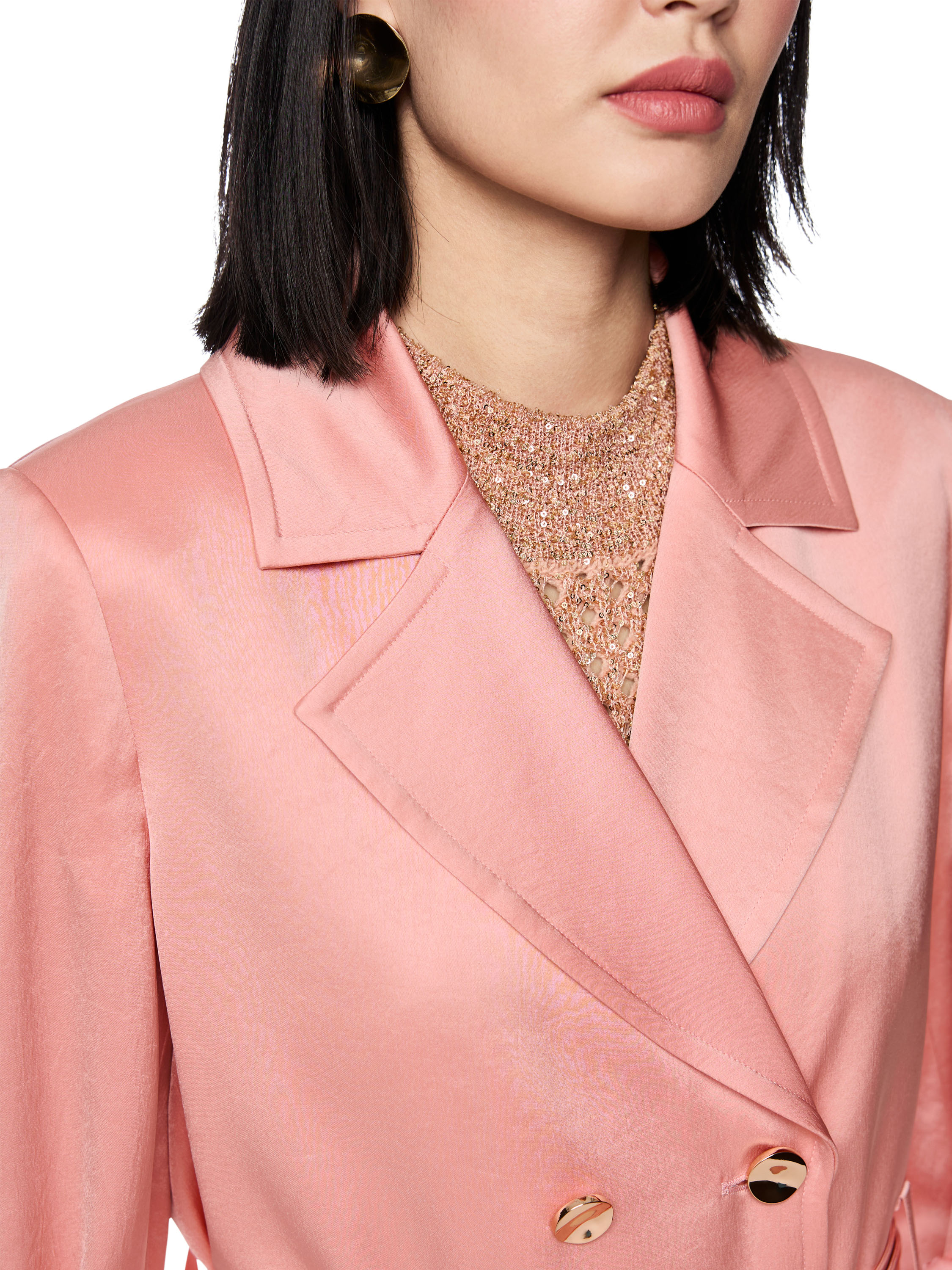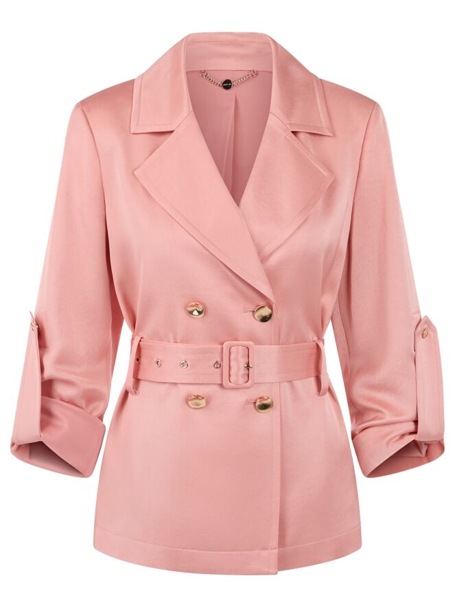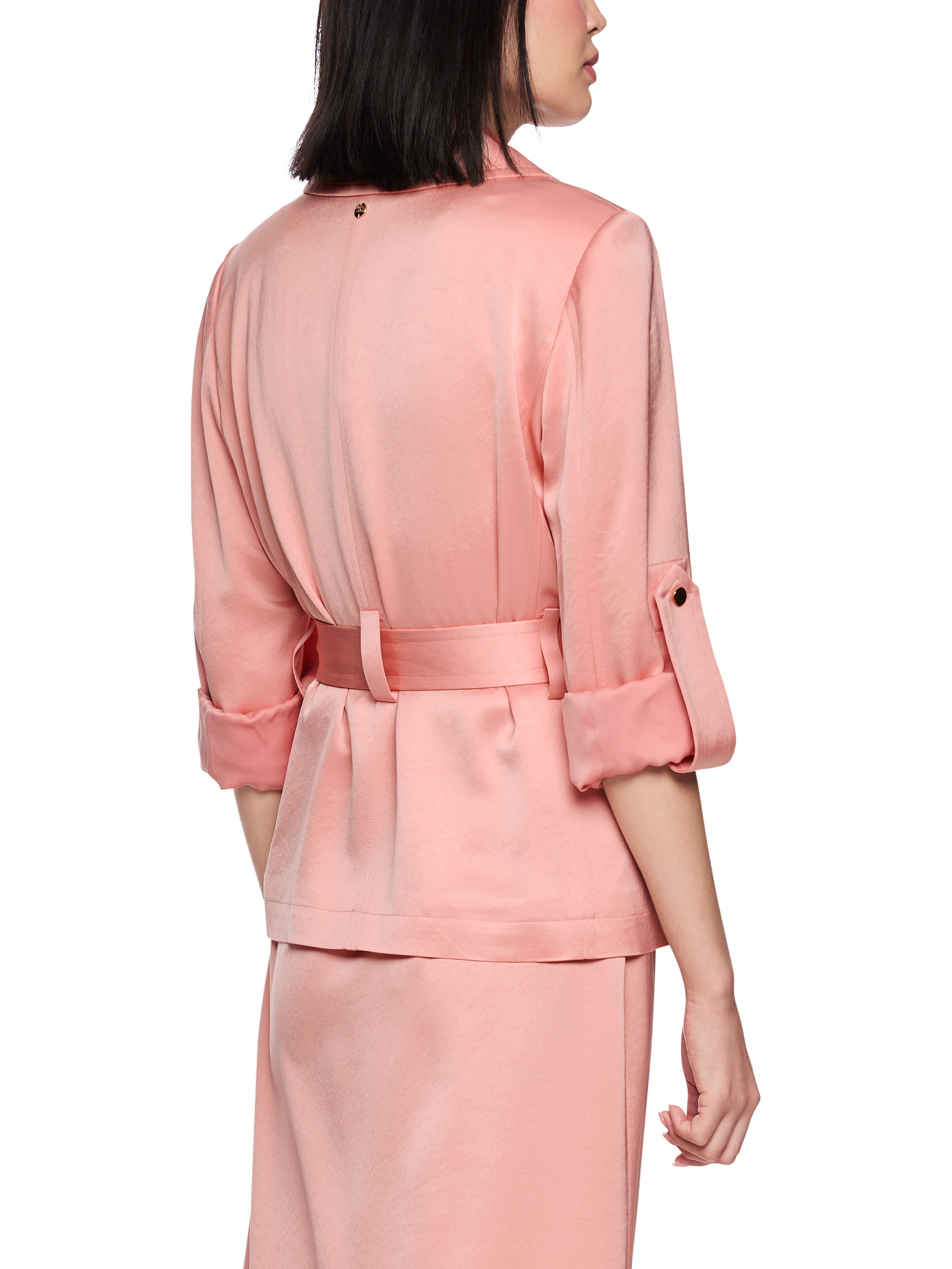 Ein doppelt geknöpfter Blazer von Marc Cain aus einem matt satinierten Stoff in Lachsrosa. Der Blazer hat dekorative goldfarbene Knöpfe. Auf Taillenhöhe befindet sich ein Gürtel aus dem gleichen Stoff wie der Blazer. In den Ärmeln ist eine Schnalle eingearbeitet, mit der umgeschlagene Ärmel per Druckknopf fixiert werden können. Der Blazer ist gefüttert und darf nicht gewaschen werden.