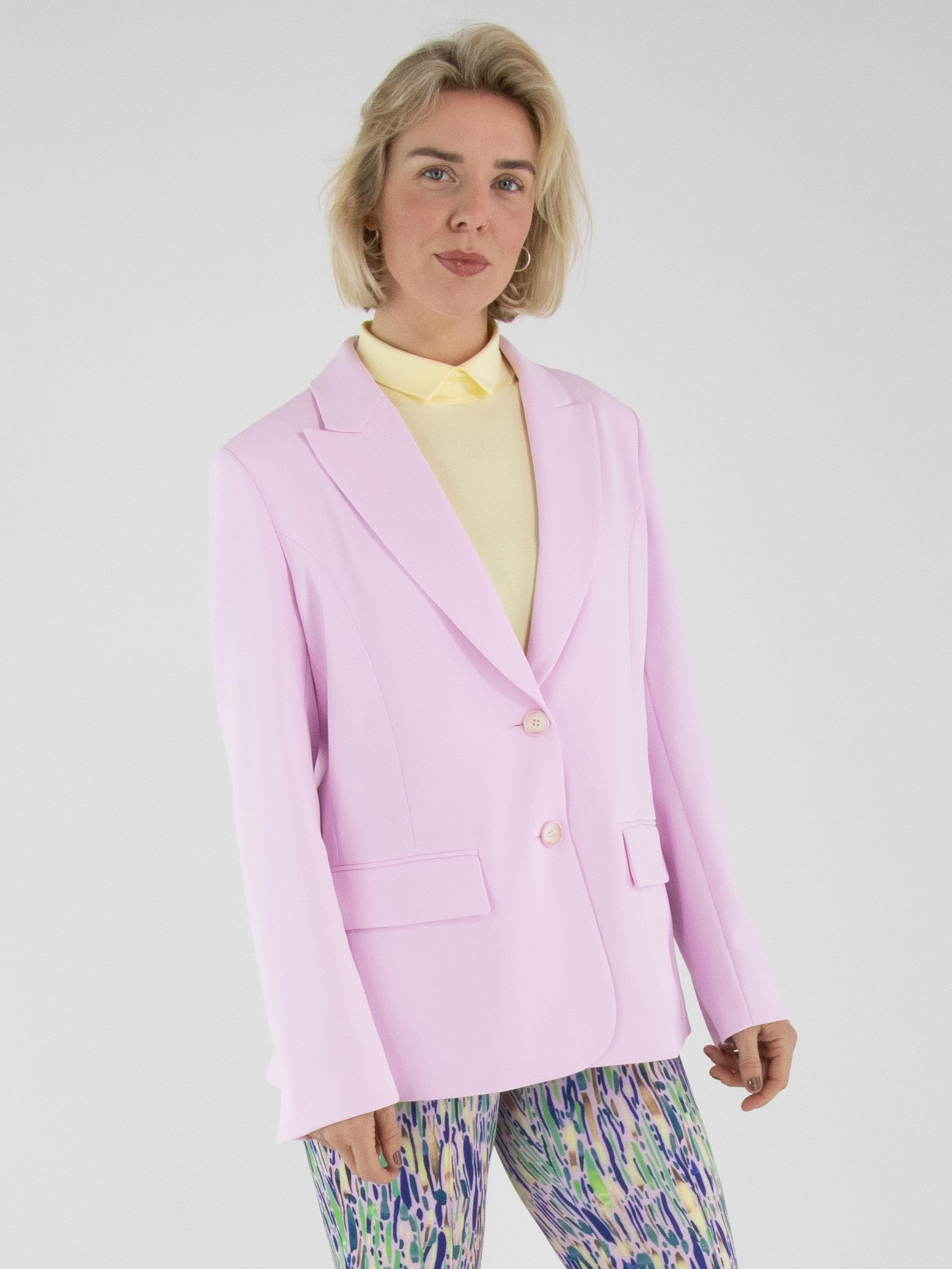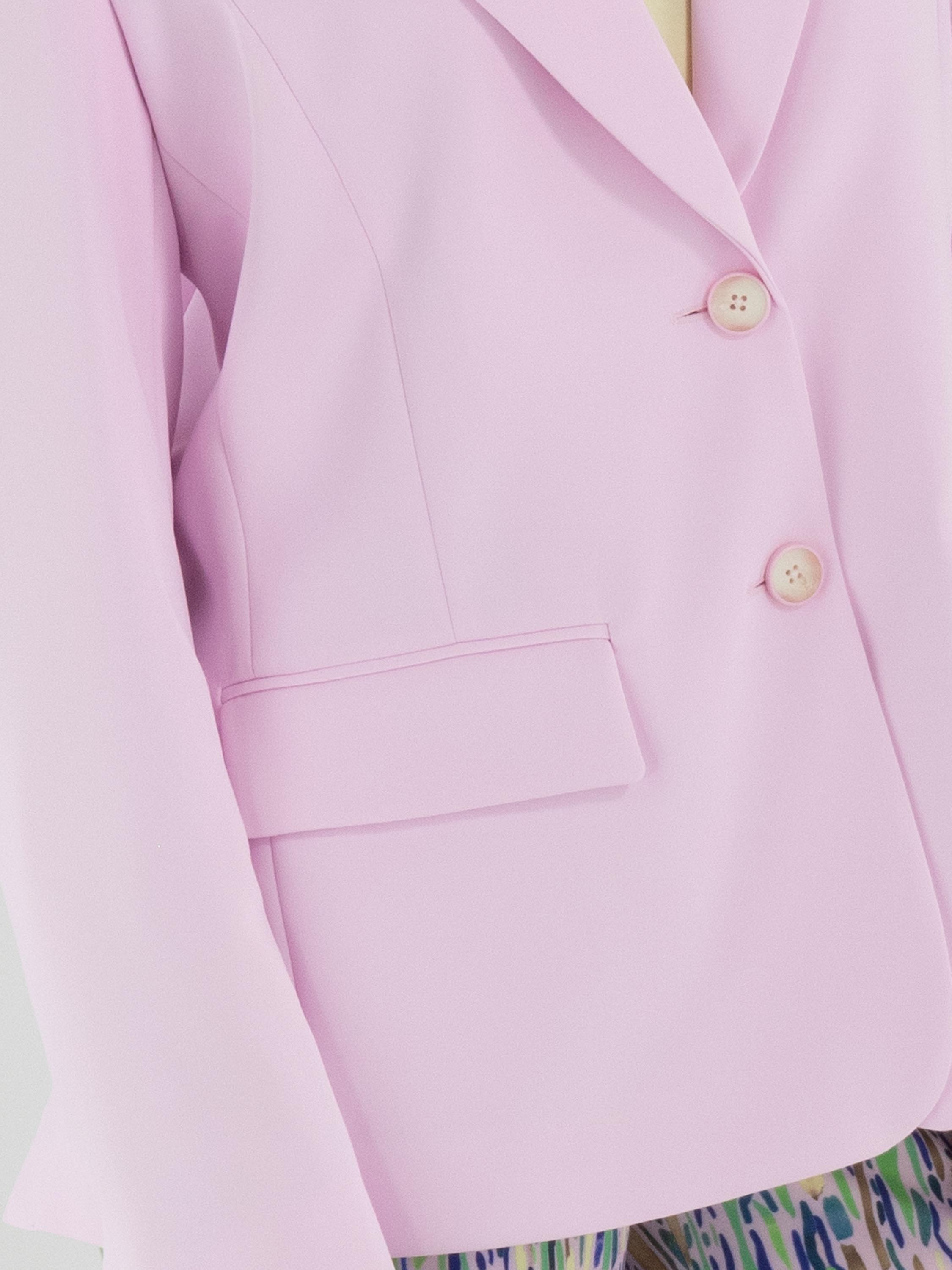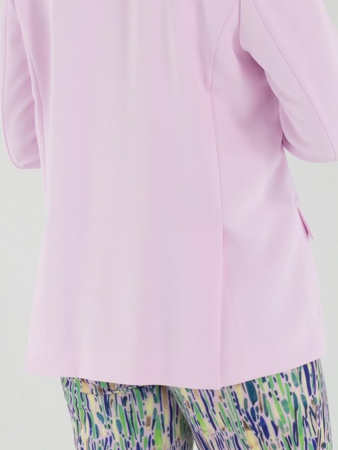 Ein Blazer von Marc Cain in einem leuchtenden Rosaton. Der Blazer hat einen Verschluss mit zwei Knöpfen. Die Manschetten der langen Ärmel sind mit einem kurzen Schlitz versehen. Auf der Rückseite befinden sich am unteren Saum beidseitig der Mitte zwei Schlitze. Dieser Blazer darf nicht gewaschen werden.