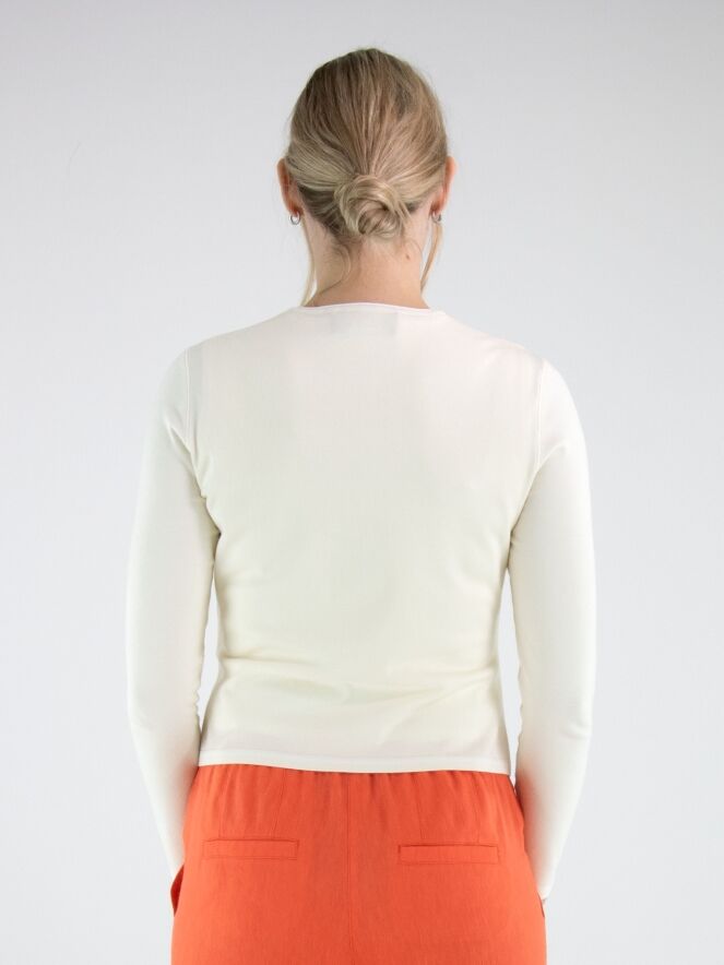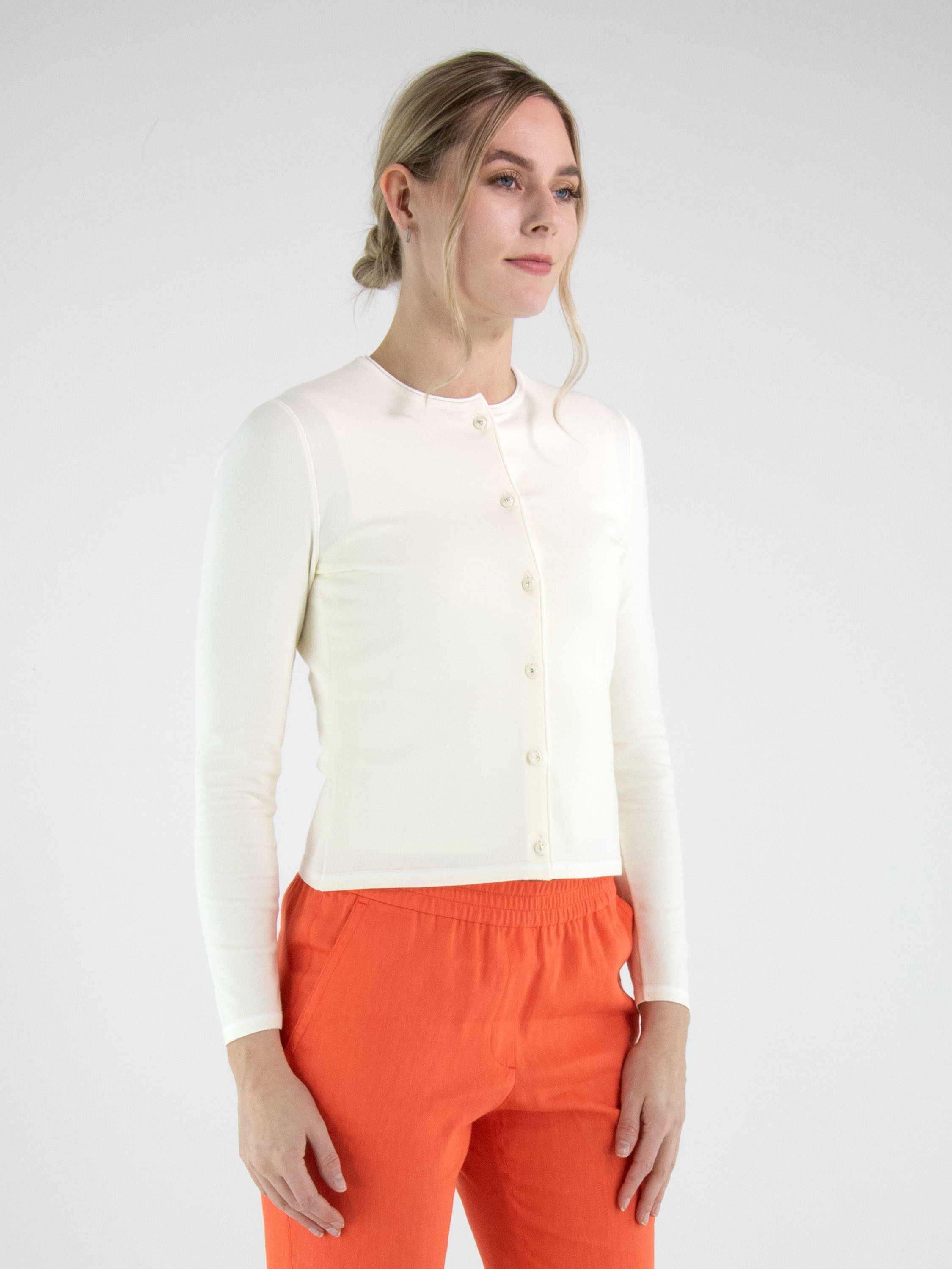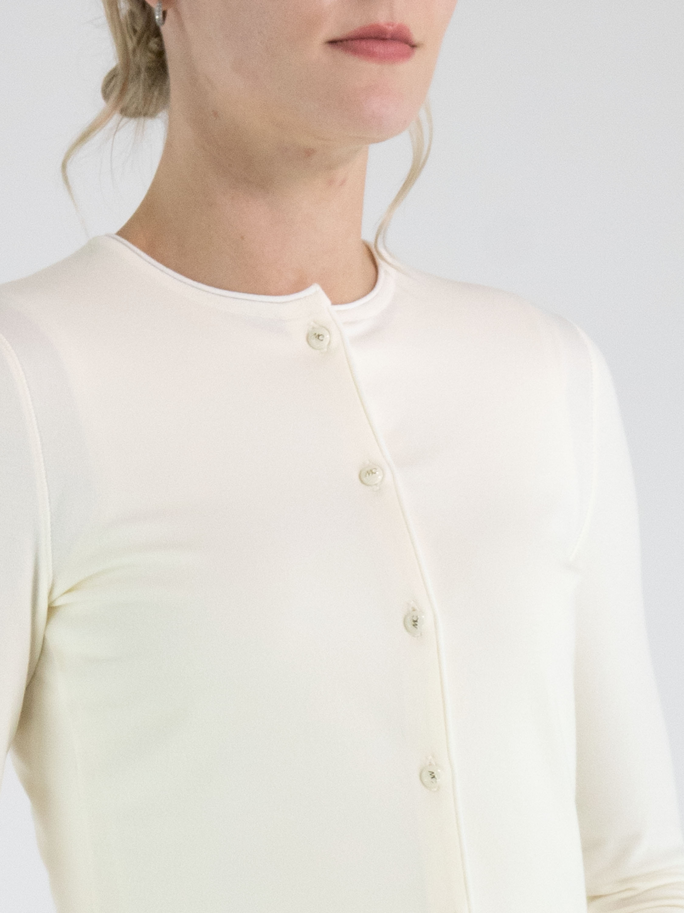 Strickjacke von Marc Cain in einem eleganten Cremeweiß. Ein fein gerippter Strickbund mit dezent gedrucktem weißen Streifen ziert den Rundhalsausschnitt, die Ärmelabschlüsse und den Saum und setzt einen stilvoll-sportiven Akzent. Das Modell verfügt über eine Knopfleiste und kann bei 30 Grad gewaschen werden.