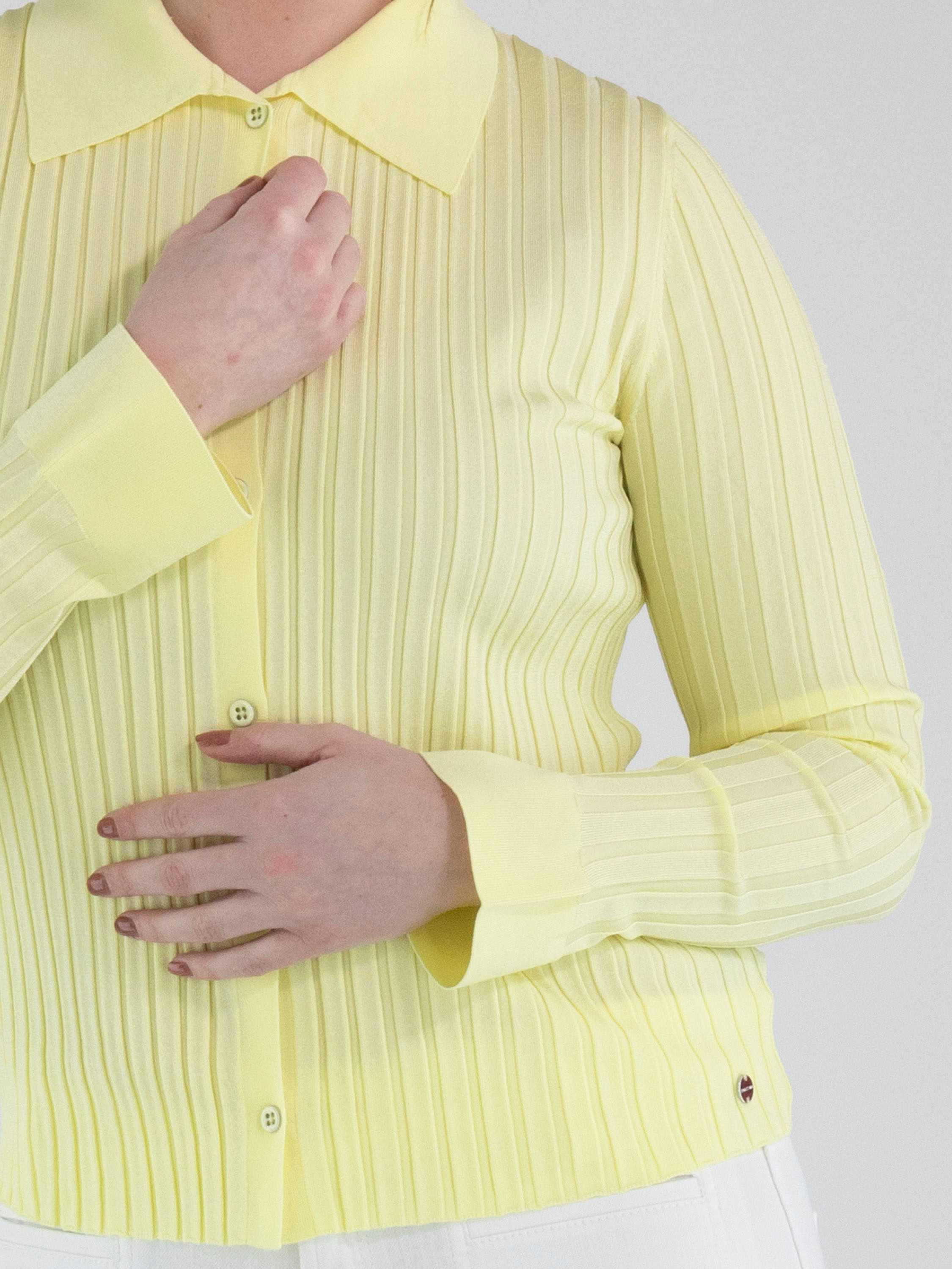 Ein Cardigan von Marc Cain in Pastellgelb. Der Stoff ist breit gerippt. Der Kragen sowie die Abschlüsse der langen Ärmel sind fein gerippt gearbeitet. Dieser Cardigan kann von Hand gewaschen werden.