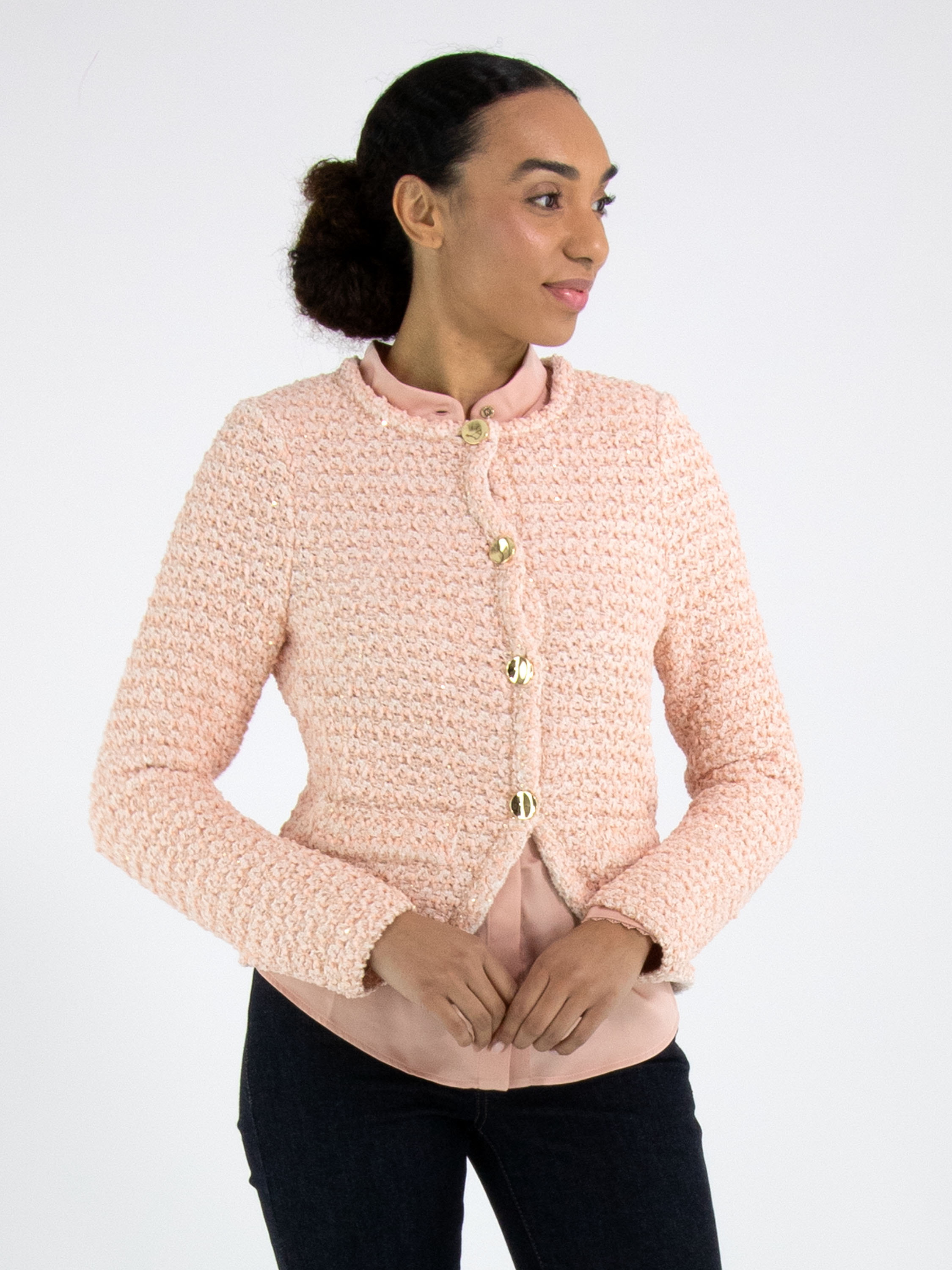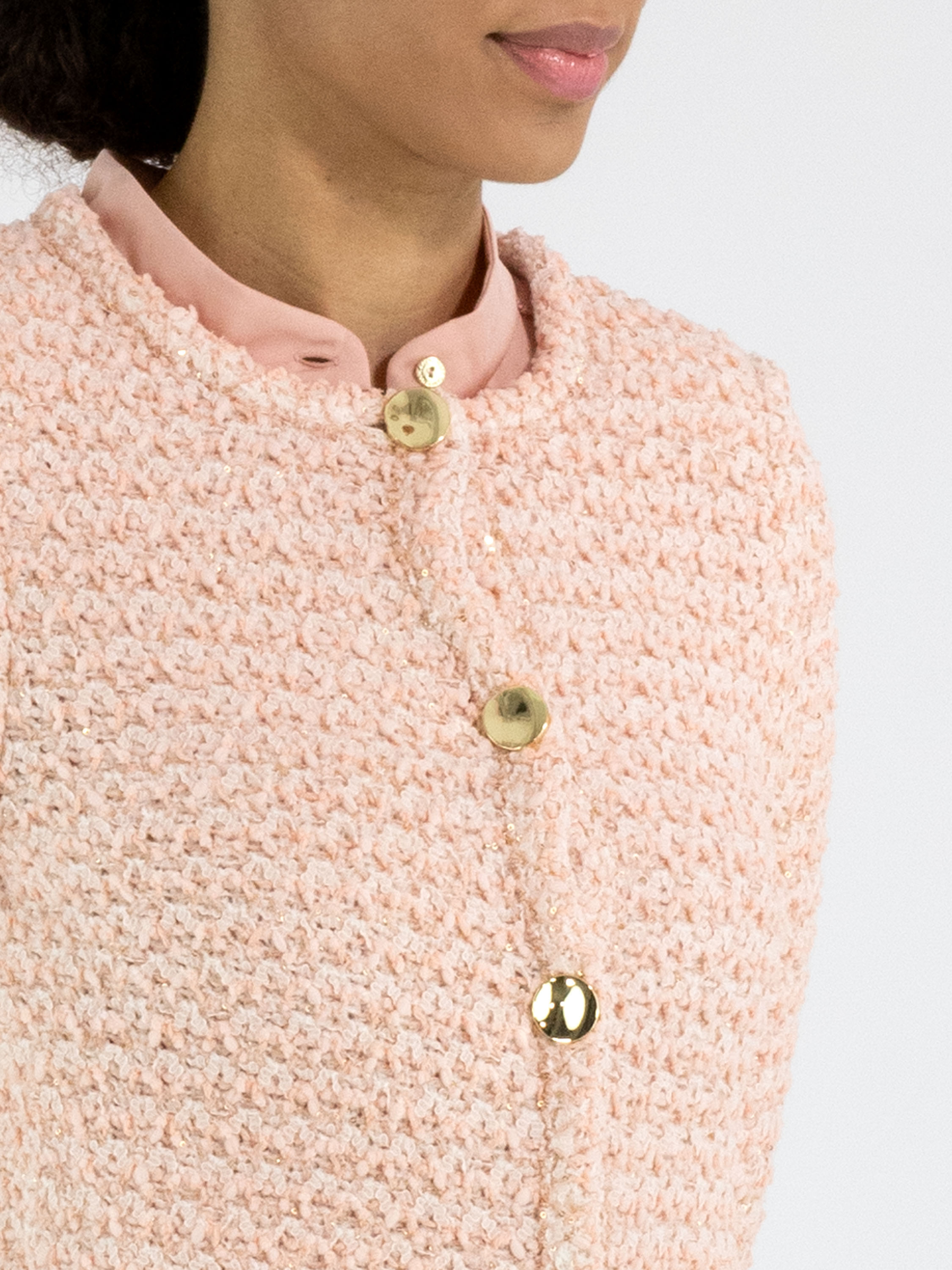 Ein Chanel-Blazer von Marc Cain aus einem melierten Stoff in Lachsrosa und Cremeweiß, durchzogen von goldfarbenen Pailletten. Der Blazer hat eine Schließe mit 4 dekorativen goldfarbenen Knöpfen. Er ist ungefüttert und kann per Hand gewaschen werden.