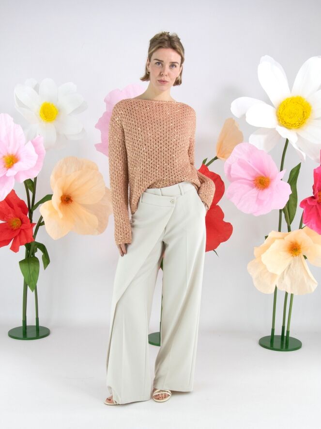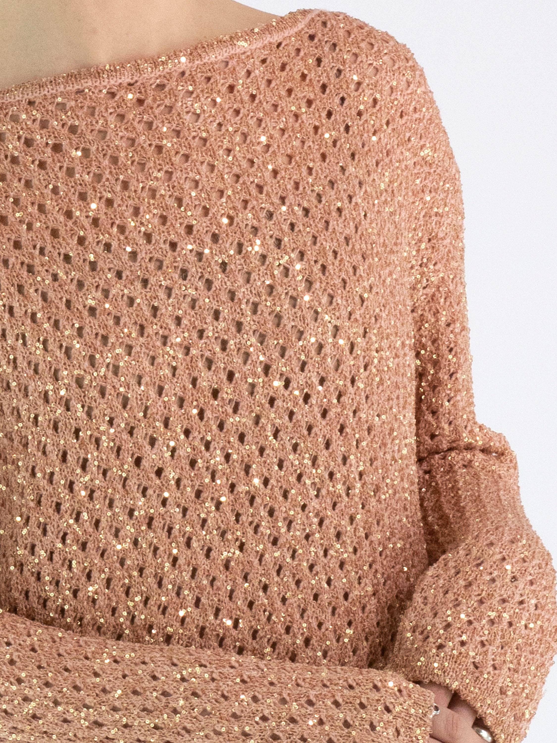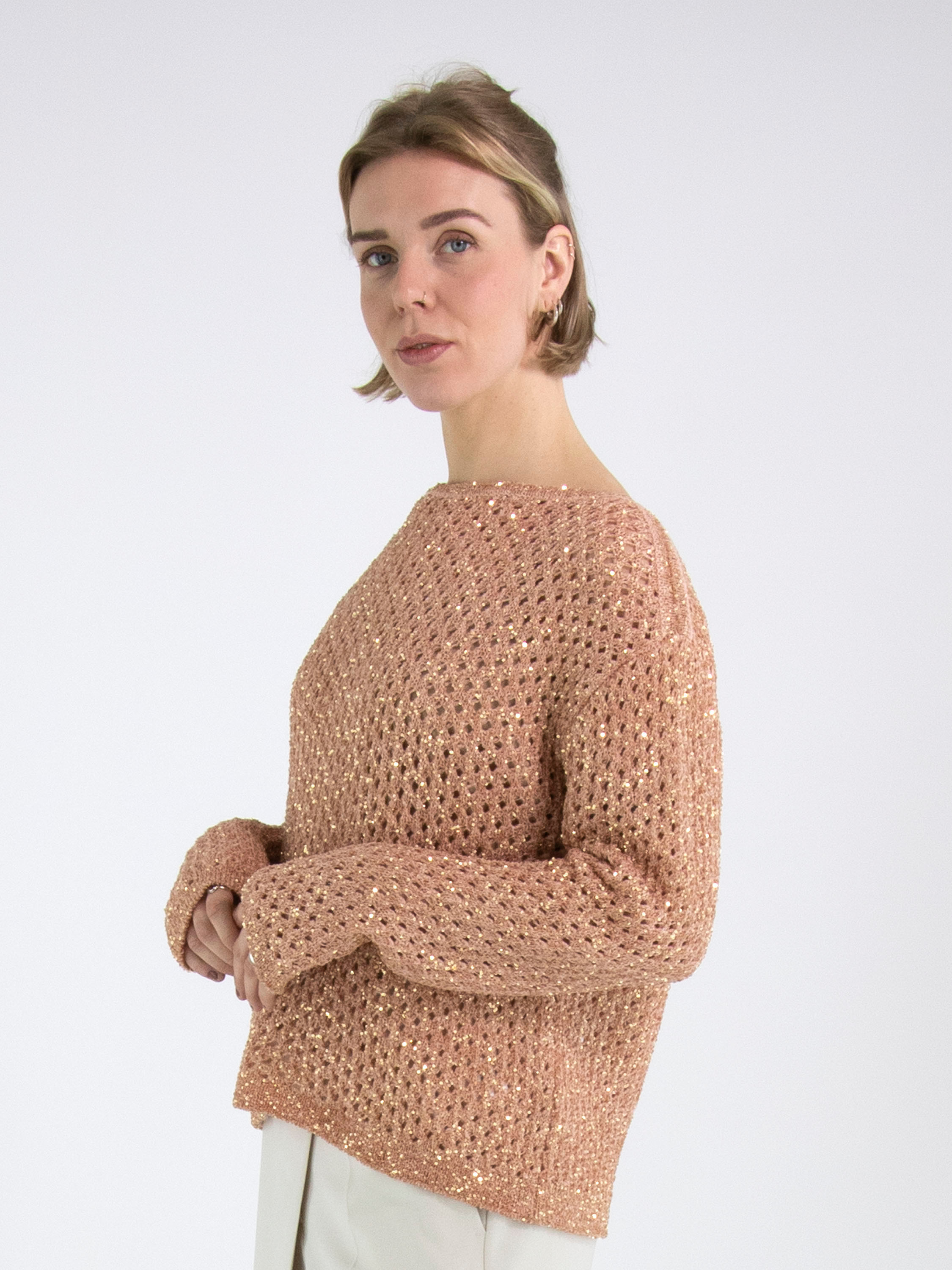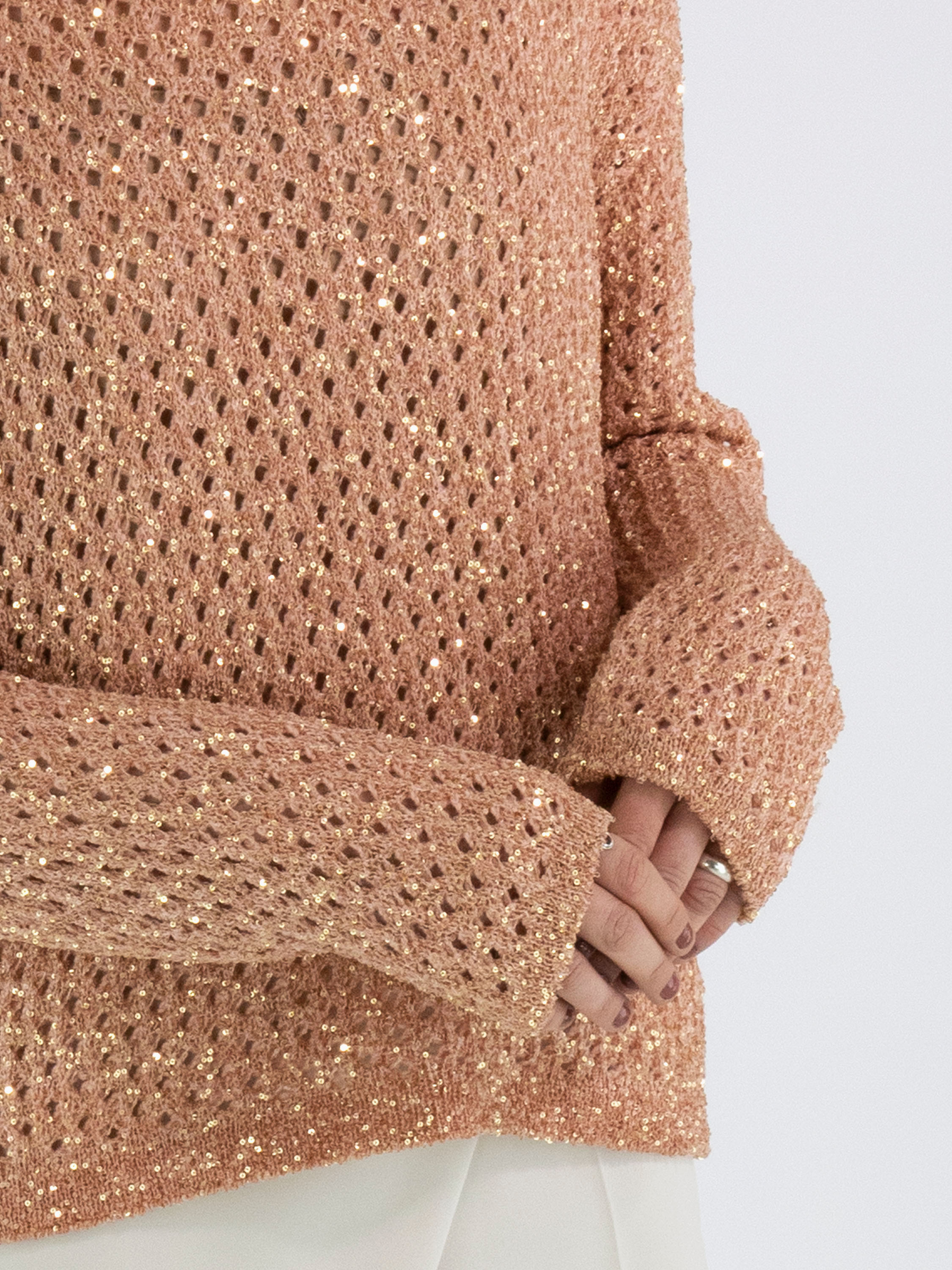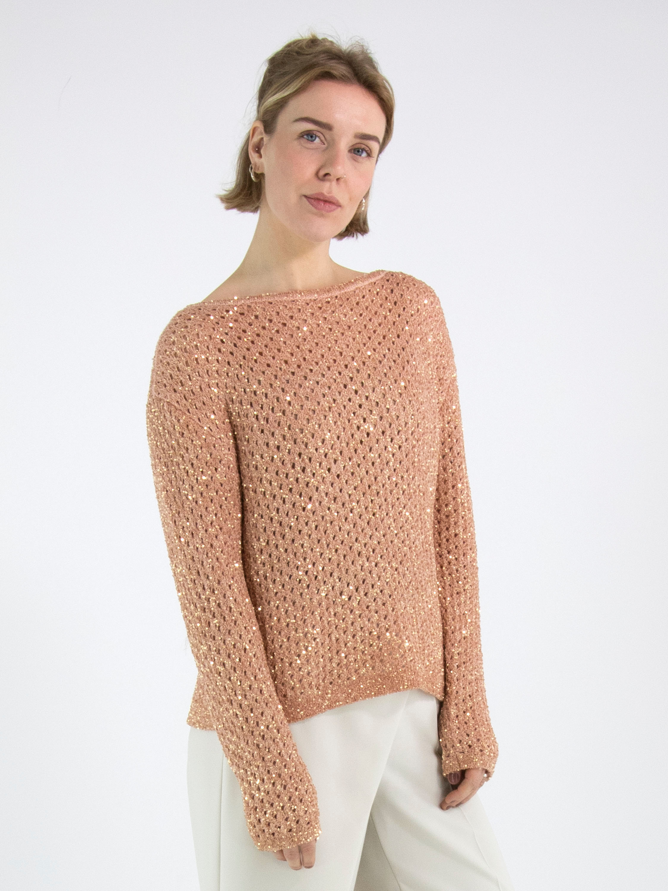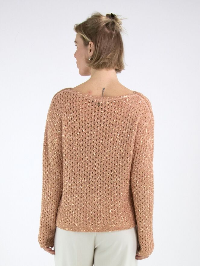 Ein offen gestrickter Pullover von Marc Cain in Lachsrosa. In den Stoff sind goldfarbene Pailletten eingearbeitet. Der Pullover hat einen Rundhalsausschnitt und kann per Hand gewaschen werden.