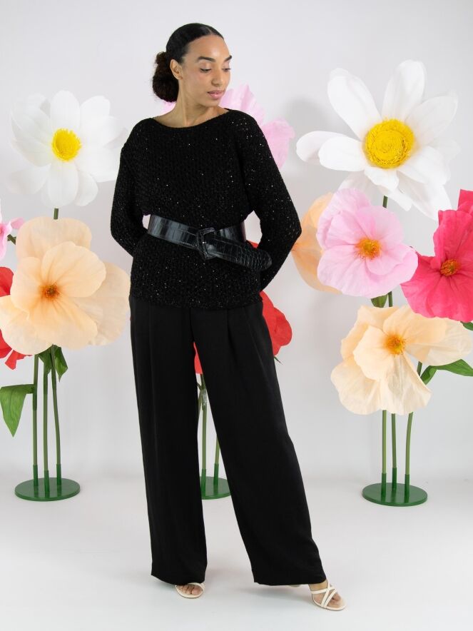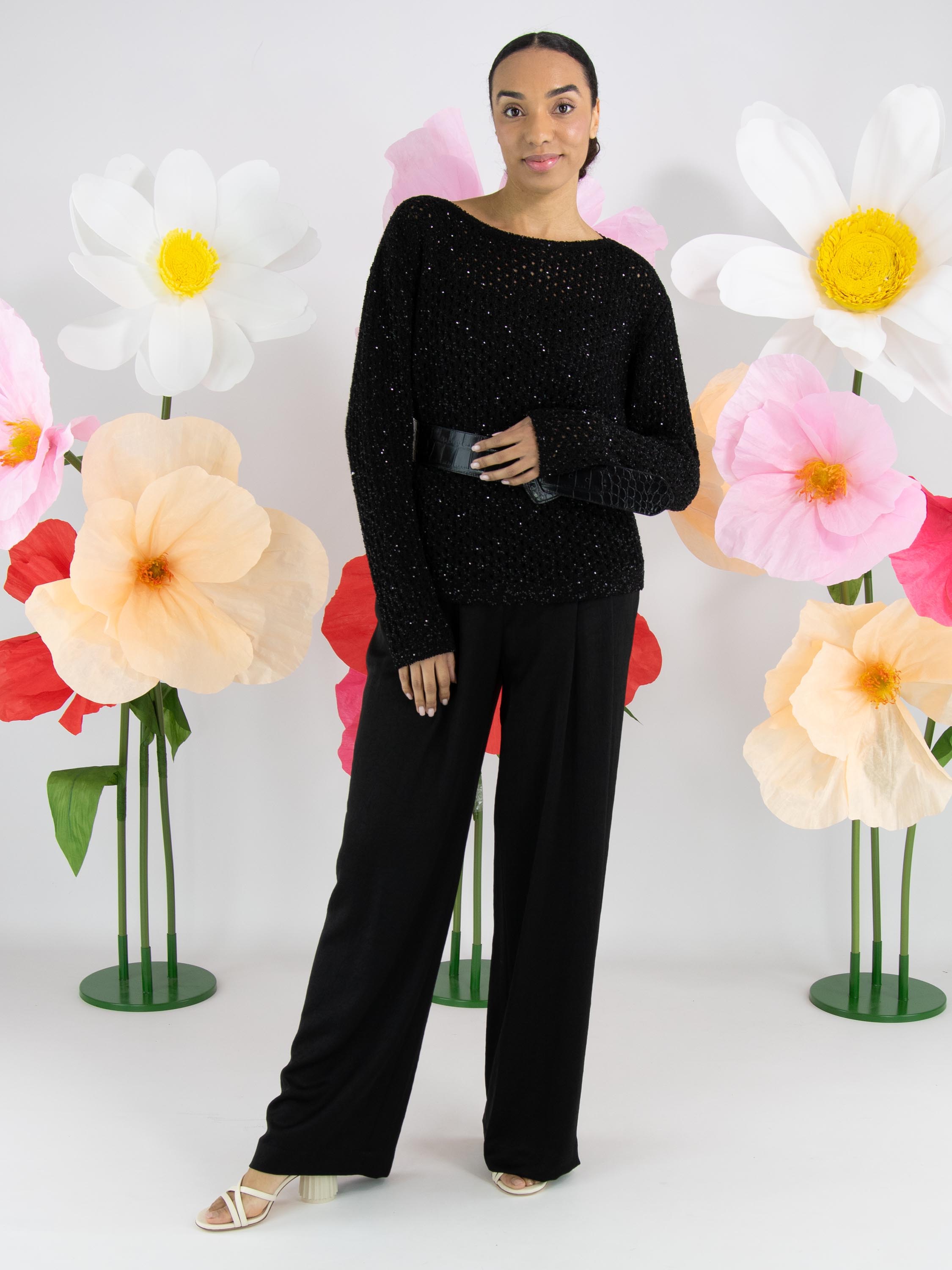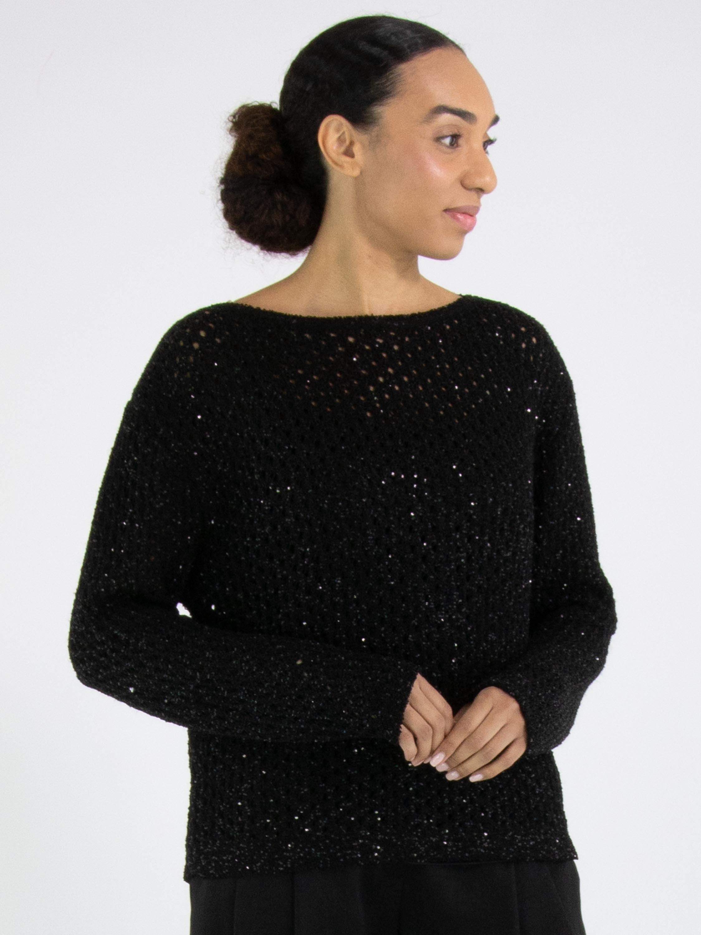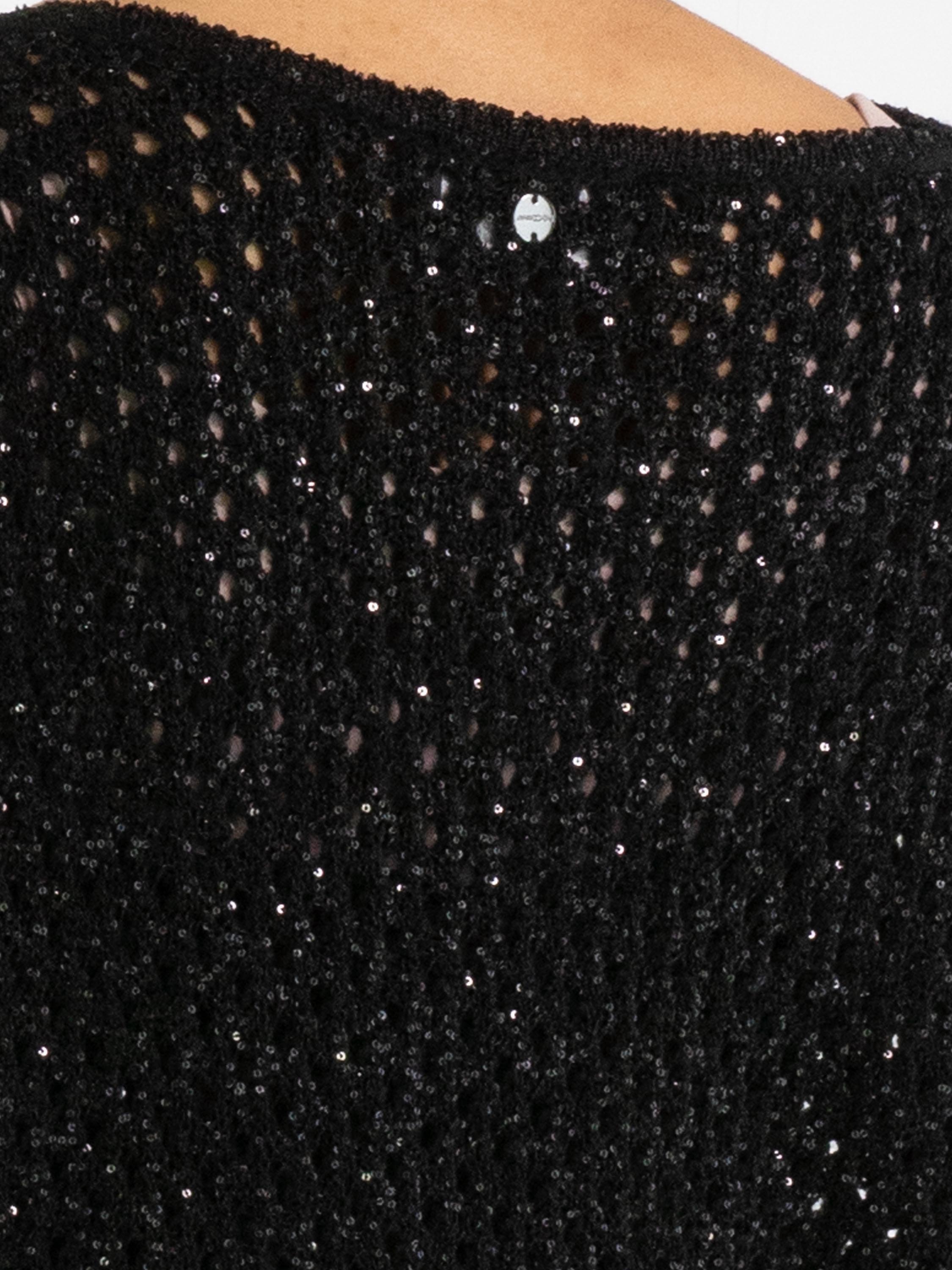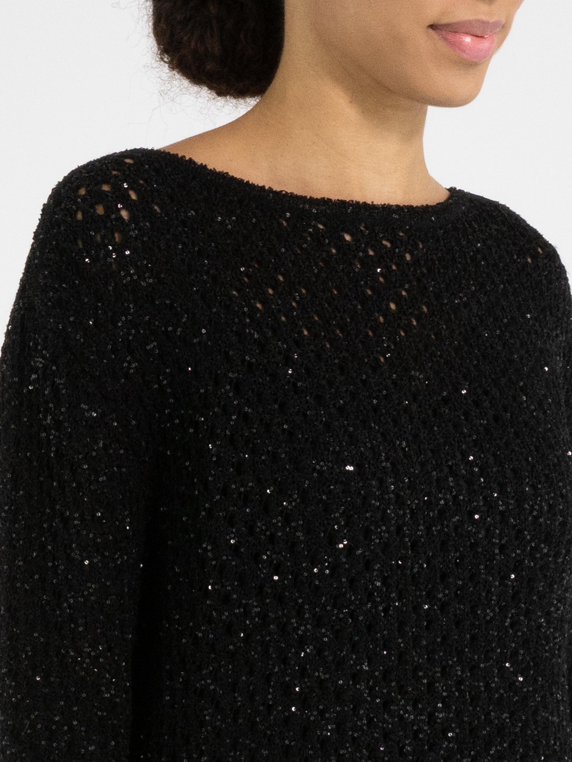 Ein offen gestrickter Pullover von Marc Cain in Schwarz. In den Stoff sind schwarze Pailletten eingewebt. Der Pullover hat einen Rundhalsausschnitt und kann per Hand gewaschen werden.