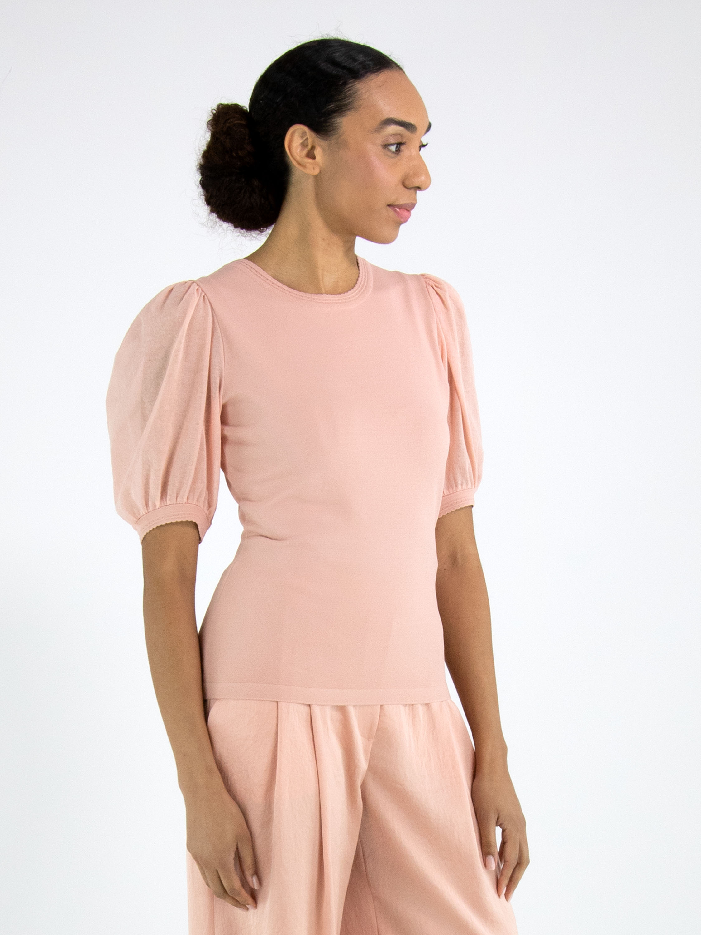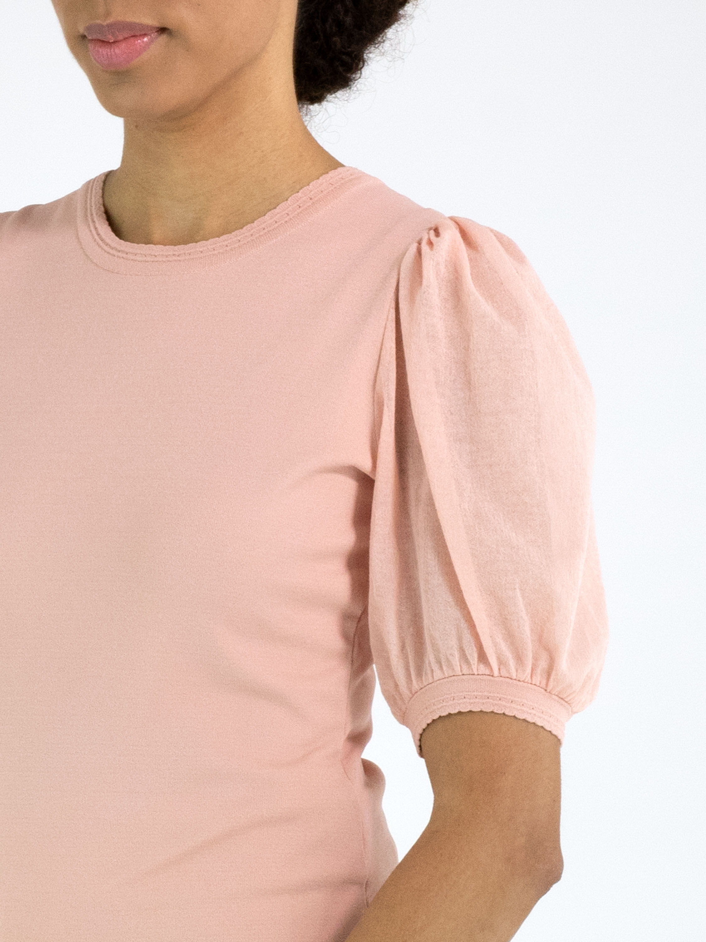 Ein Shirt von Marc Cain in Lachsrosa. Das Shirt hat leicht transparente Puffärmel, bei denen der Stoff an der Armkugel und am Ärmelabschluss fein gelegt ist. Am Rundhalsausschnitt verläuft eine muschelartige Biese. Dieses Shirt kann bei 30 Grad gewaschen werden.