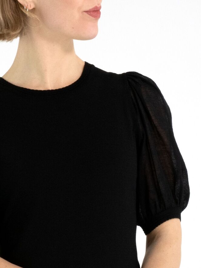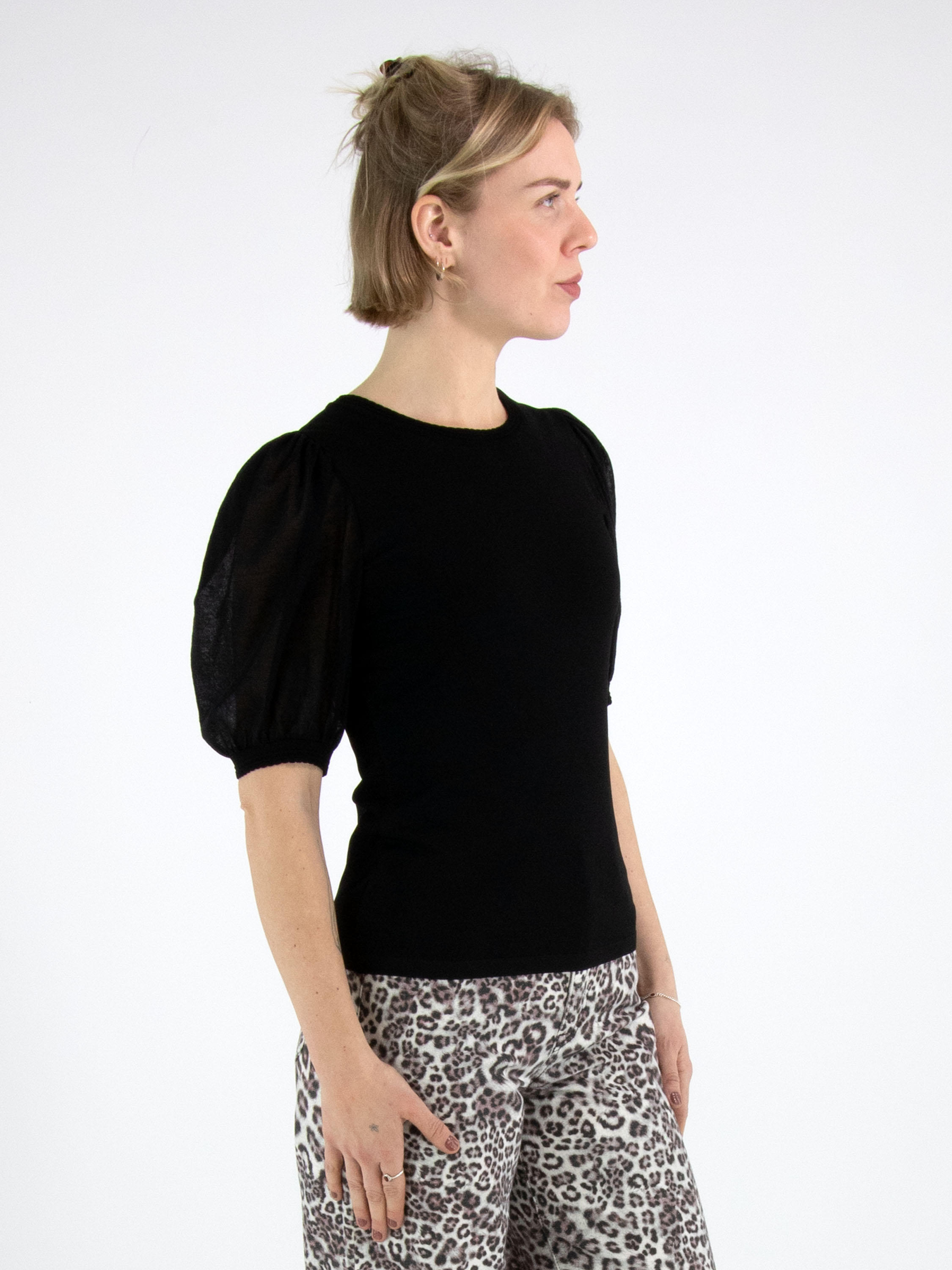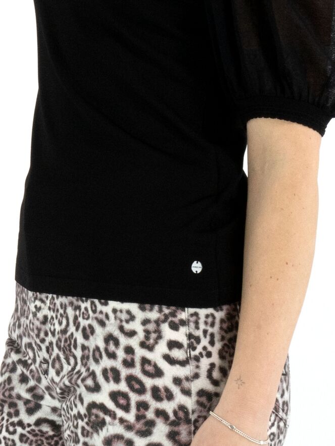 Ein Shirt von Marc Cain in Schwarz. Das Shirt hat leicht transparente Puffärmel, bei denen der Stoff an der Armkugel und am Abschluss fein gelegt ist. Entlang des Rundhalsausschnitts verläuft eine Muschelborte. Dieses Shirt kann bei 30 Grad gewaschen werden.