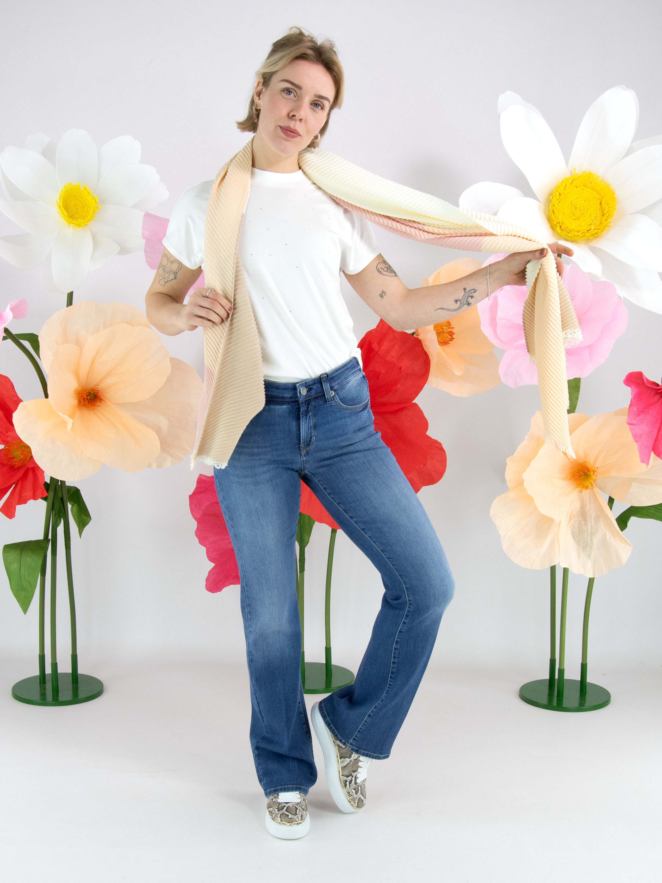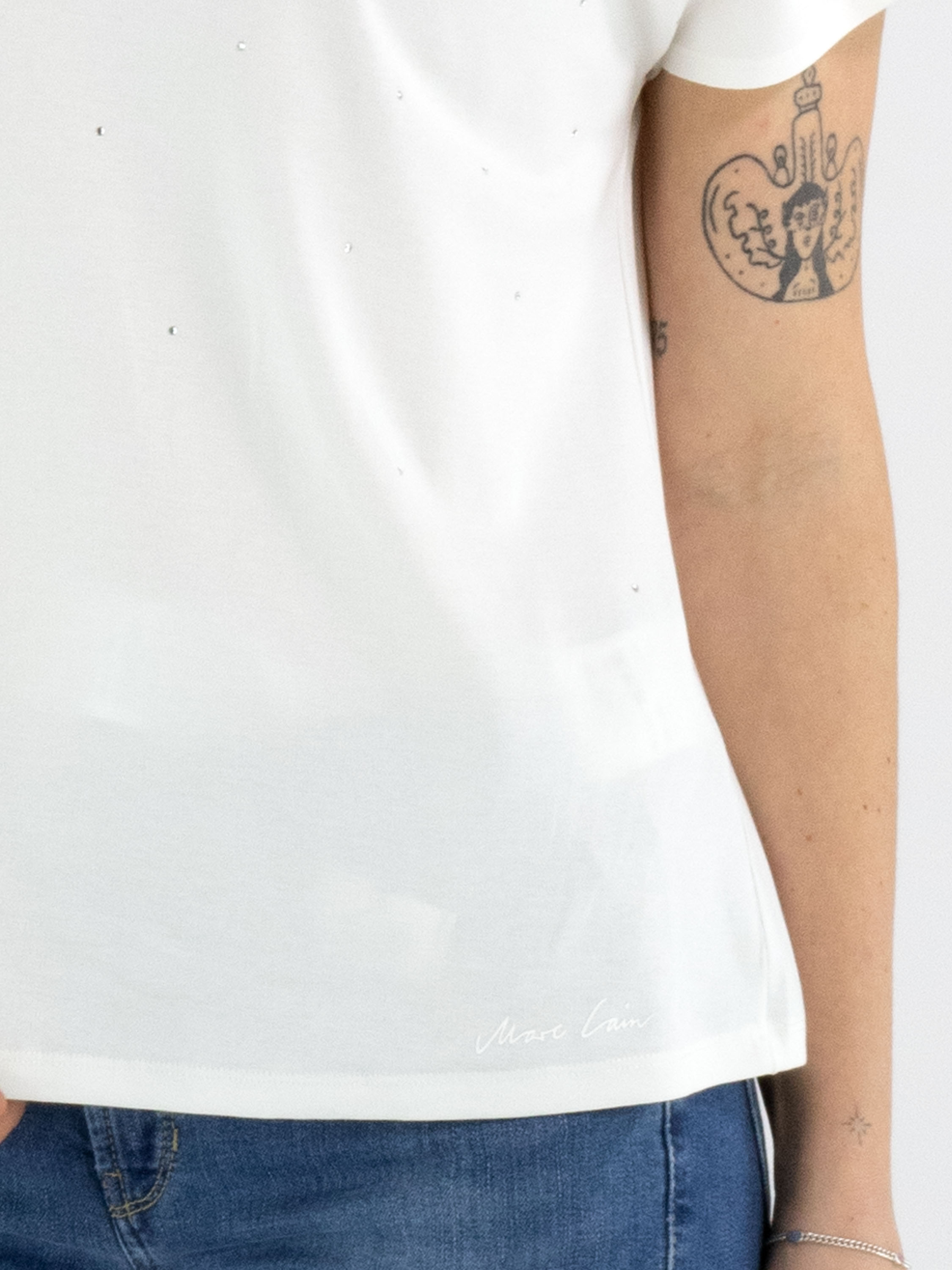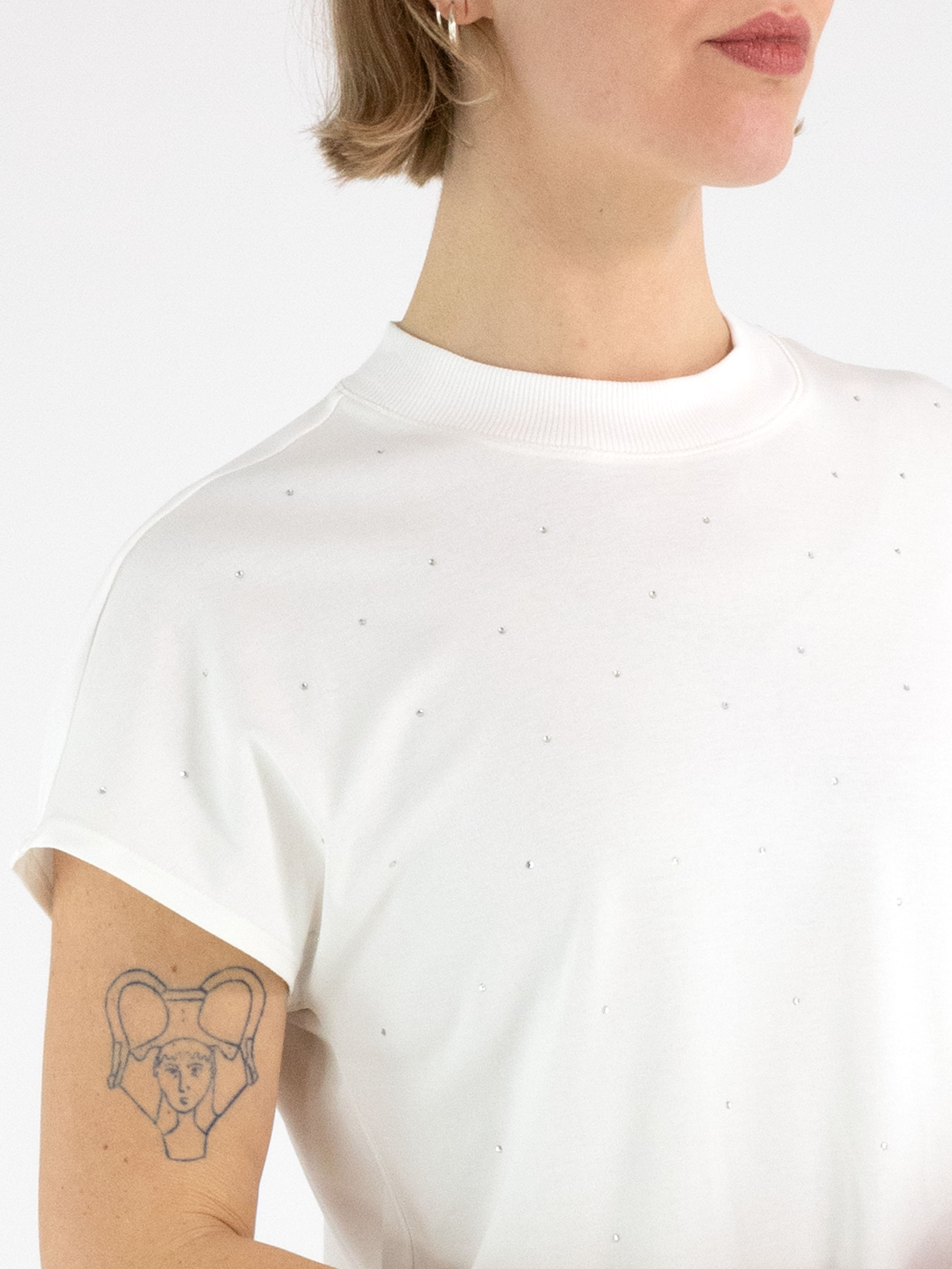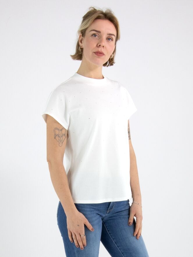 Ein Shirt von Marc Cain in Cremeweiß. Auf der Vorderseite sind dekorative Strasssteine über den Stoff verteilt. Am Rand des hohen Rundhalsausschnitts befindet sich eine fein gerippte Strickblende. Das Shirt hat eine Kappenärmel und kann bei 30 Grad gewaschen werden.