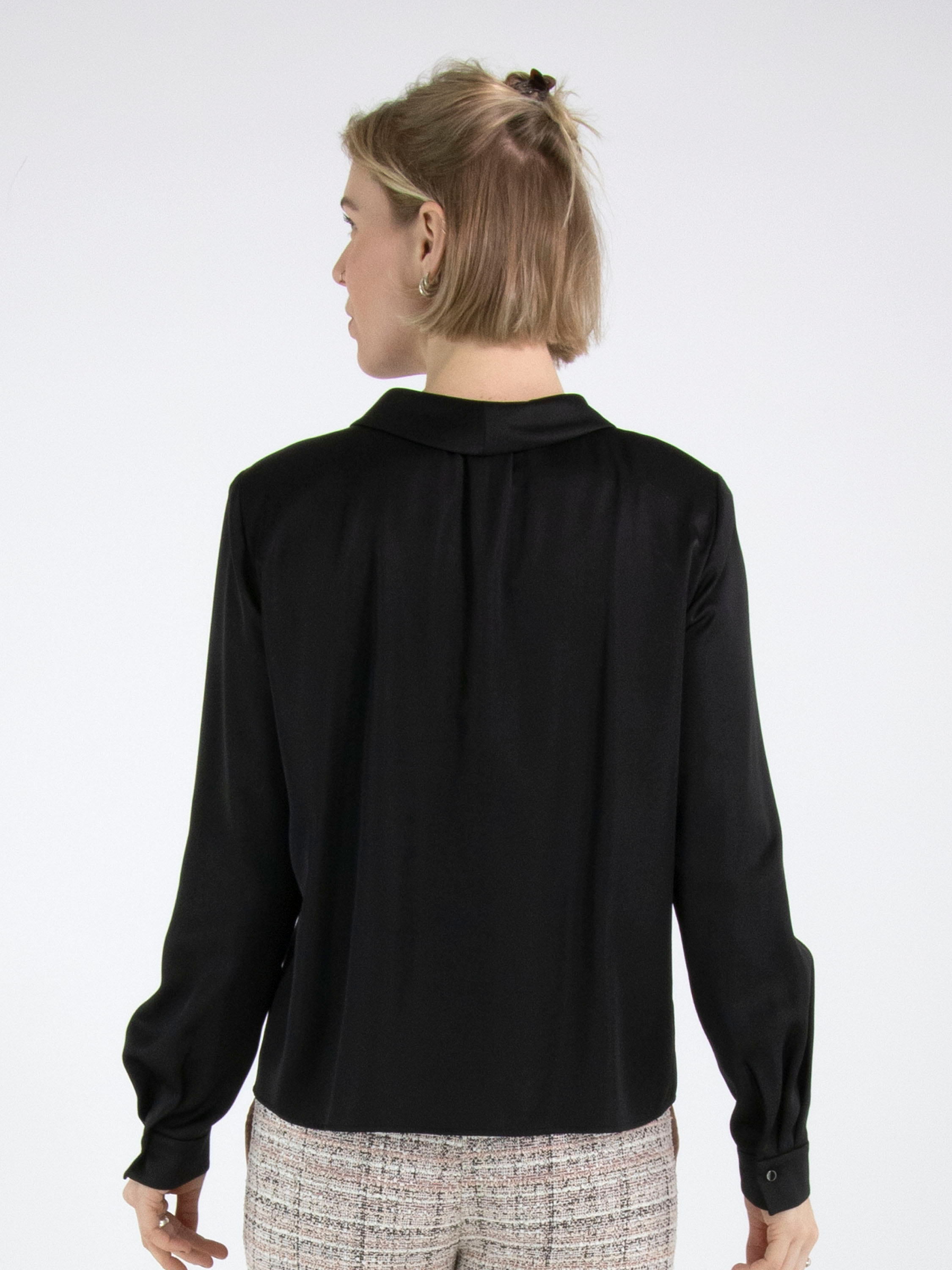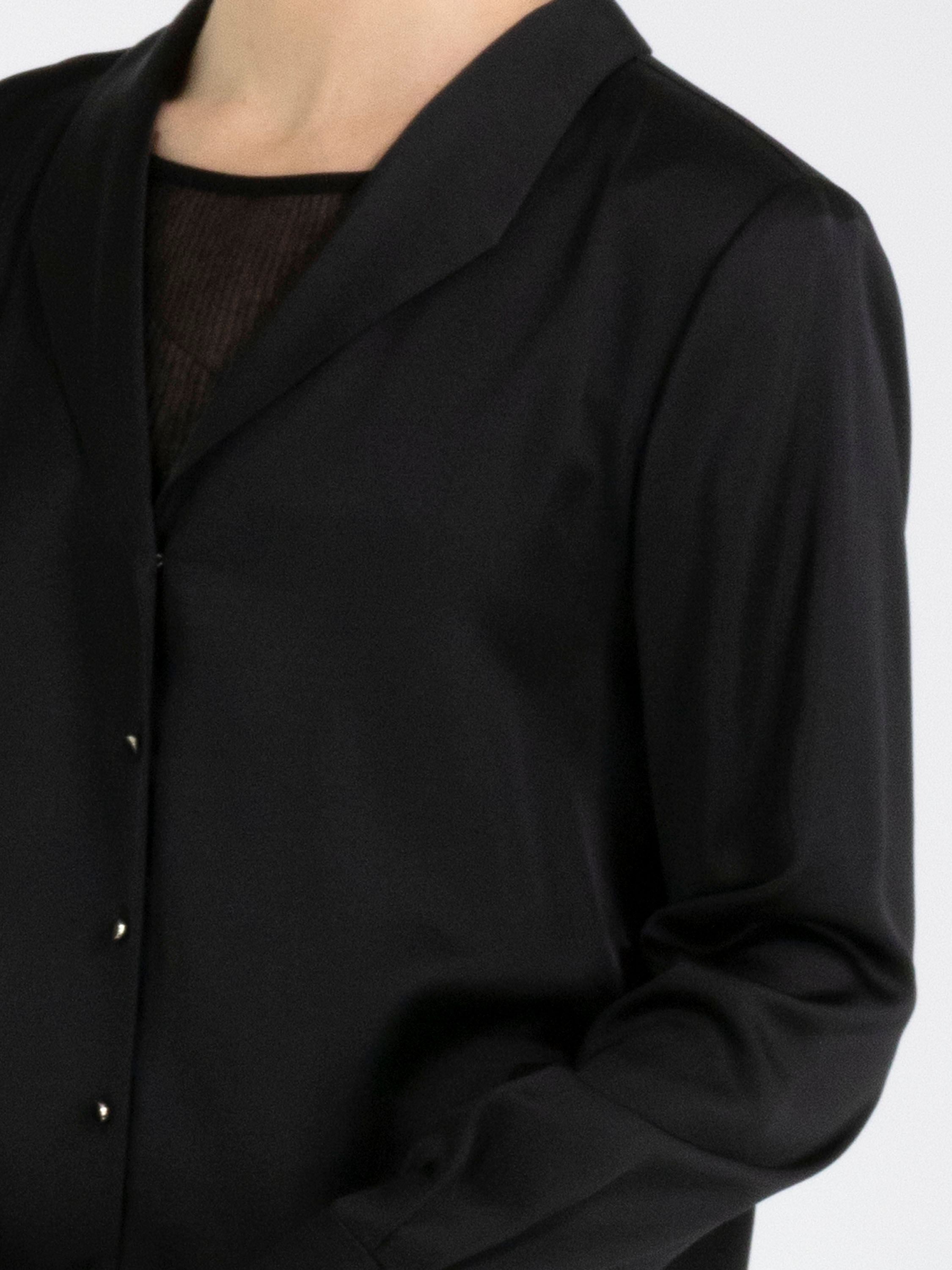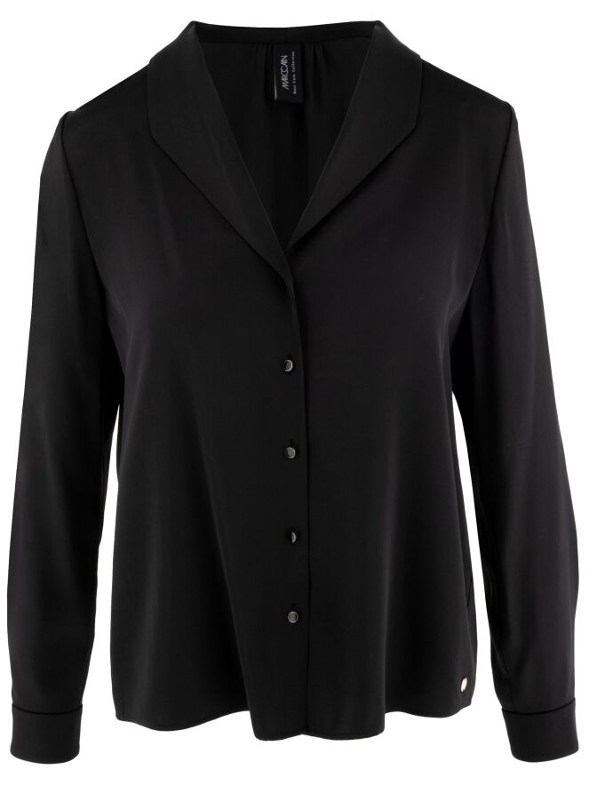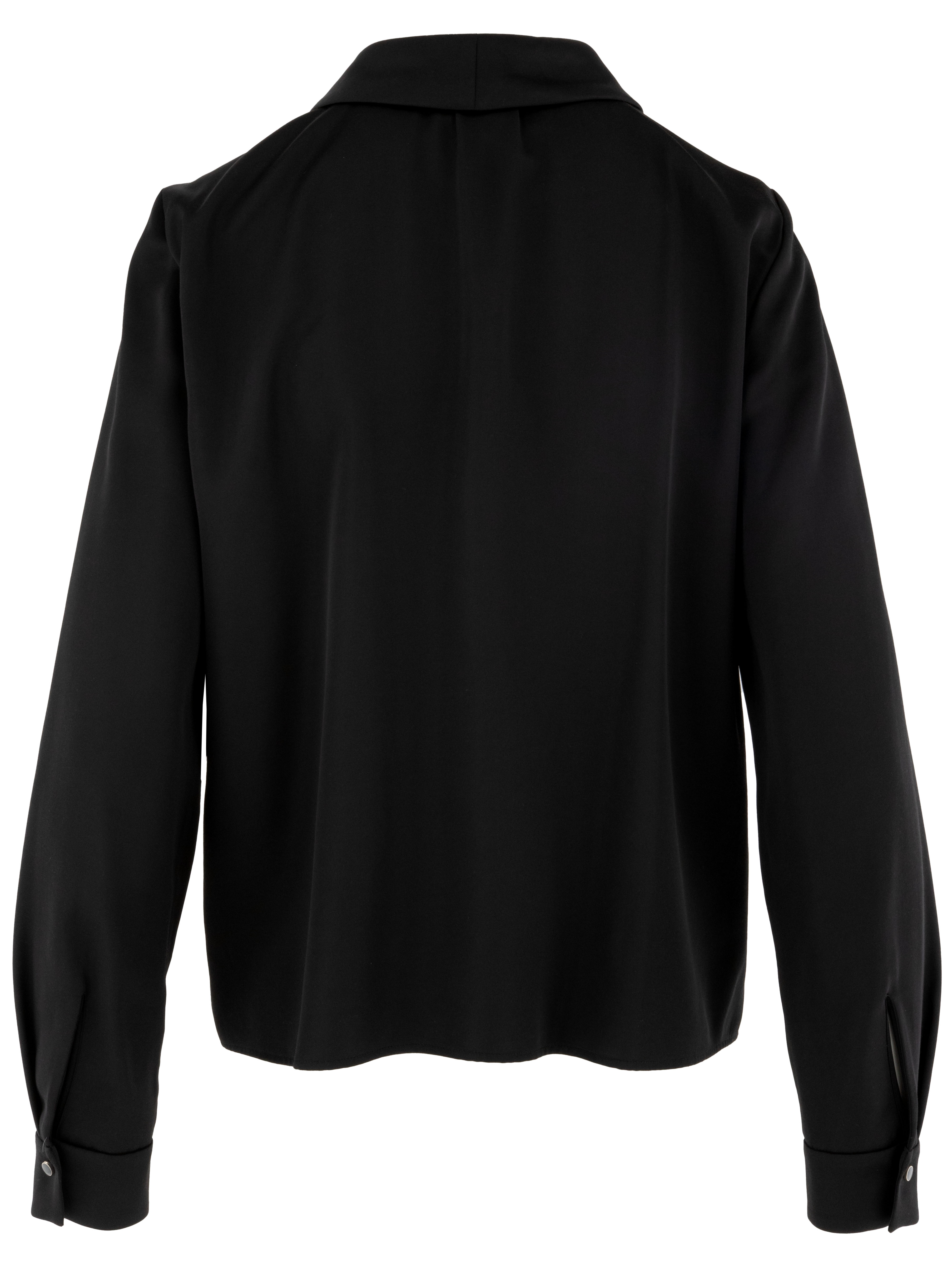 Eine Bluse von Marc Cain aus einem matt satinierten Stoff in Schwarz. Die Bluse hat eine Knopfleiste. An den Manschetten ist der Stoff in mehrere Falten gelegt. Diese Bluse kann bei 30 Grad gewaschen werden.