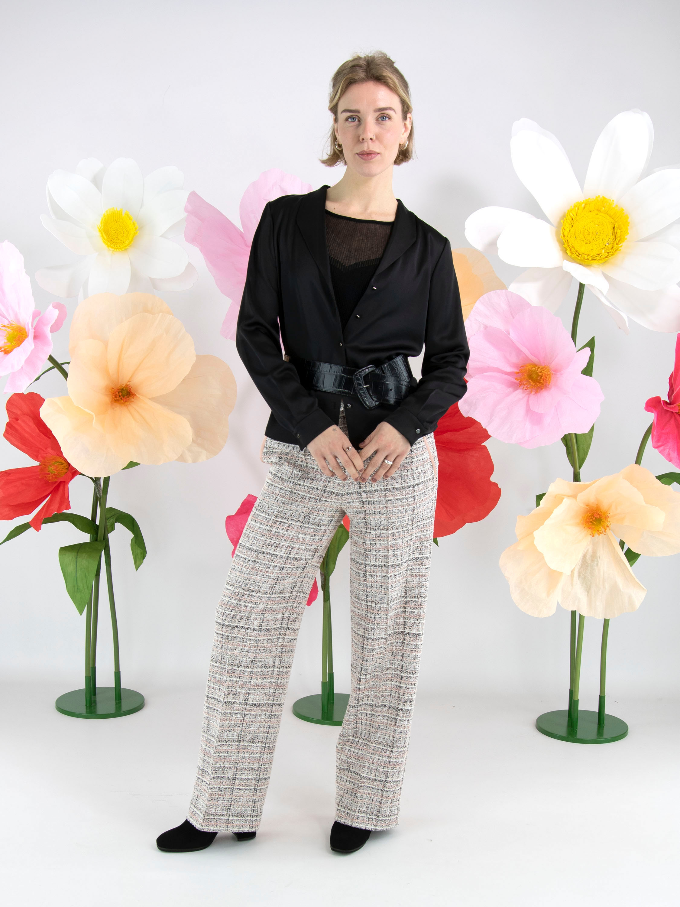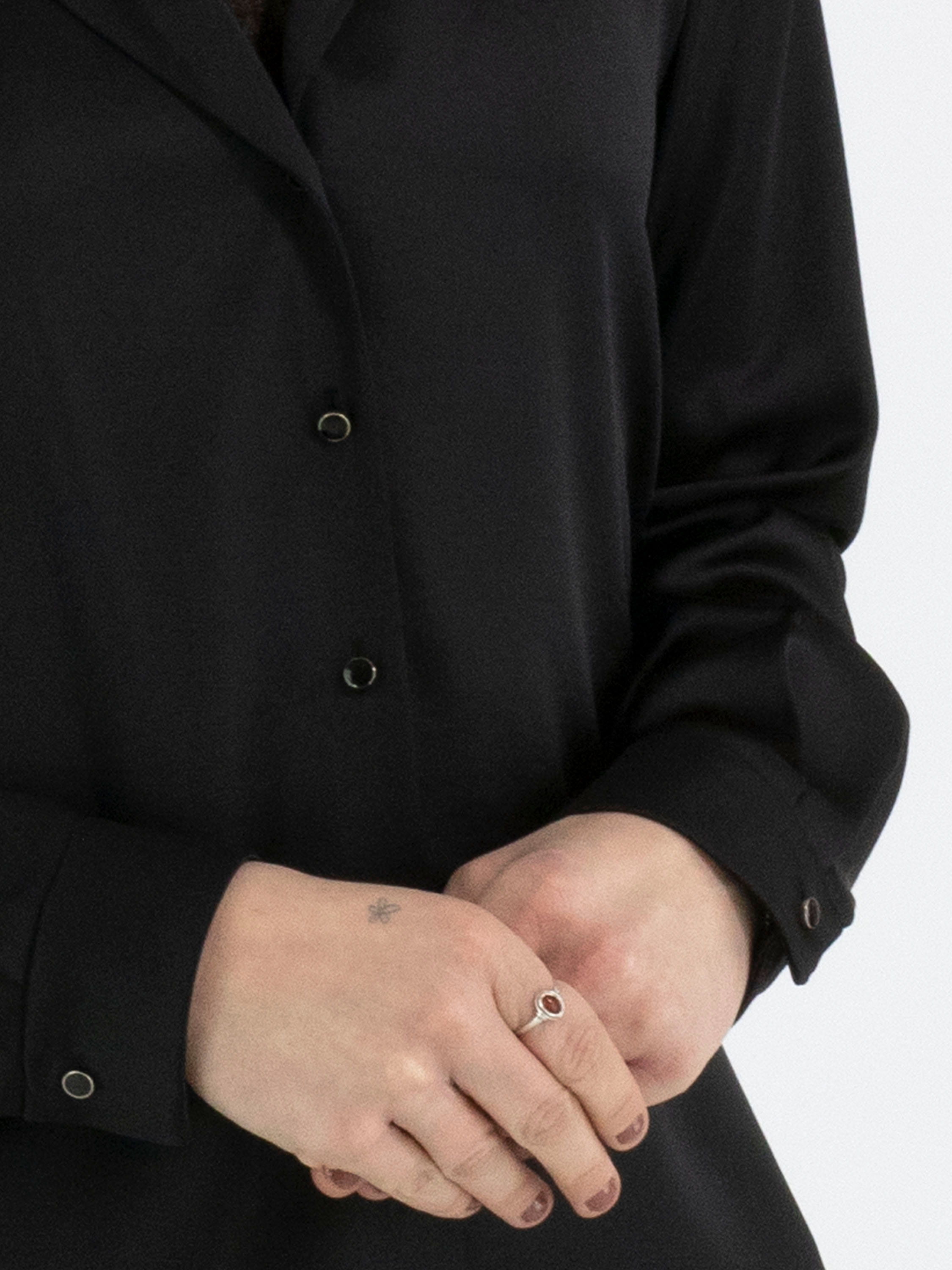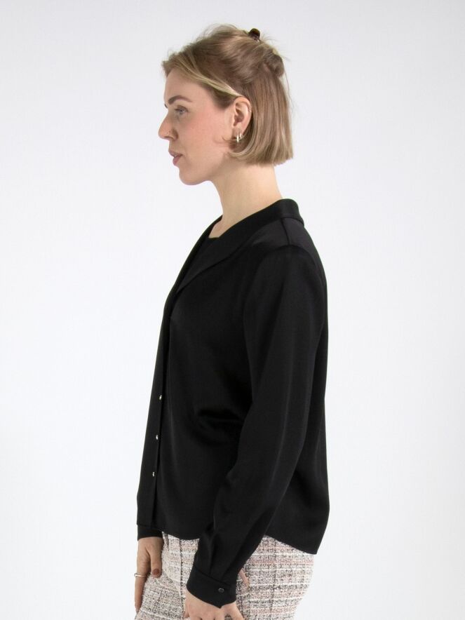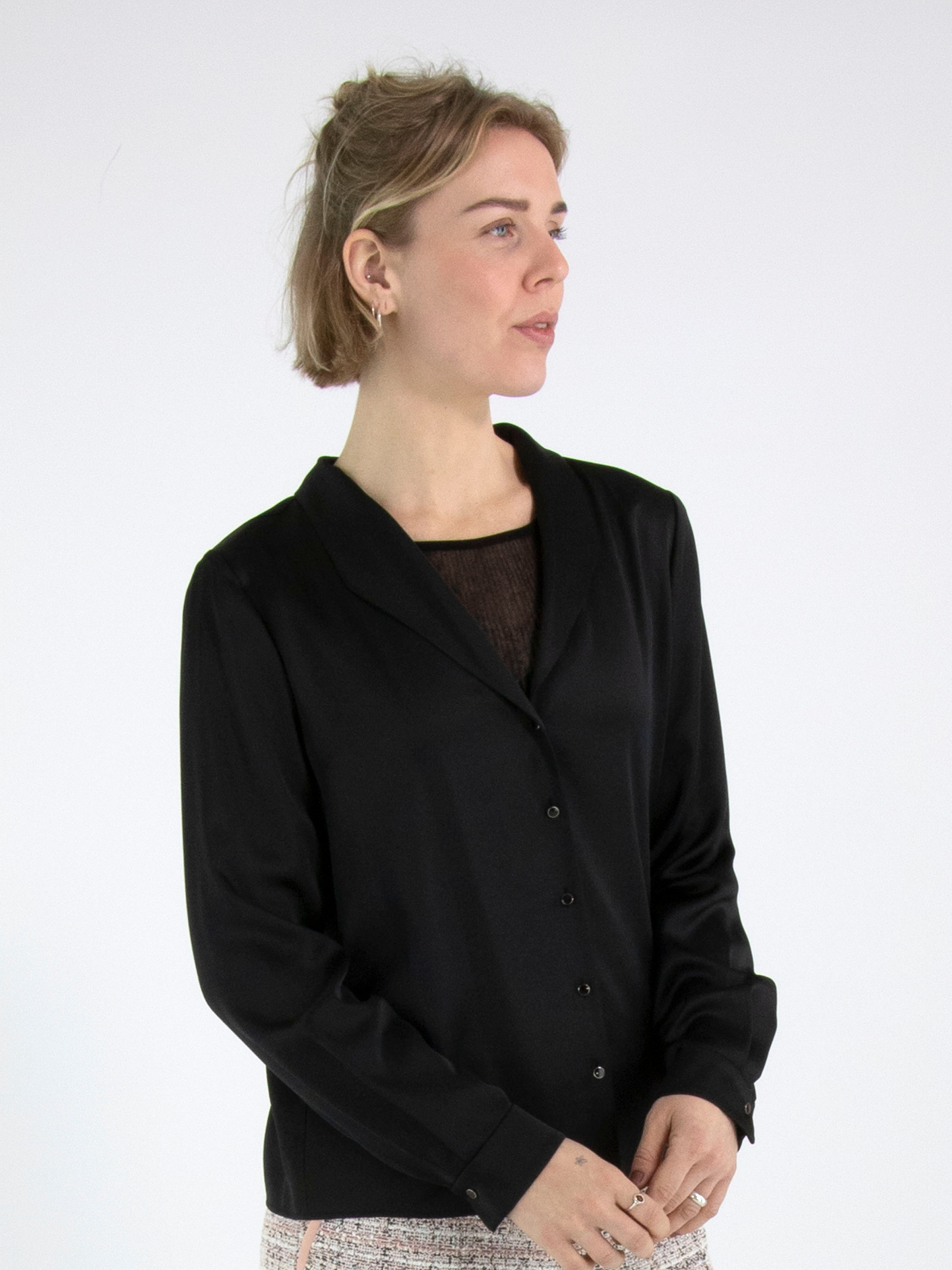 Eine Bluse von Marc Cain aus einem matt satinierten Stoff in Schwarz. Die Bluse hat eine Knopfleiste. An den Manschetten ist der Stoff in mehrere Falten gelegt. Diese Bluse kann bei 30 Grad gewaschen werden.