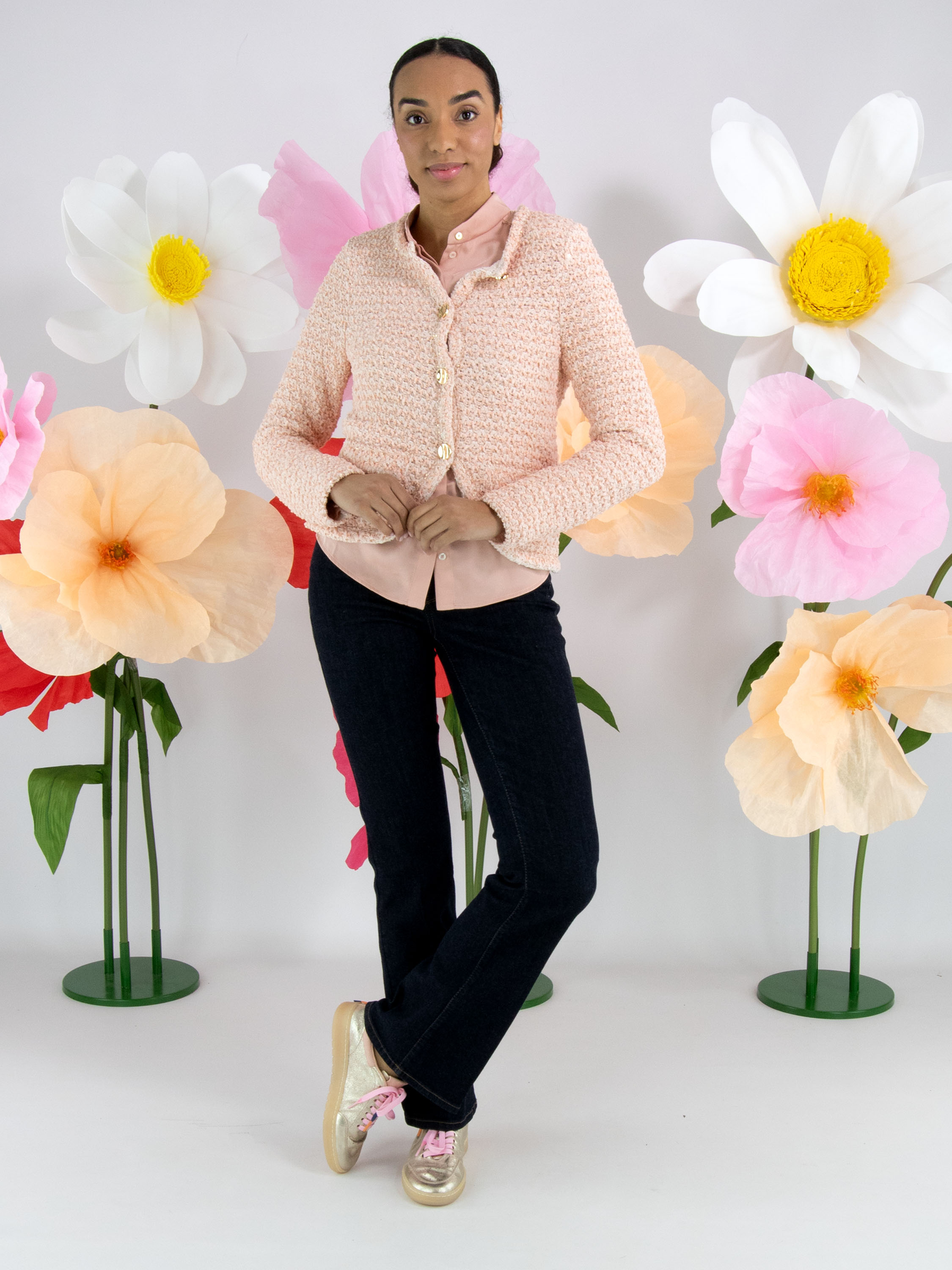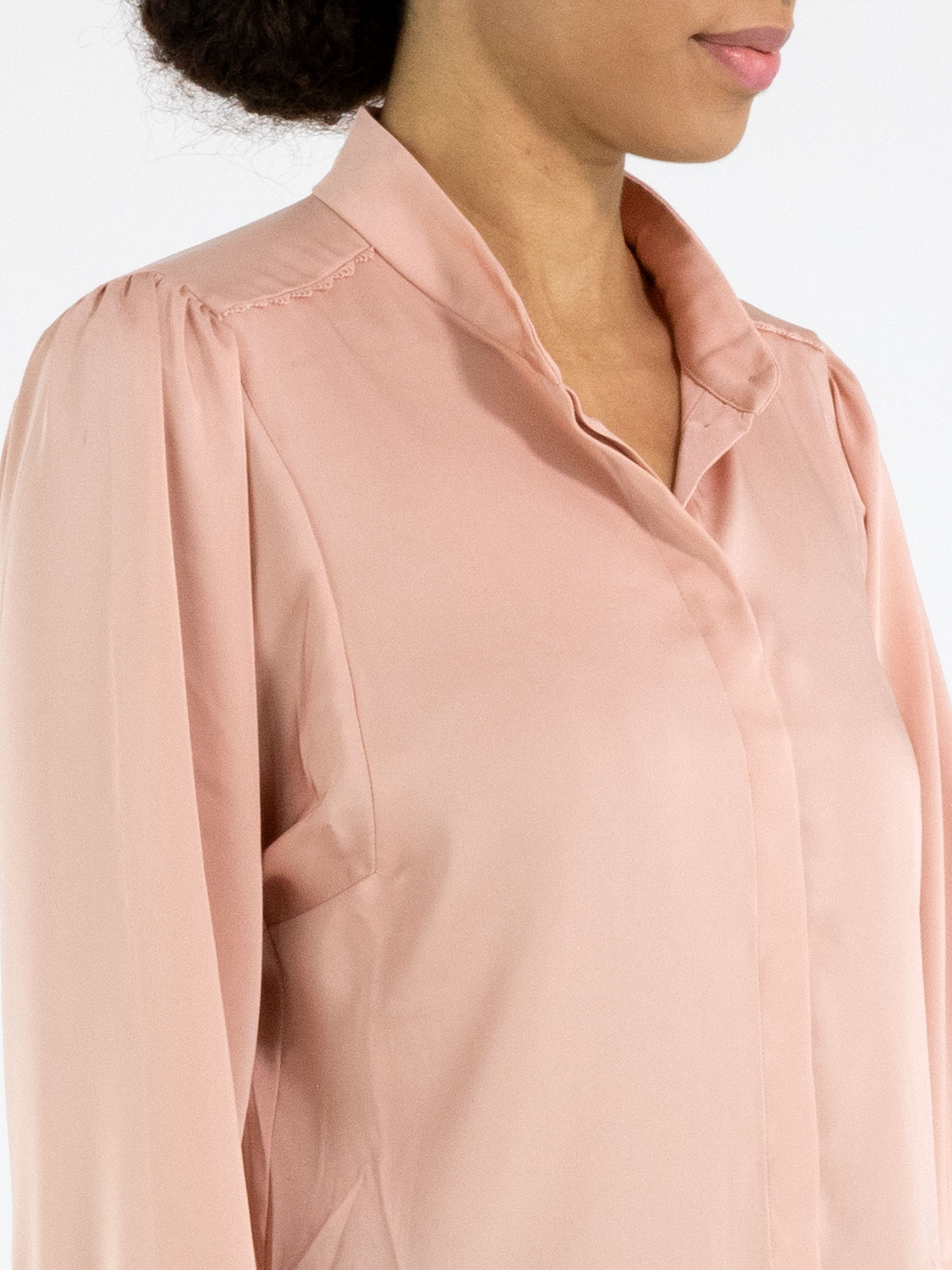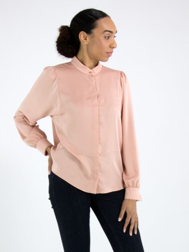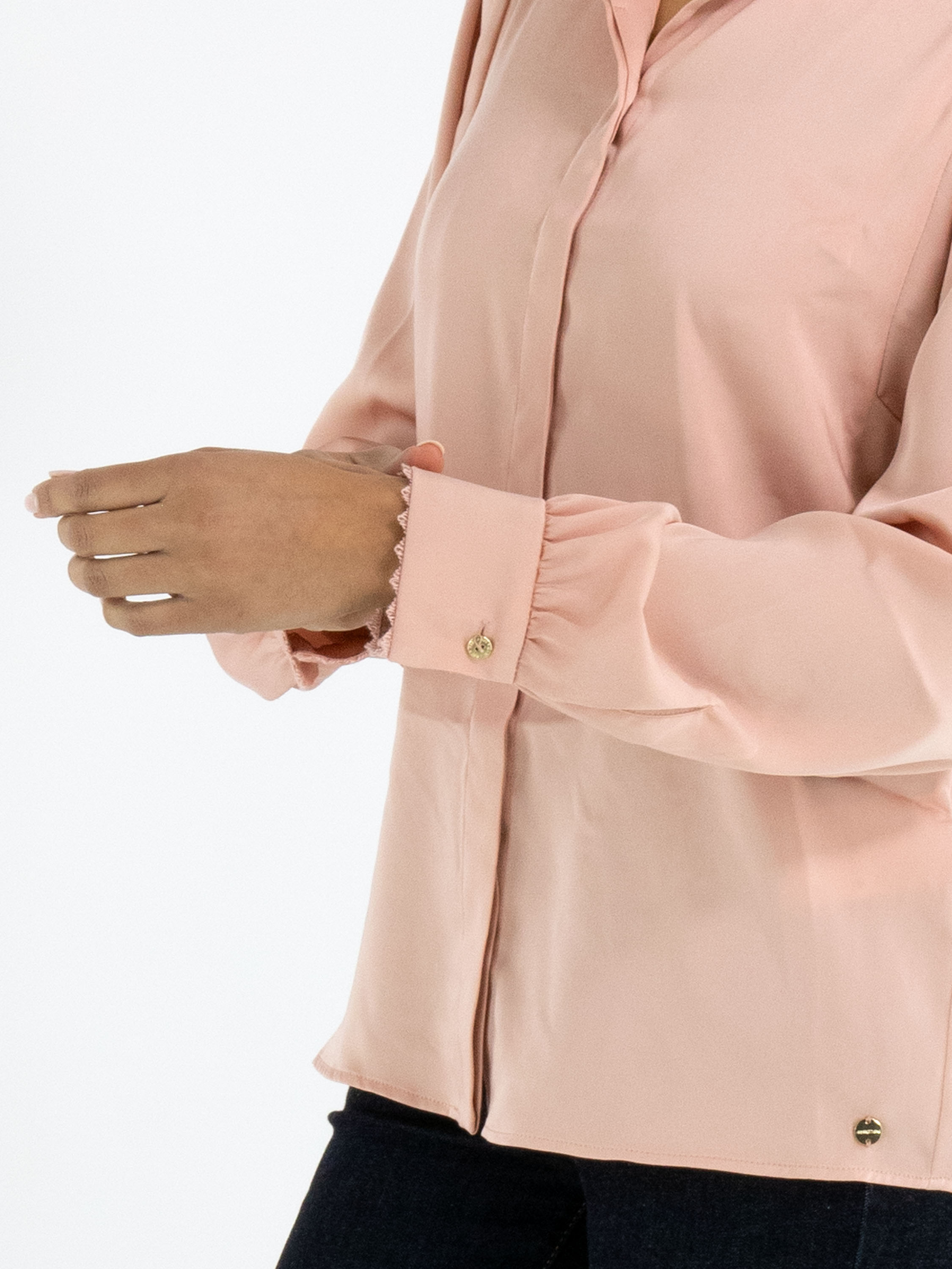 Eine Bluse von Marc Cain in Rosa. Die Bluse hat eine verdeckte Schließe. Entlang der Schulternaht und am Rand der Manschetten der langen Ärmel verläuft eine dekorative, wellenförmige Garnpaspel. Der Stoff der Bluse ist an den Manschetten fein gelegt. Diese Bluse kann bei 30 Grad gewaschen werden.