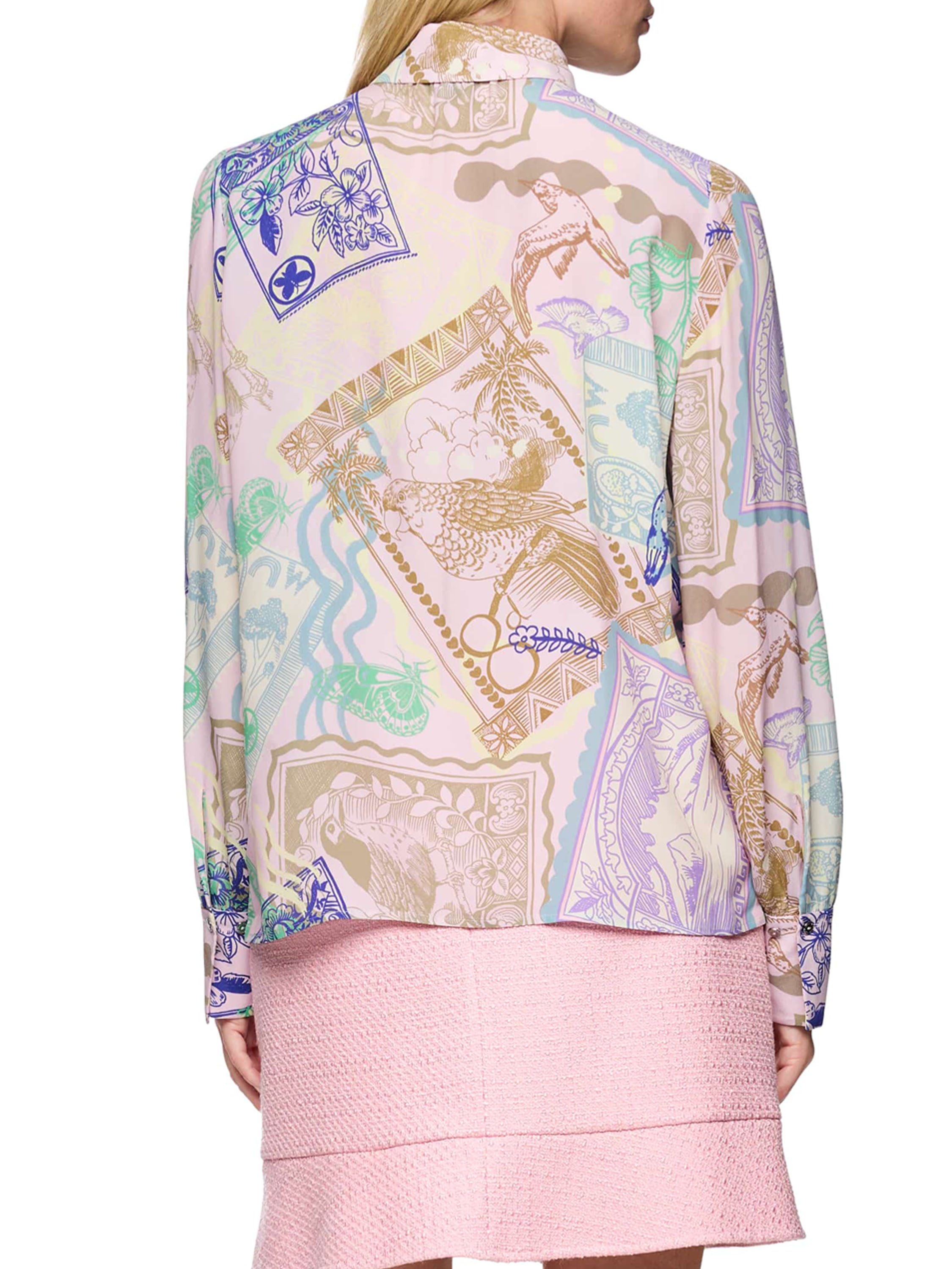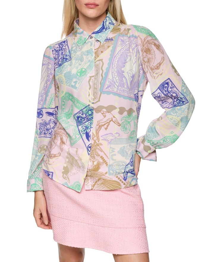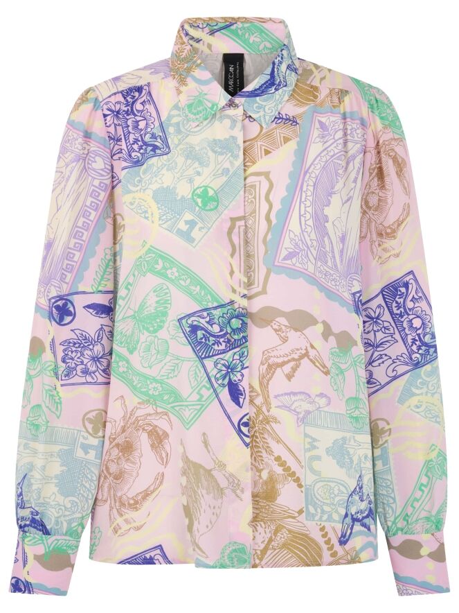 Eine Bluse von Marc Cain in Crêpe-Qualität mit einem Stempelprint in mehreren Pastelltönen wie Gelb, Grün und Blau auf rosafarbenem Hintergrund. Die Bluse hat eine verdeckte Knopfleiste und kann bei 30 Grad gewaschen werden.