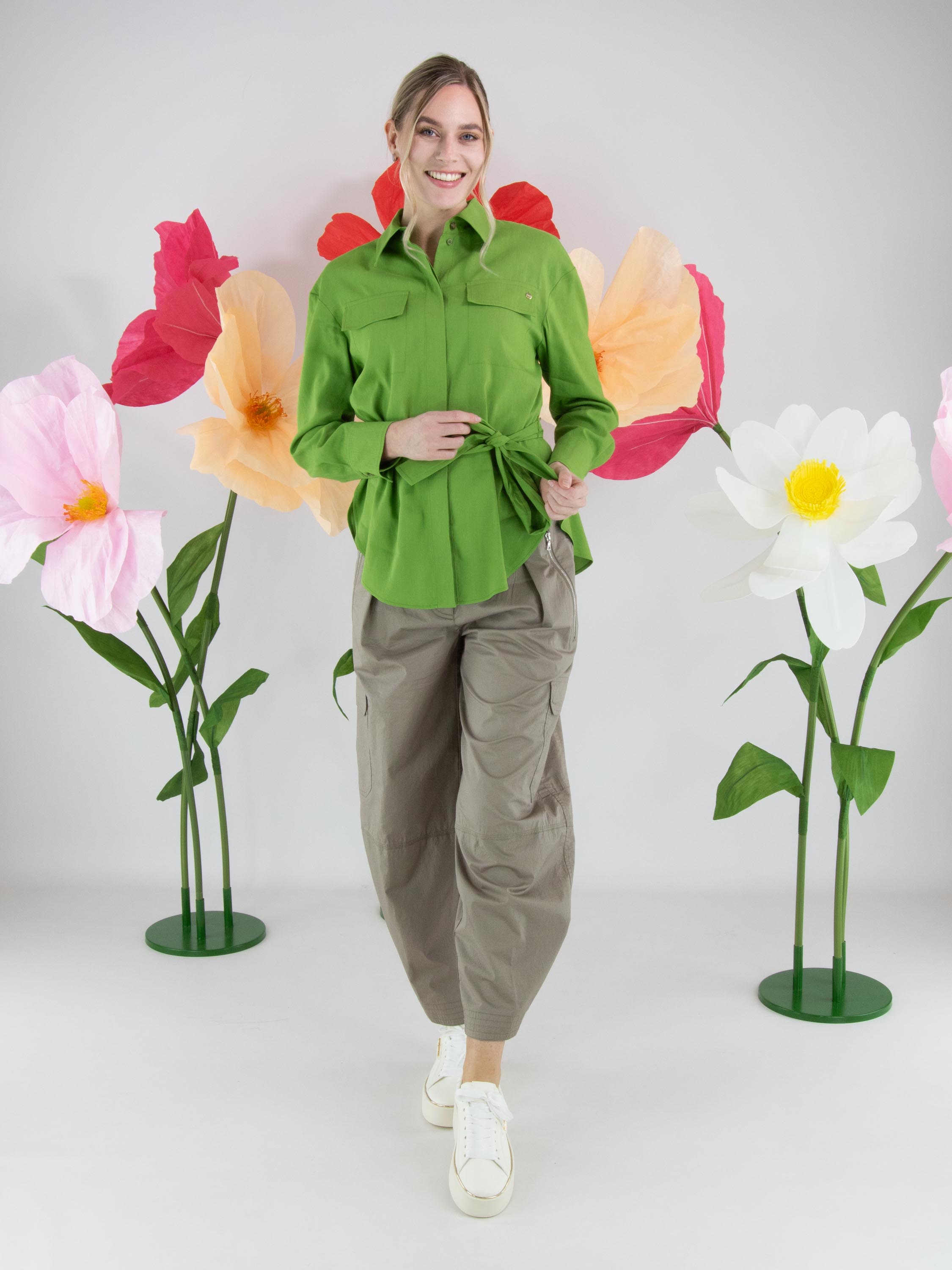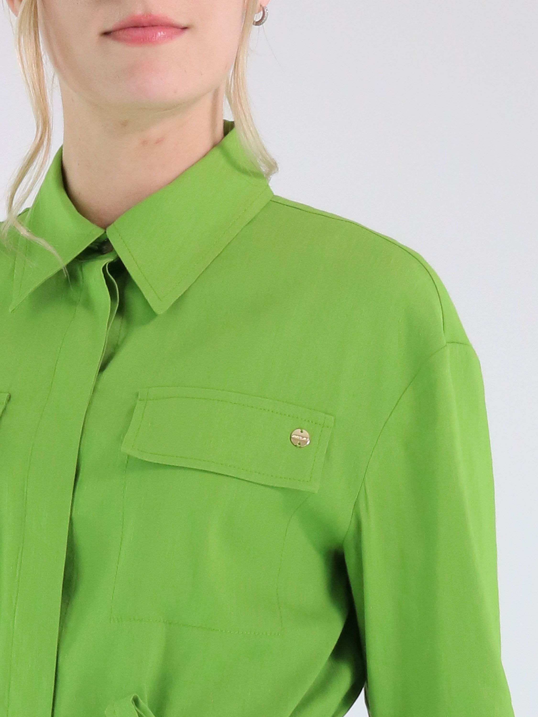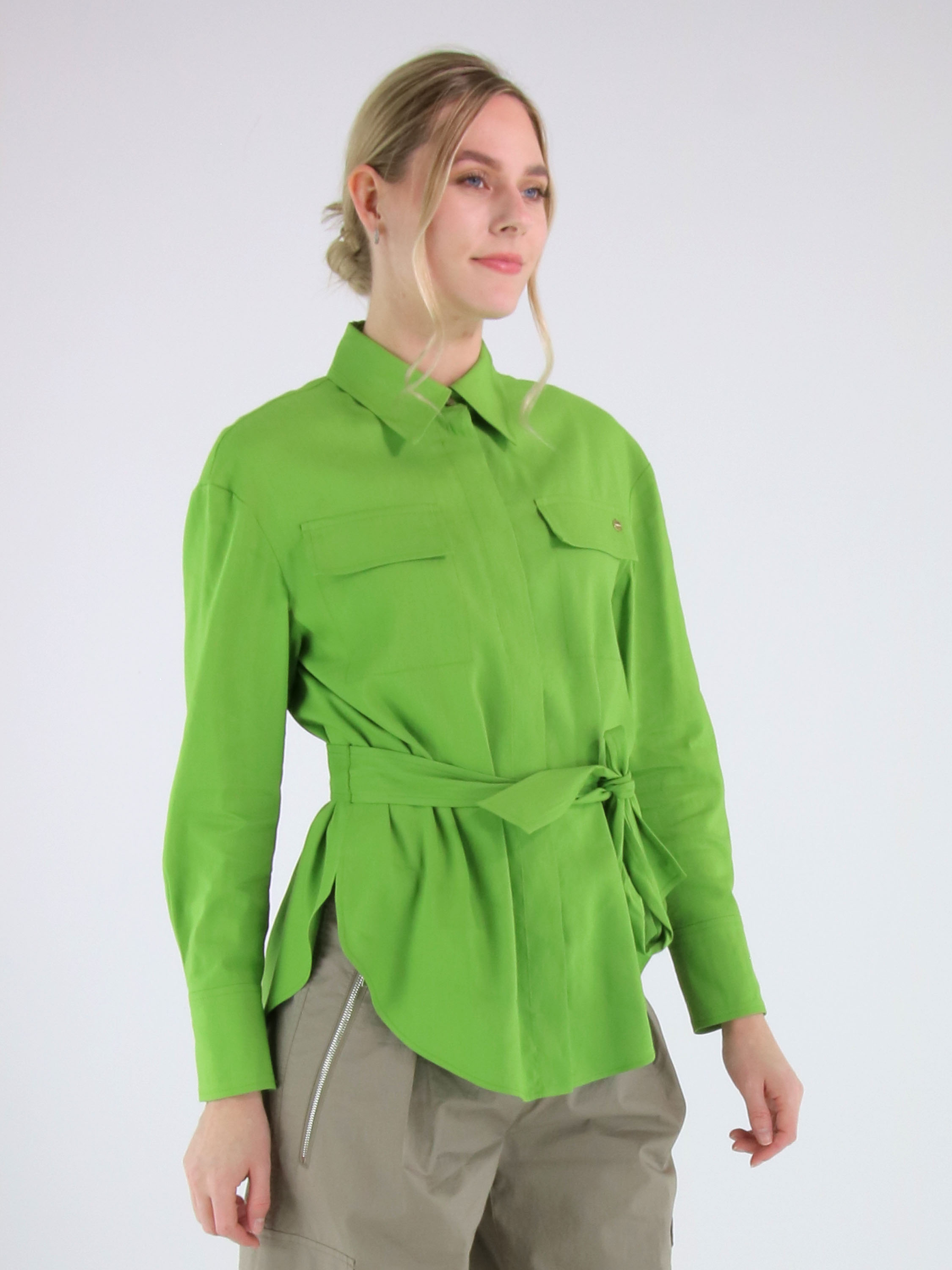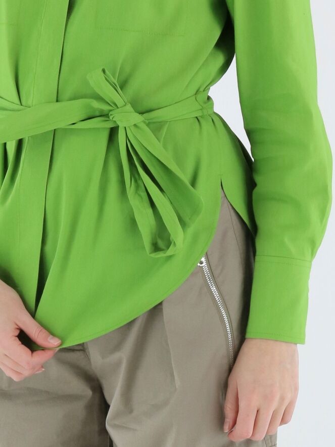 Lange Bluse von Marc Cain in einem frischen Grünton. Ein Gürtel aus dem gleichen Stoff betont die Taille auf elegante Weise. Dekorative Brusttaschenklappen setzen stilvolle Akzente. Auf der Rückseite sorgen zwei mittig platzierte Falten auf Schulterblatthöhe für Bewegungsfreiheit und eine schöne Passform. Die Bluse verfügt über eine verdeckte Knopfleiste und einen nach unten hin zu den Seiten abgerundeten Saum. Diese Bluse kann bei 30 Grad gewaschen werden.