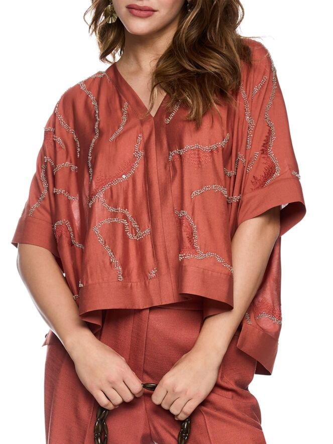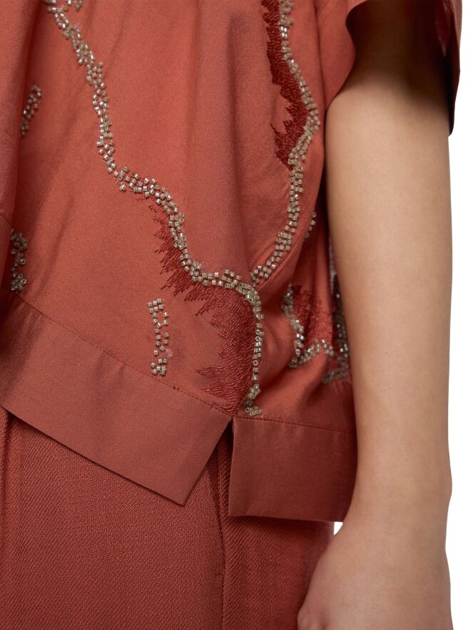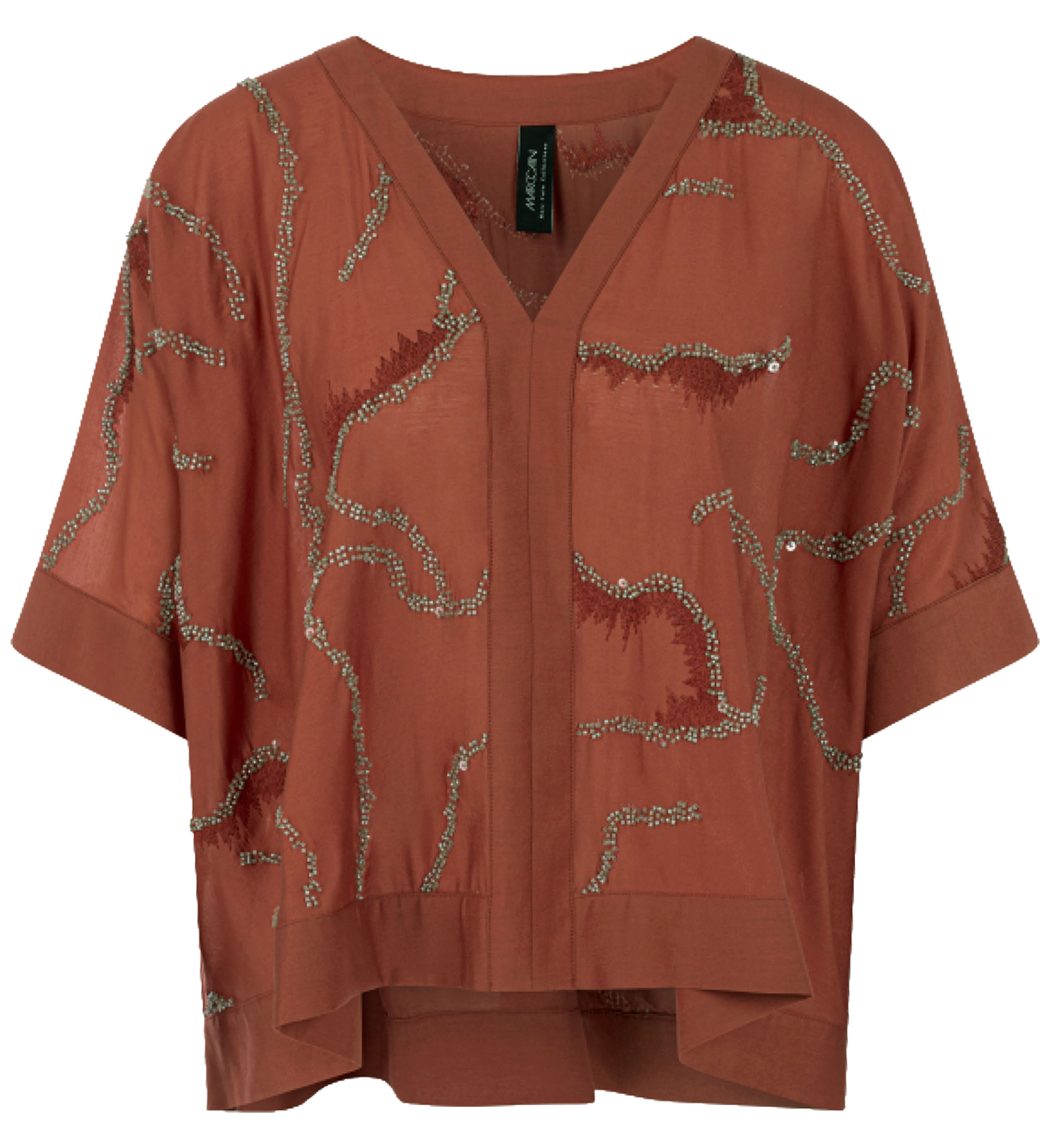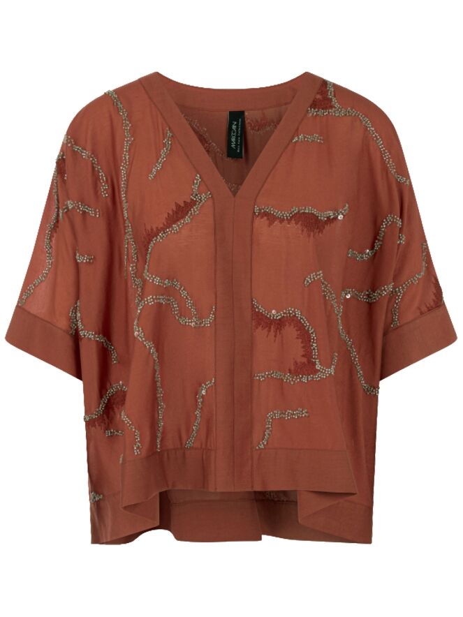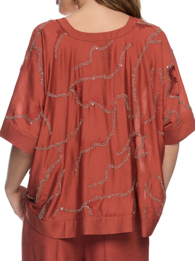 Ein Shirt von Marc Cain aus mattem Satin in einem mediterranen Rostton. Sowohl die Vorder- als auch die Rückseite sind mit dekorativen, geschwungenen Linien aus Strasssteinen und Pailletten verziert, die dem Design einen dezenten Glanz verleihen. Entlang des V-Ausschnitts verläuft eine matte Blende, die sich von der Halslinie bis zur Mitte des Shirts fortsetzt. Dieses Modell sollte per Hand gewaschen werden.