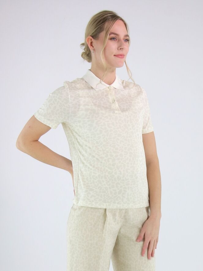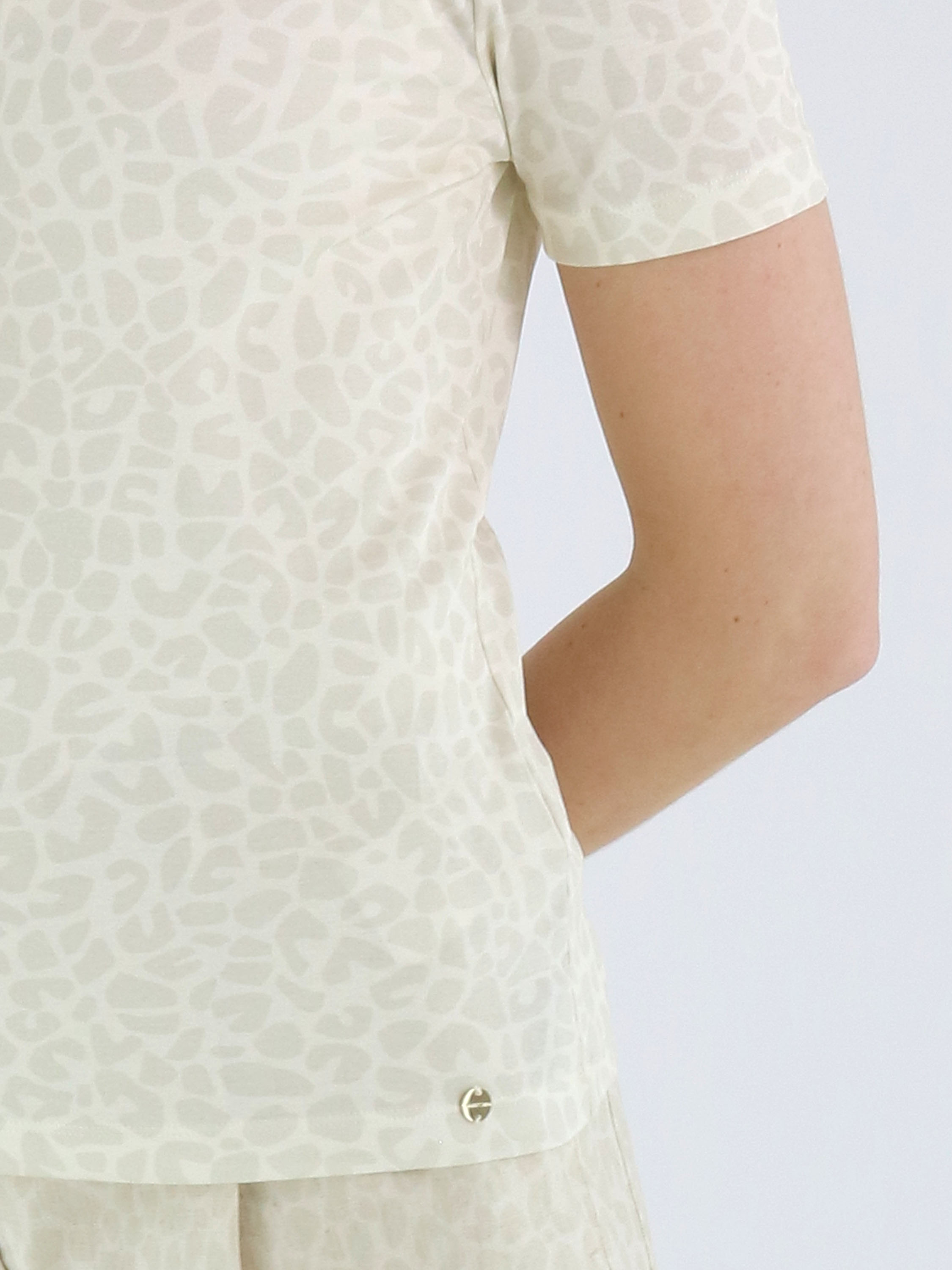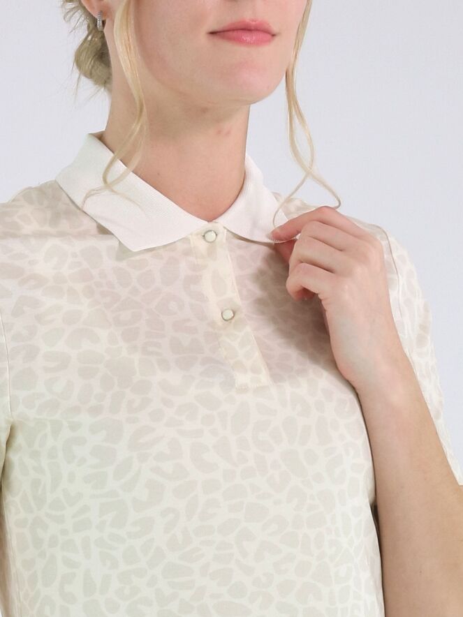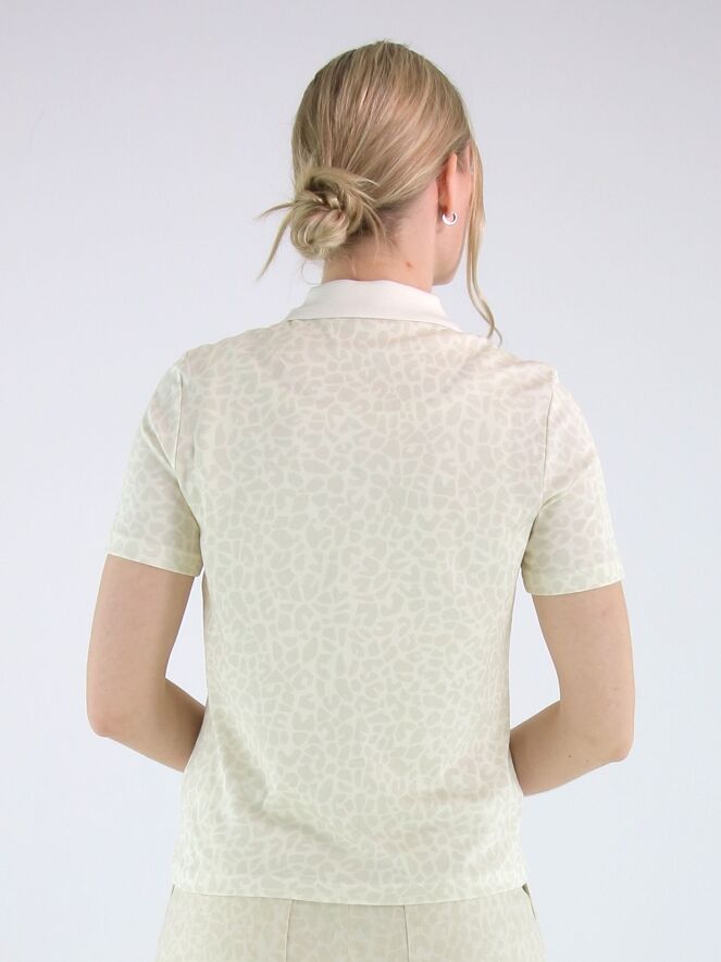 Poloshirt von Marc Cain mit Leo-Print in Cremeweiß und Beige. Der Kragen ist in klarem Weiß gehalten und setzt einen frischen, stilvollen Kontrast. Dieses Shirt kann bei 30 Grad gewaschen werden.