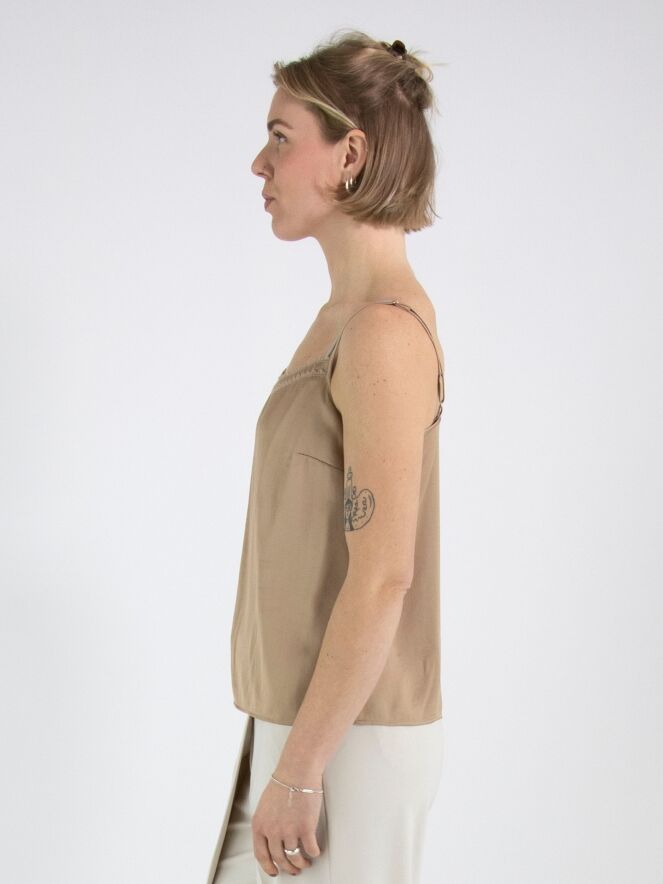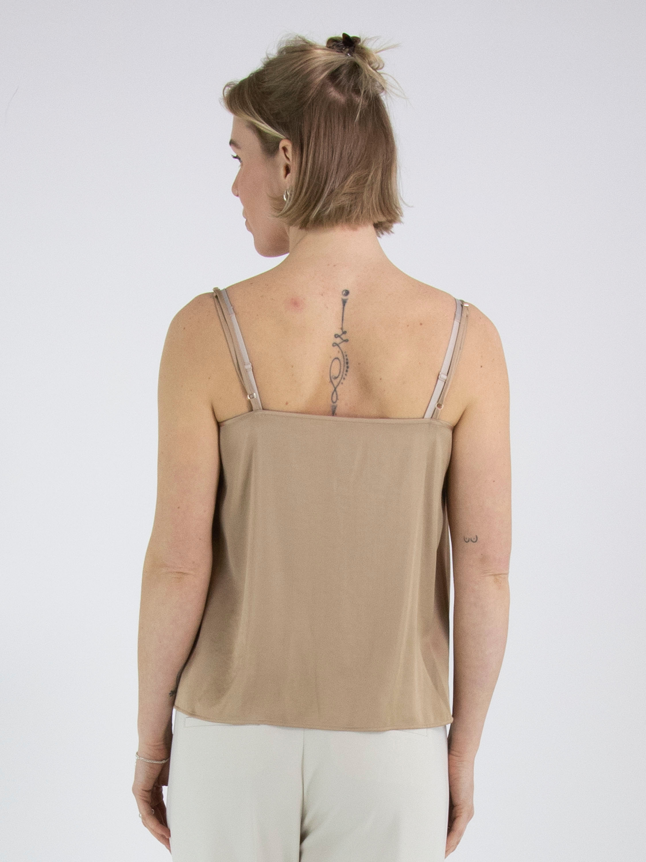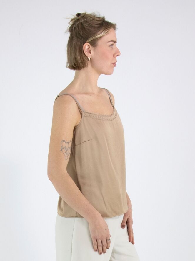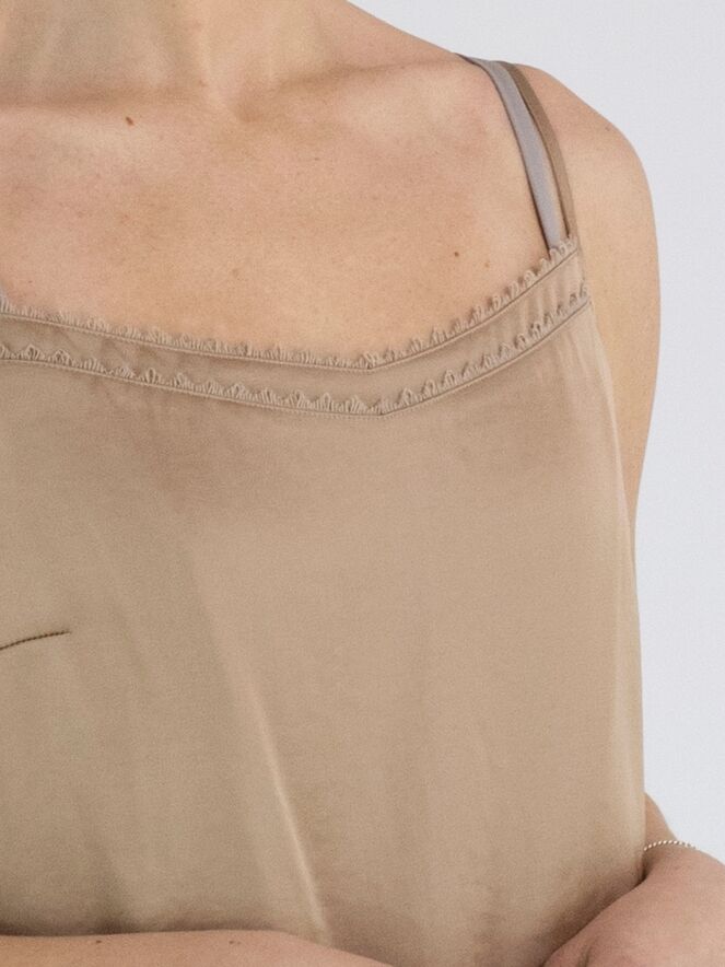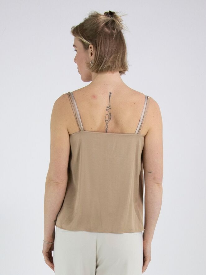 Ein Top von Marc Cain aus einem matt satinierten Stoff in Taupe. Das Top hat verstellbare Spaghettiträger und eine doppelte Blende entlang der vorderen Kante. Dieses Top kann bei 30 Grad gewaschen werden.