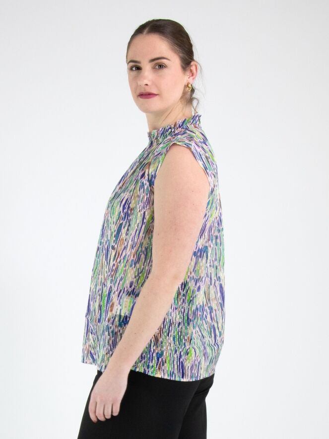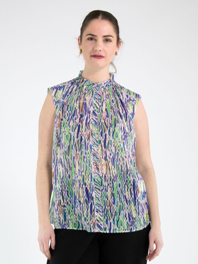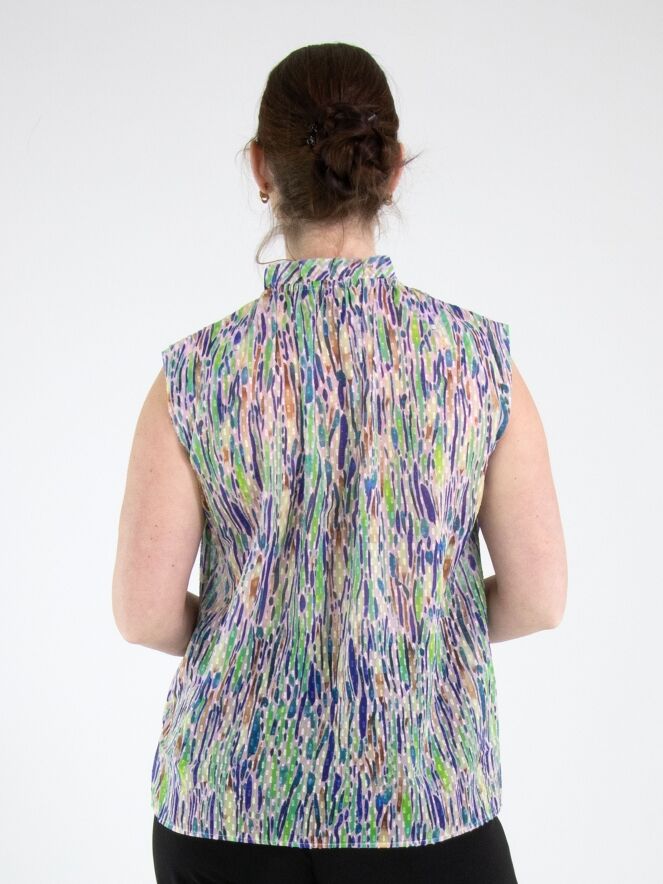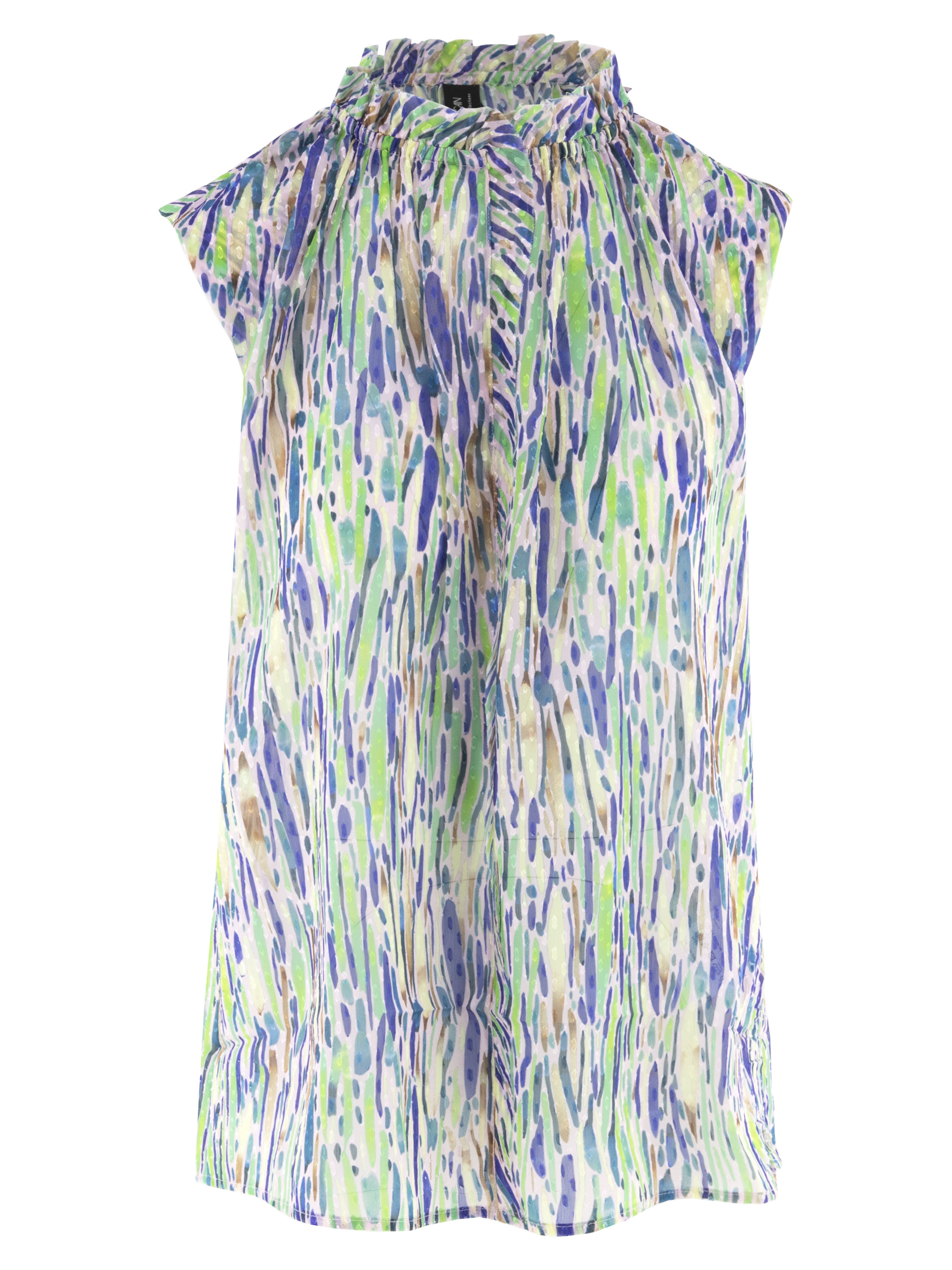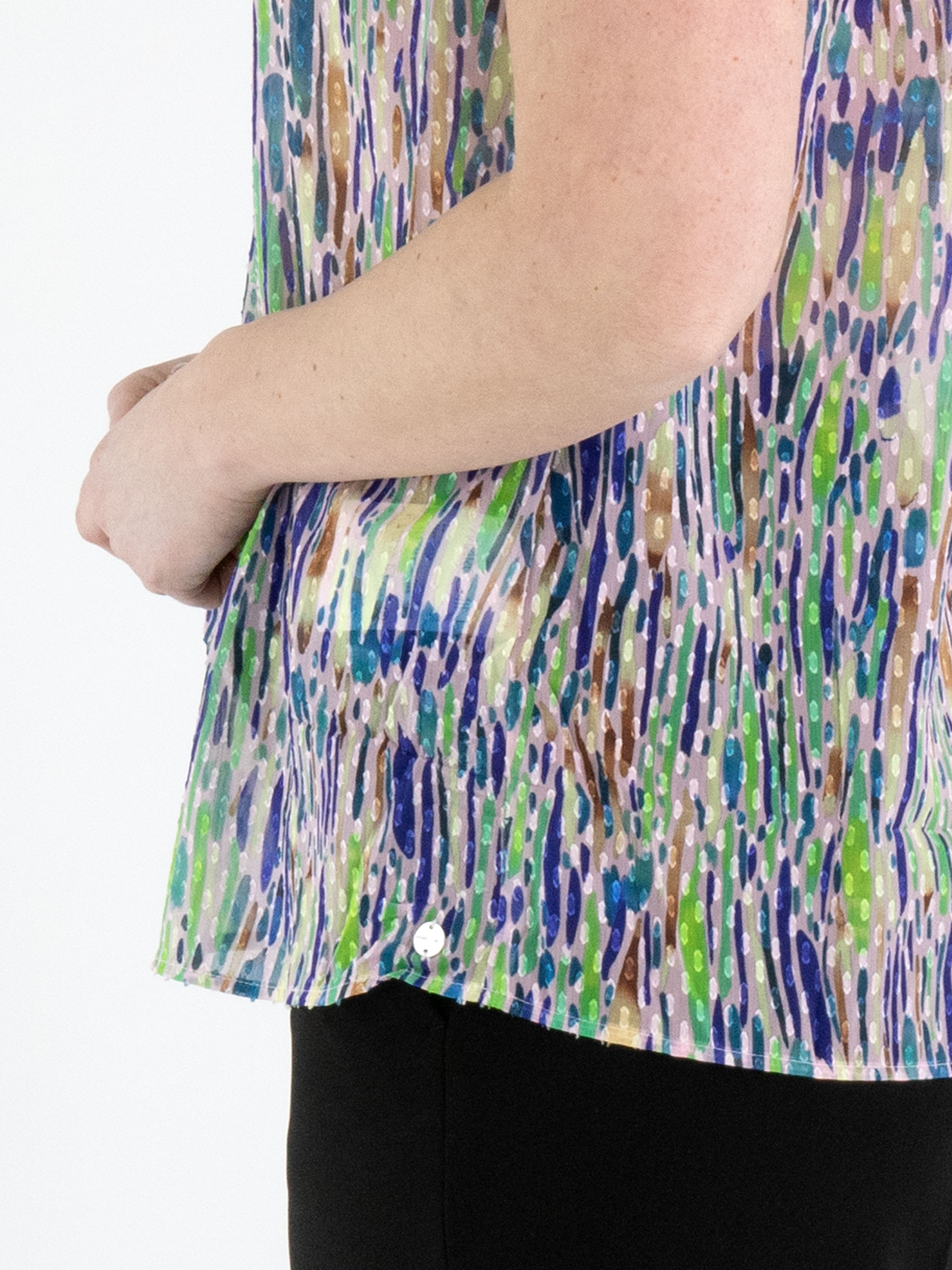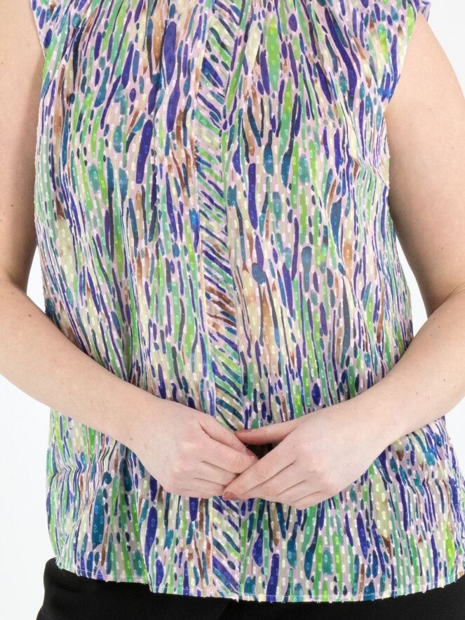 Ein leicht transparenter Top von Marc Cain mit einem Konfetti-Print in mehreren Grün-, Blau- und Brauntönen auf pastellrosa Hintergrund. Entlang des elastischen Rundhalsausschnitts ist eine doppelte Voile-Borte verarbeitet. Der Stoff ist entlang der Halskante fein plissiert. Dieser Top kann bei 30 Grad gewaschen werden.