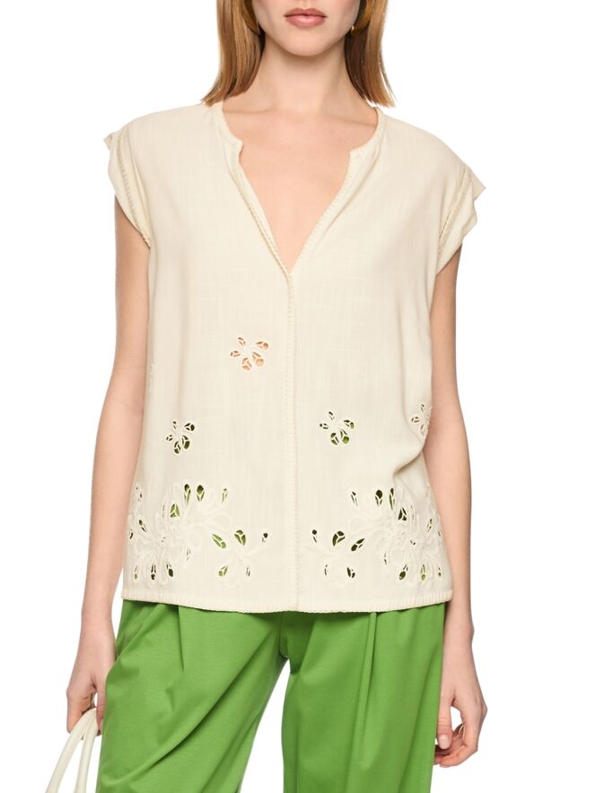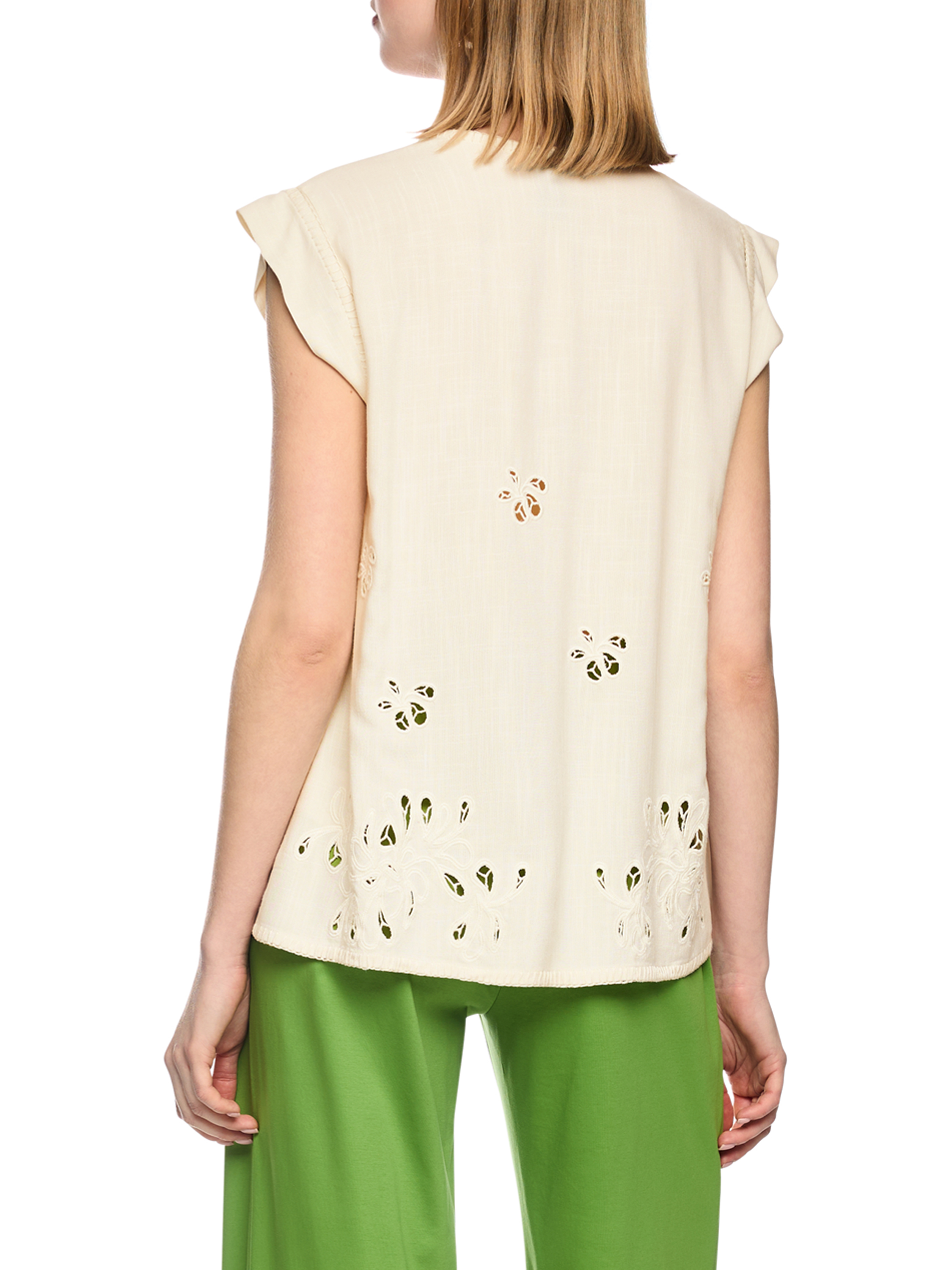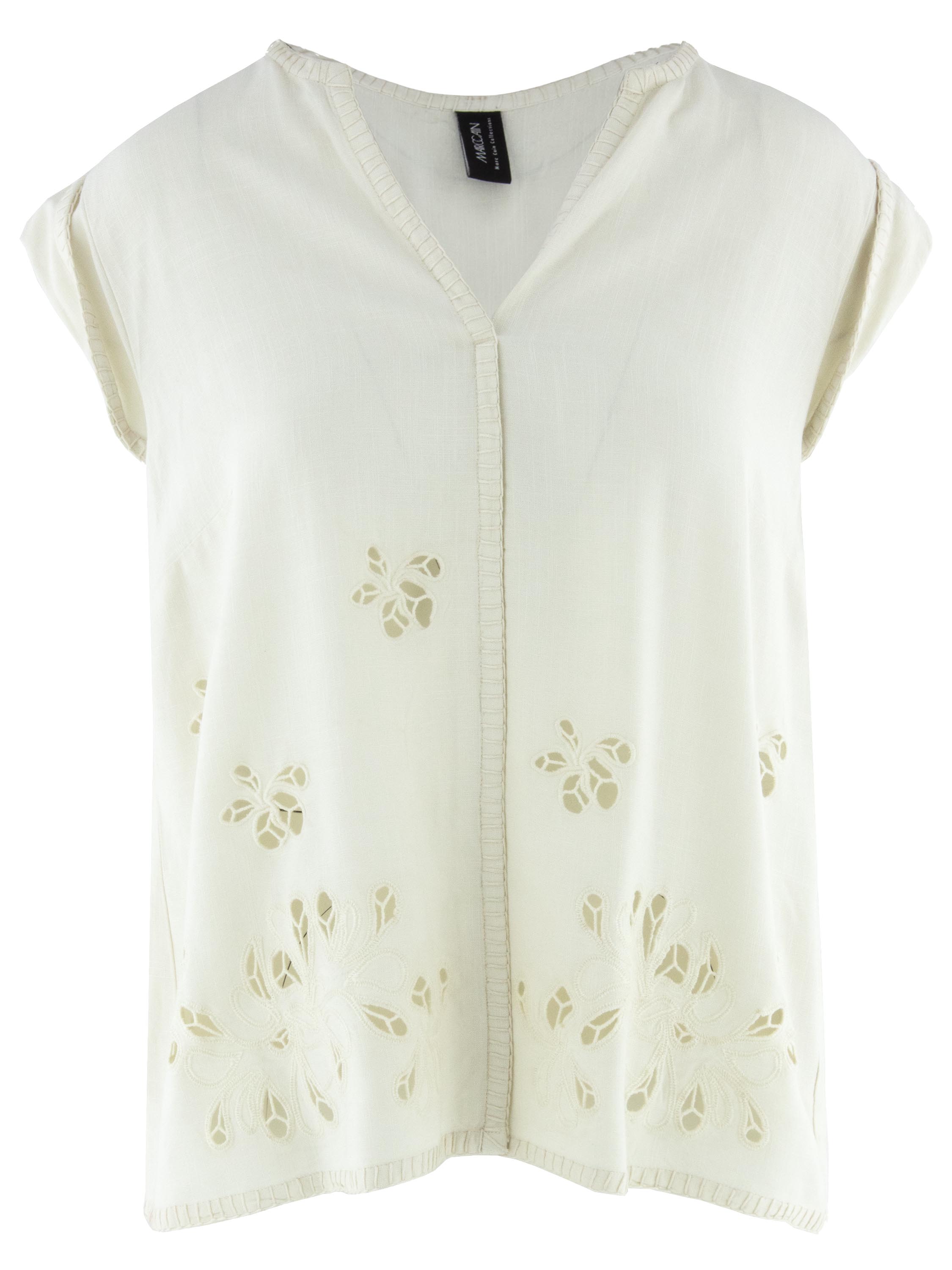 Top von Marc Cain in einem cremeweißen Ton. Vom V-Ausschnitt verläuft eine dekorative, umgekehrte Naht bis zum Saum und setzt einen dezenten grafischen Akzent. Sowohl vorne als auch hinten sind florale Ajour-Details eingearbeitet, die dem Top eine luftige, sommerliche Ausstrahlung verleihen. Dieses Top sollte per Hand gewaschen werden.