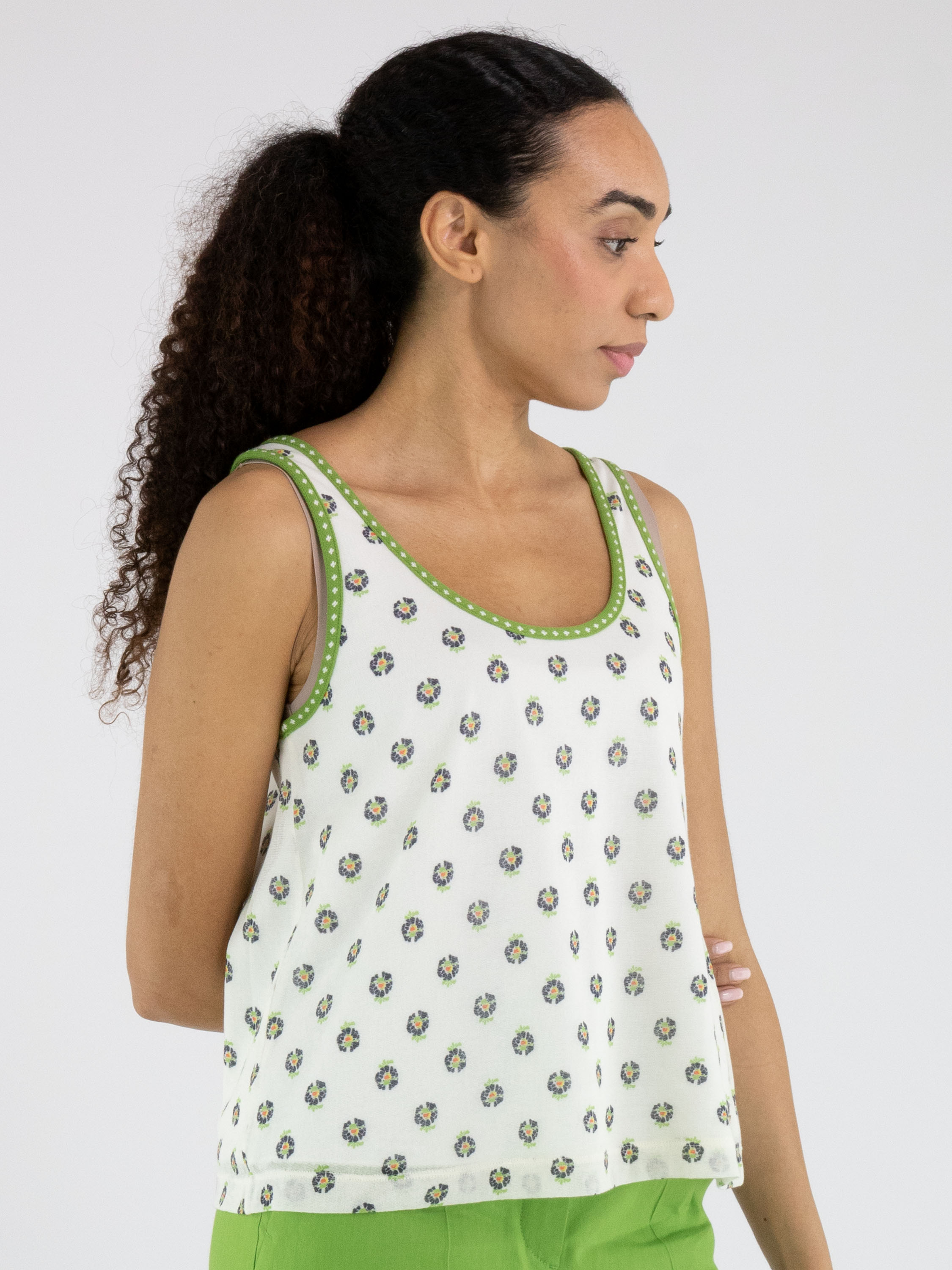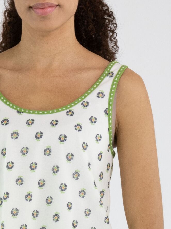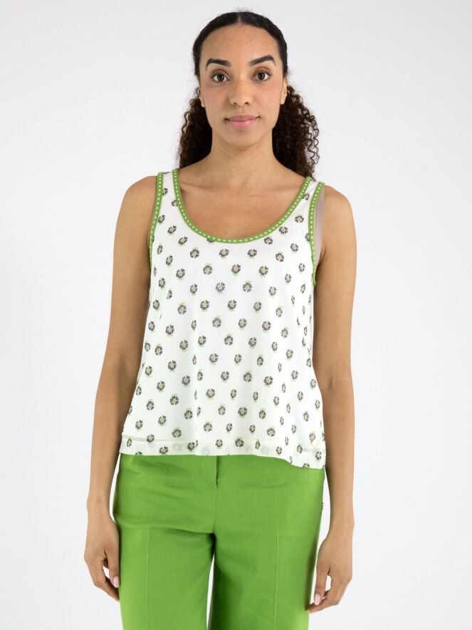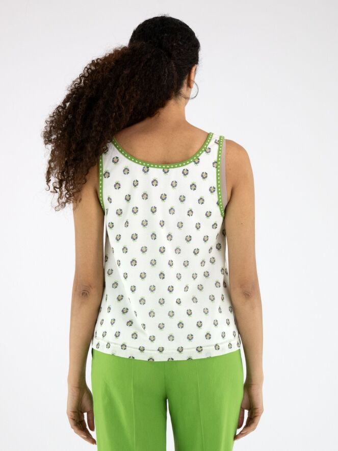 Top von Marc Cain mit feinem Blütenmuster in Grün, Schwarz und Korallrot auf cremeweißem Grund. Das Modell ist zweilagig gearbeitet: eine unifarbene cremeweiße Unterlage und eine transparente Oberschicht mit dem beschriebenen Print sorgen für Tiefe und Eleganz. Eine grüne Borte mit weißen Punkten ziert den Rundhalsausschnitt und die Ärmeleinsätze und setzt einen verspielten, zugleich stilvollen Akzent. Dieses Top kann bei 30 Grad gewaschen werden.