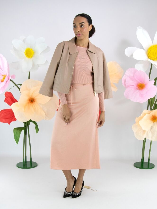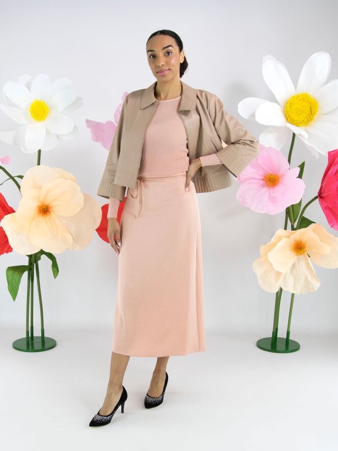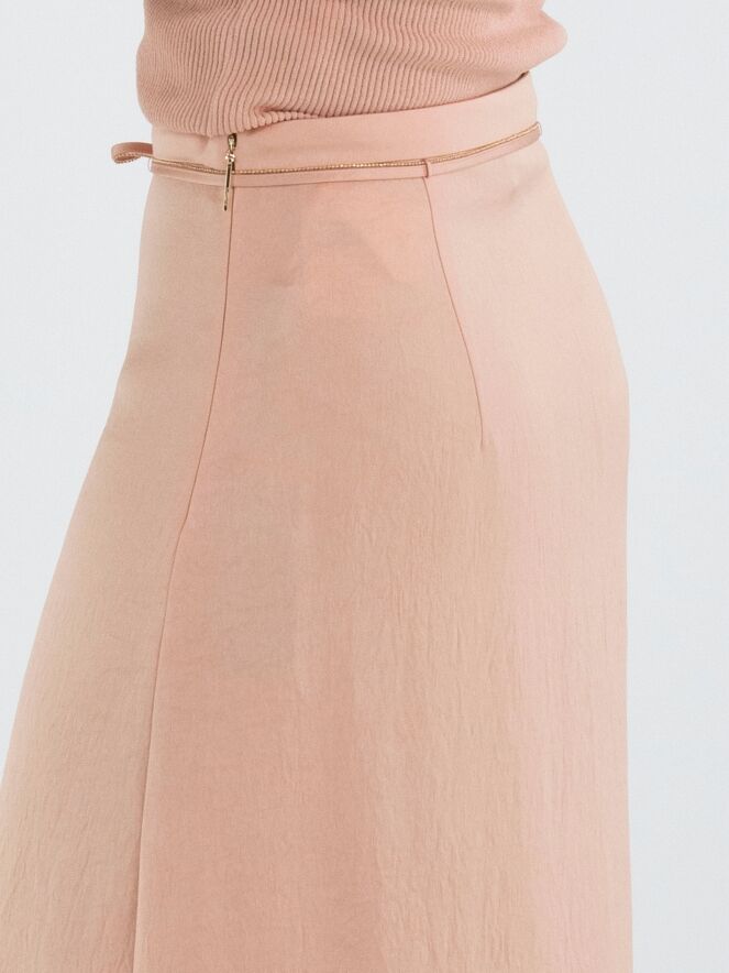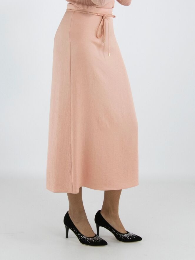 Ein langer Rock von Marc Cain aus einem matt glänzenden Satinstoff in Lachsrosa. In der Taille befindet sich ein Stoffband als Gürtel, dessen Rand mit einer gezackten Reißverschlusskante verziert ist. Dieser Rock kann bei 30 Grad gewaschen werden.