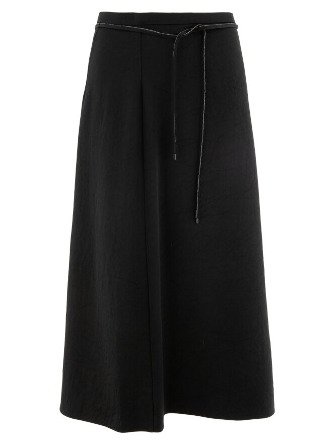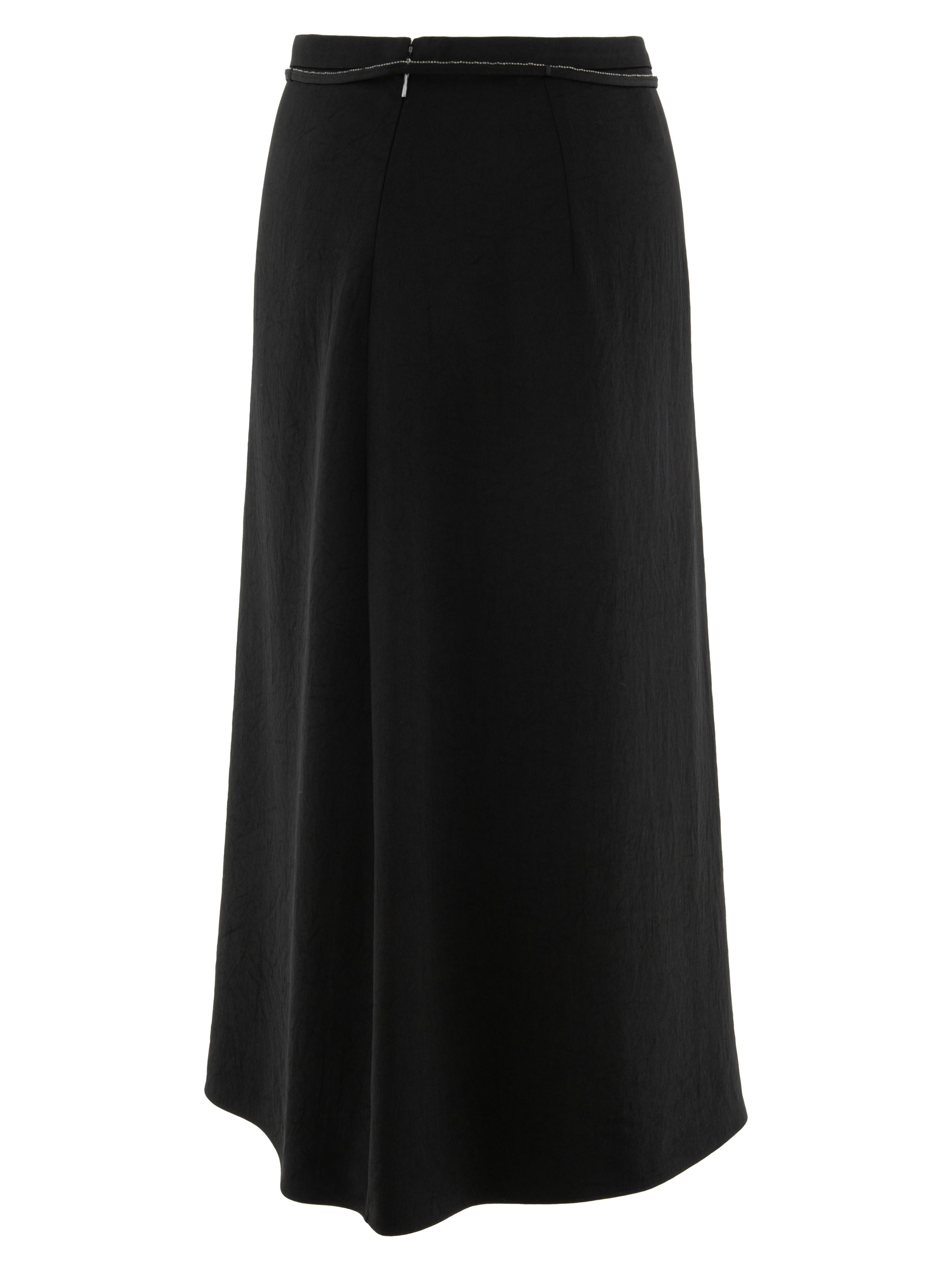 Ein langer Rock von Marc Cain aus einem matt satinierten Stoff in Schwarz. In der Taille befindet sich ein Stoffband als Gürtel, dessen Kante mit einem gezackten Reißverschlussdetail versehen ist. Dieser Rock kann bei 30 Grad gewaschen werden.