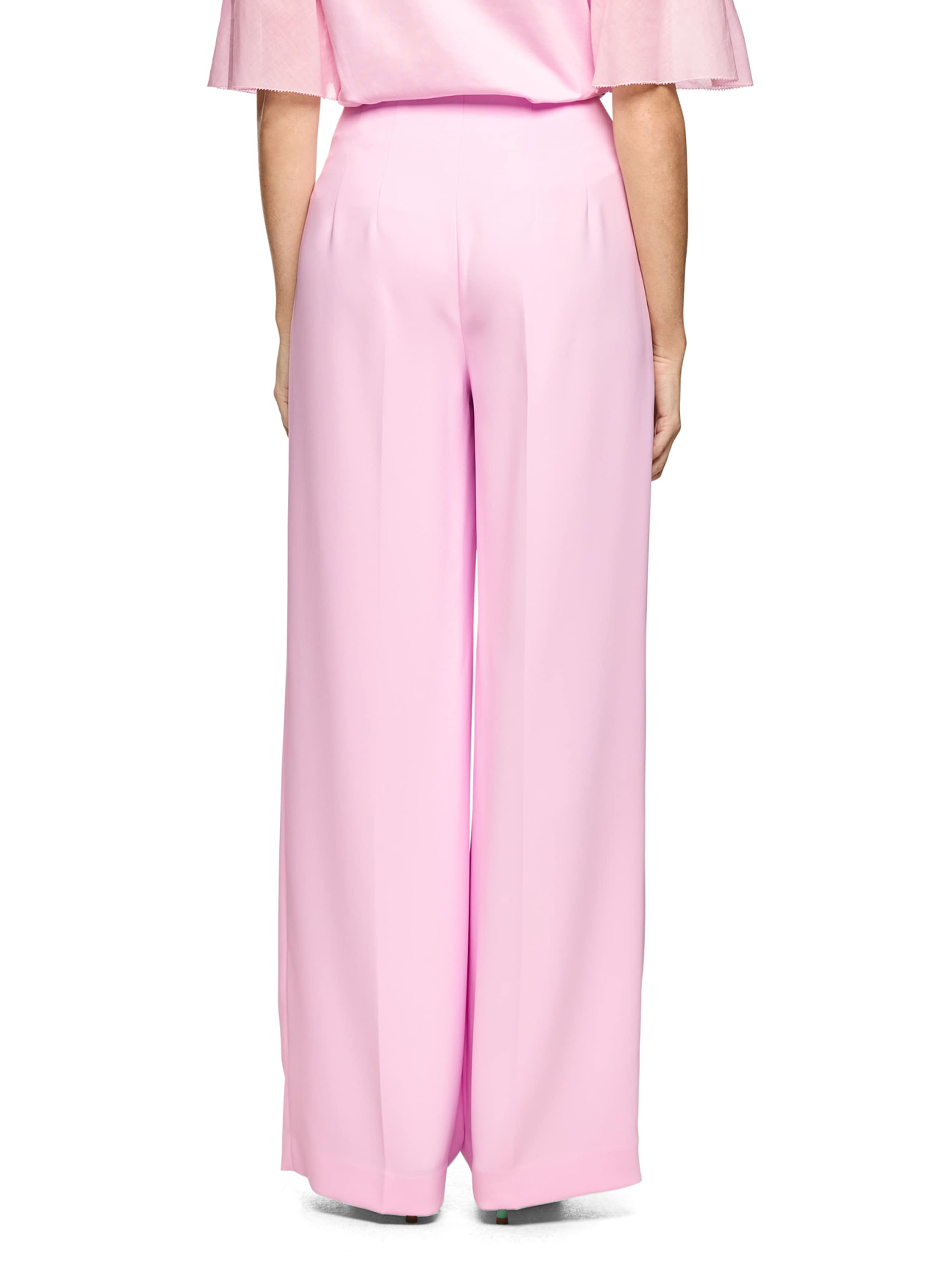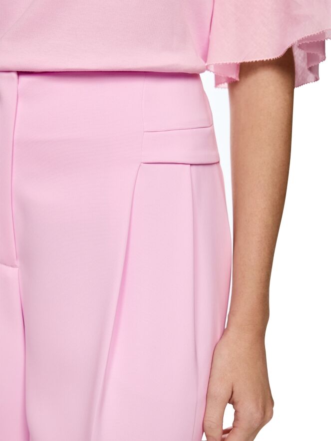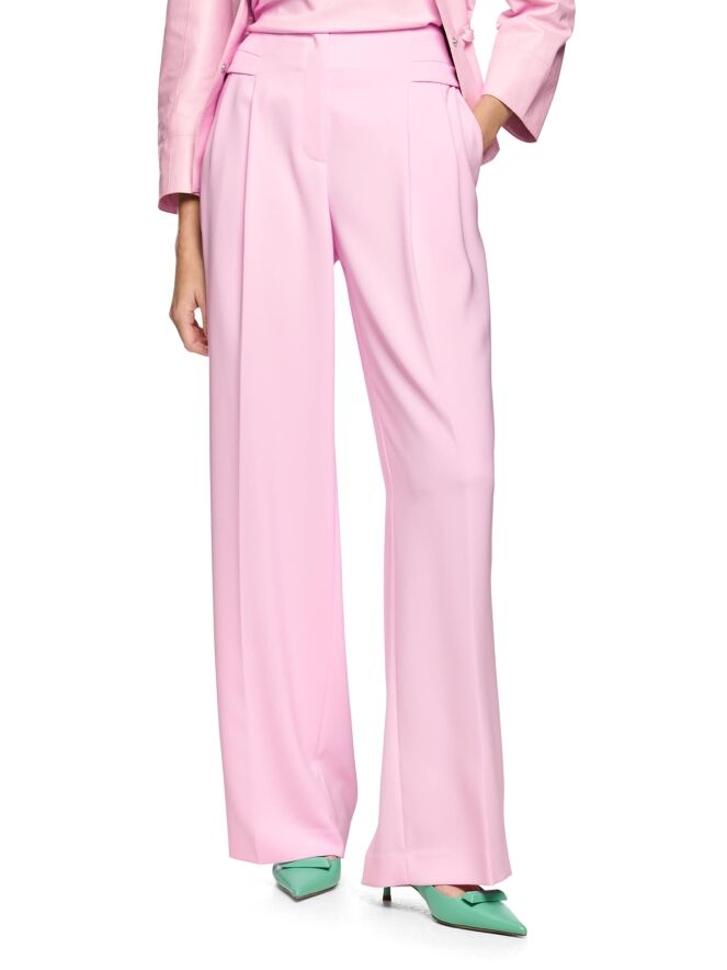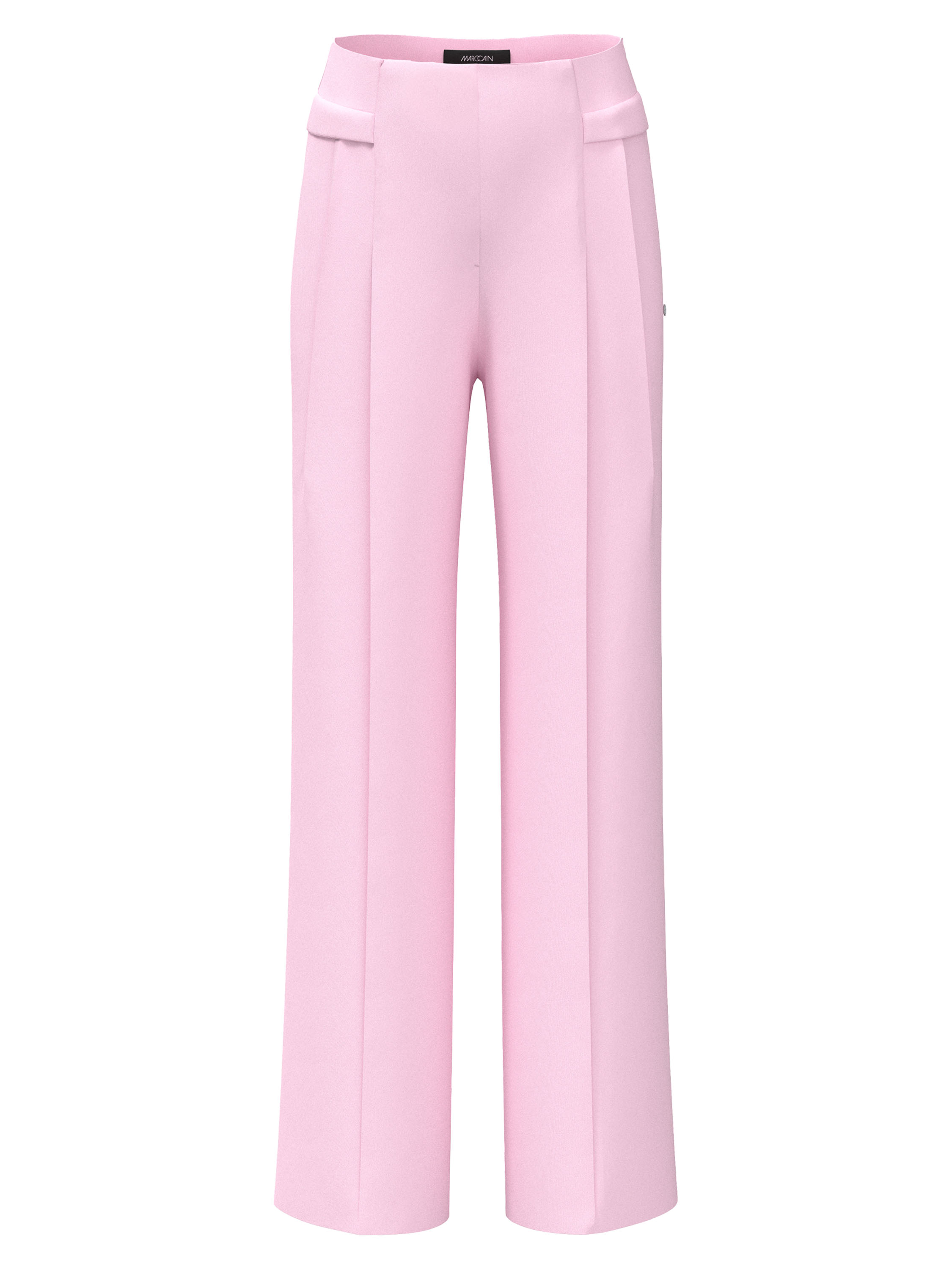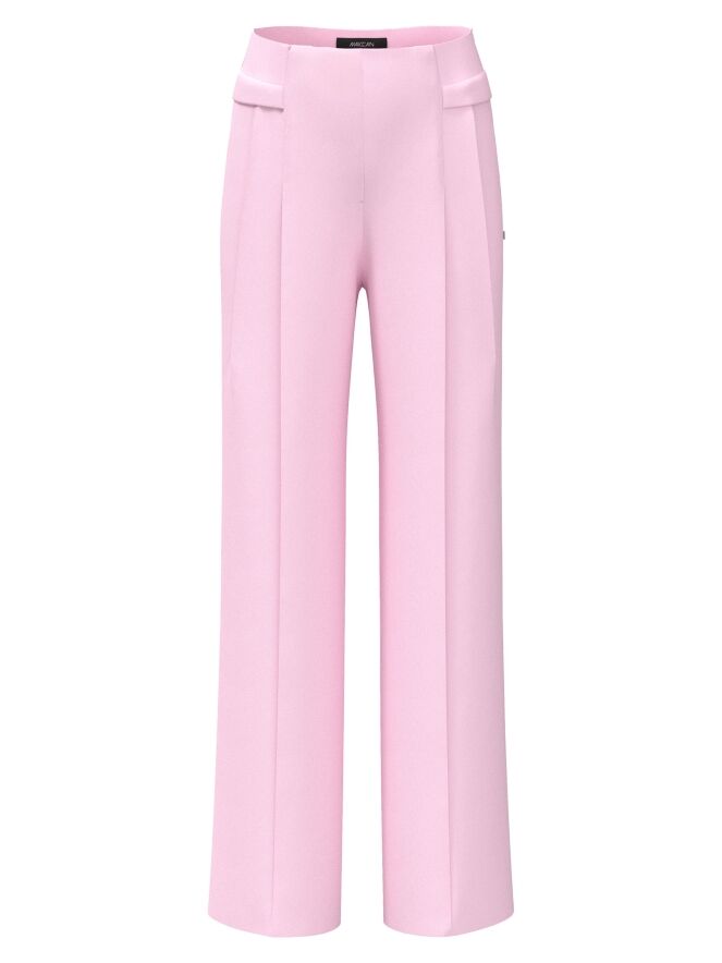 Eine Hose von Marc Cain in einem leuchtenden Rosaton. Beidseitig am Bund ist ein doppelter Bund verarbeitet, unter dem zwei Bundfalten liegen. In der Mitte der Hosenbeine verläuft eine eingepresste Falte. Die Hose verfügt über Seitentaschen und kan bei 30 Grad gewaschen werden.