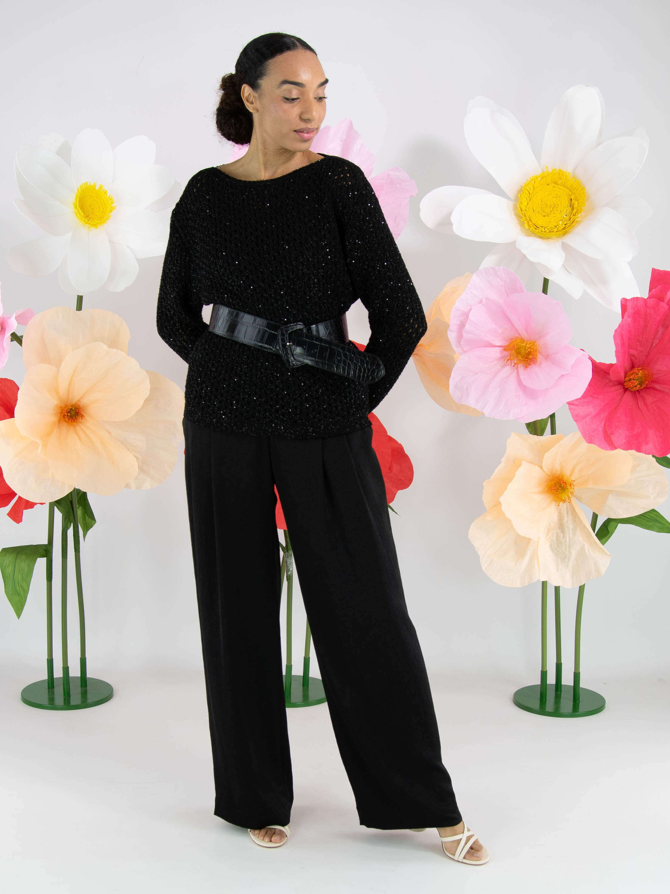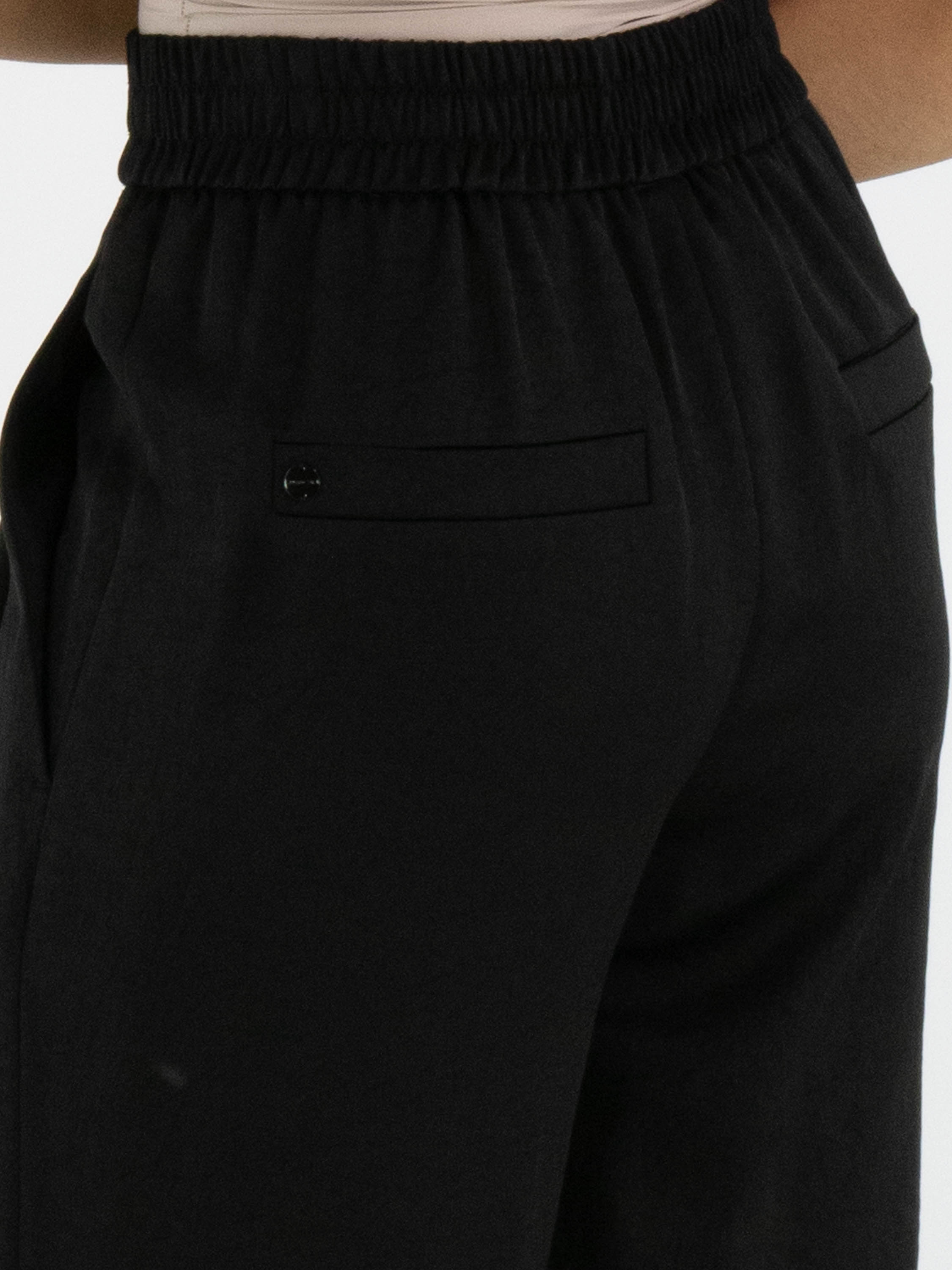 Eine Hose von Marc Cain in Schwarz. Der Stoff ist matt glänzend und in einem tonalen Reptilmuster gearbeitet. Von den Seiten bis zur Rückseite ist der Taillenbereich fein gelegt und elastisch. Vorderseitig befinden sich einige Falten, die zu den Außenseiten verlaufen. Die Hose hat Eingrifftaschen und kann bei 30 Grad gewaschen werden.